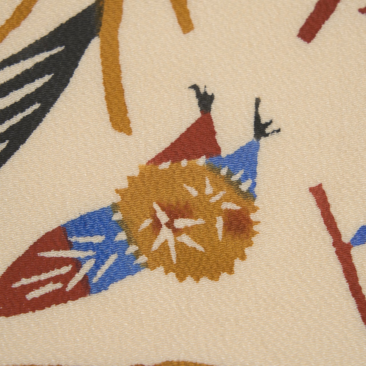 ひとつひとつのモチーフが切り絵のように素朴で可愛らしい表情となっていて、型絵染ならではの魅力にあふれた、とても素敵な大変おすすめの逸品です。