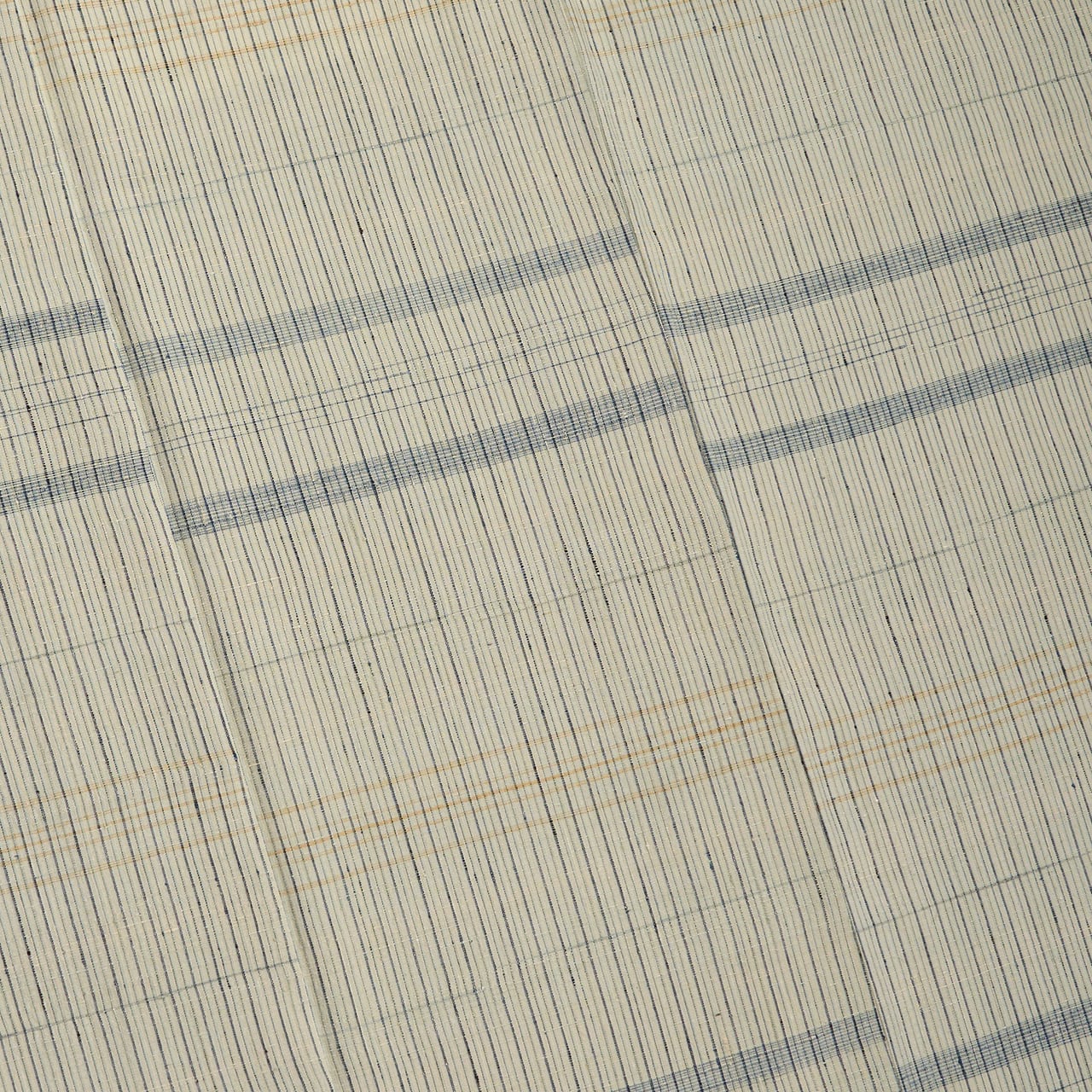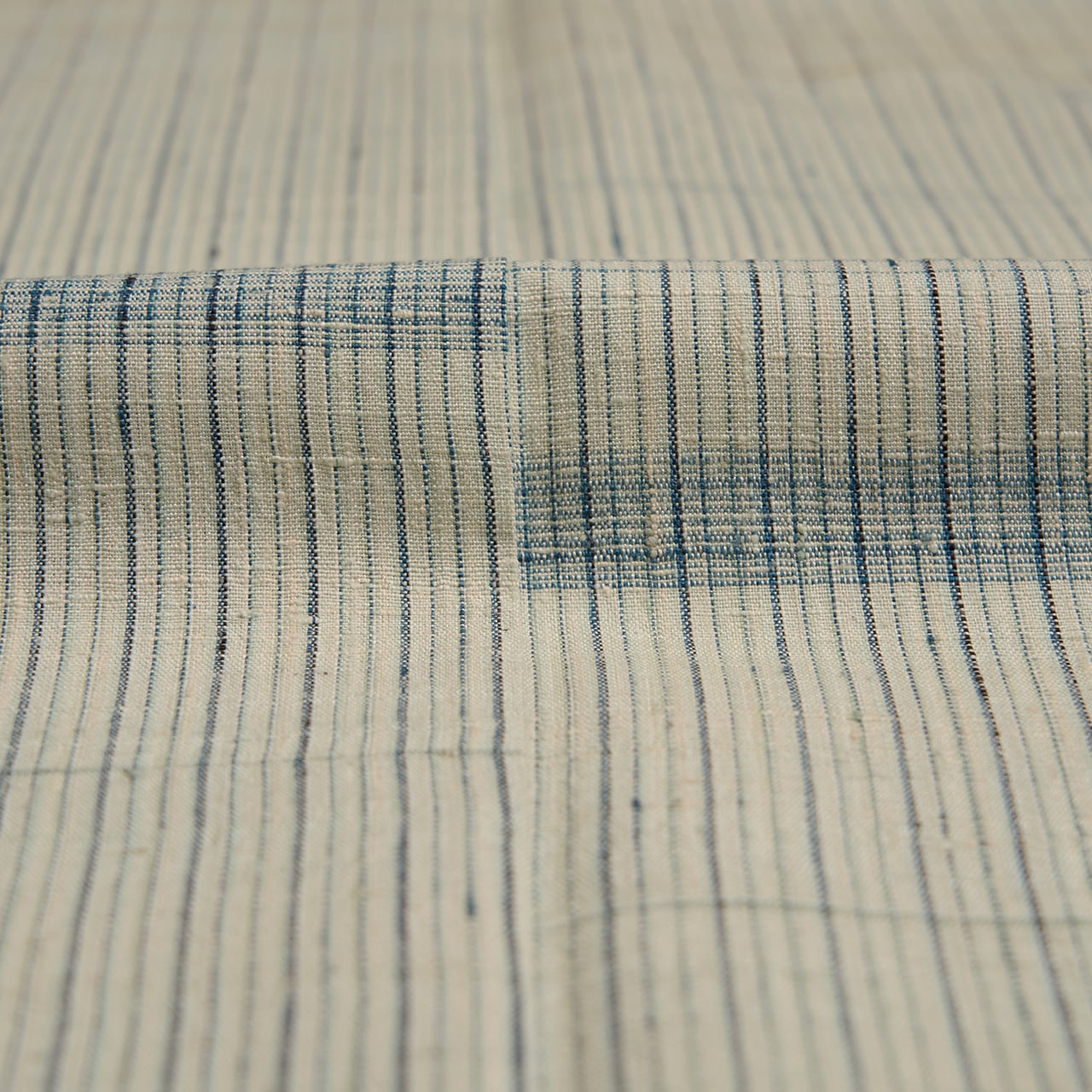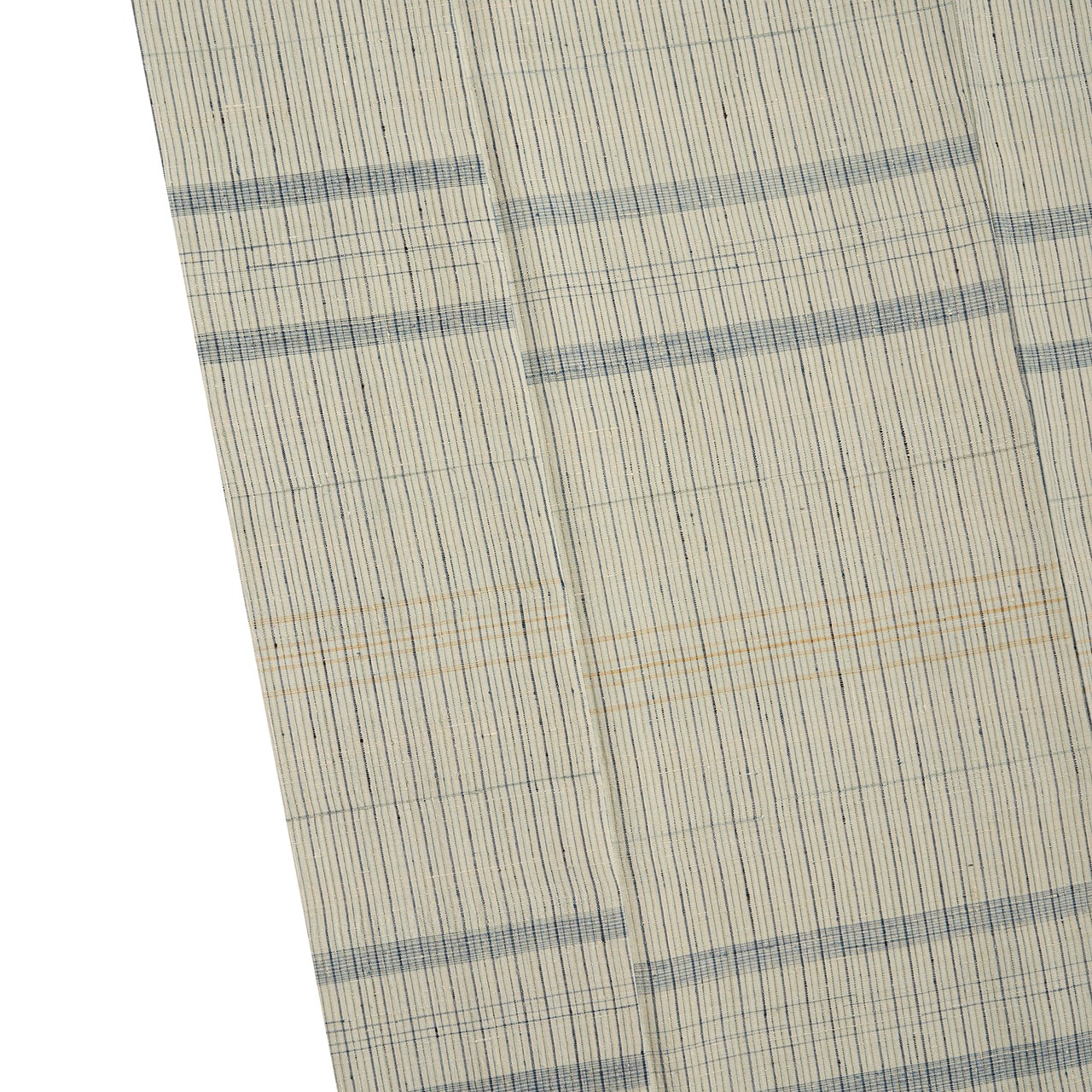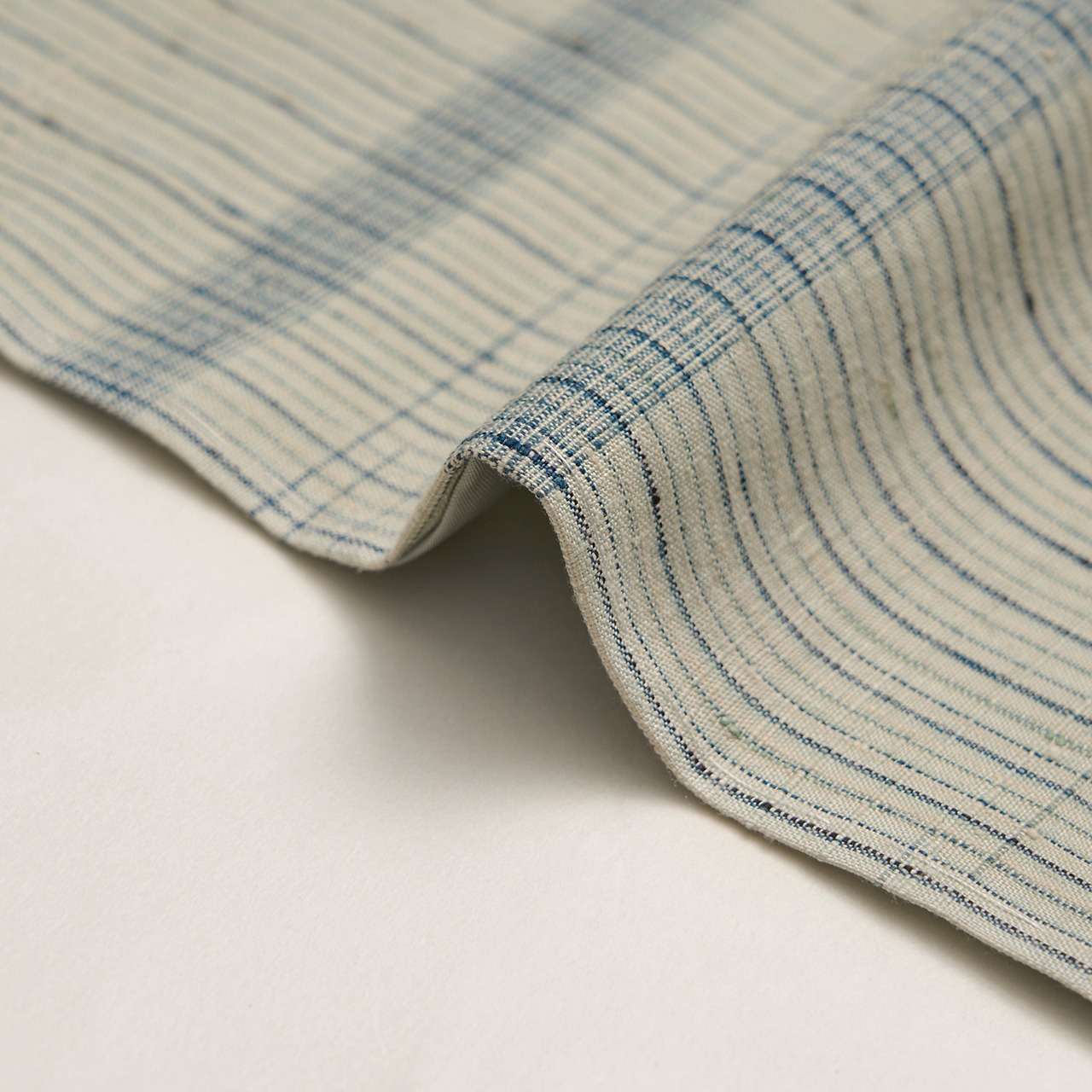 ふんわりとした白と少し青味のある白・白花色の地織りに、濃い藍色鉄紺色の縦縞が織られていますが、それに寄り添うように秘色色の淡い水色が並んでいたり、縞の間には舛花色の淡い藍色などが配置されていたり、ニュアンスのあるグラデーションのような味わいのある縞模様が表されています。