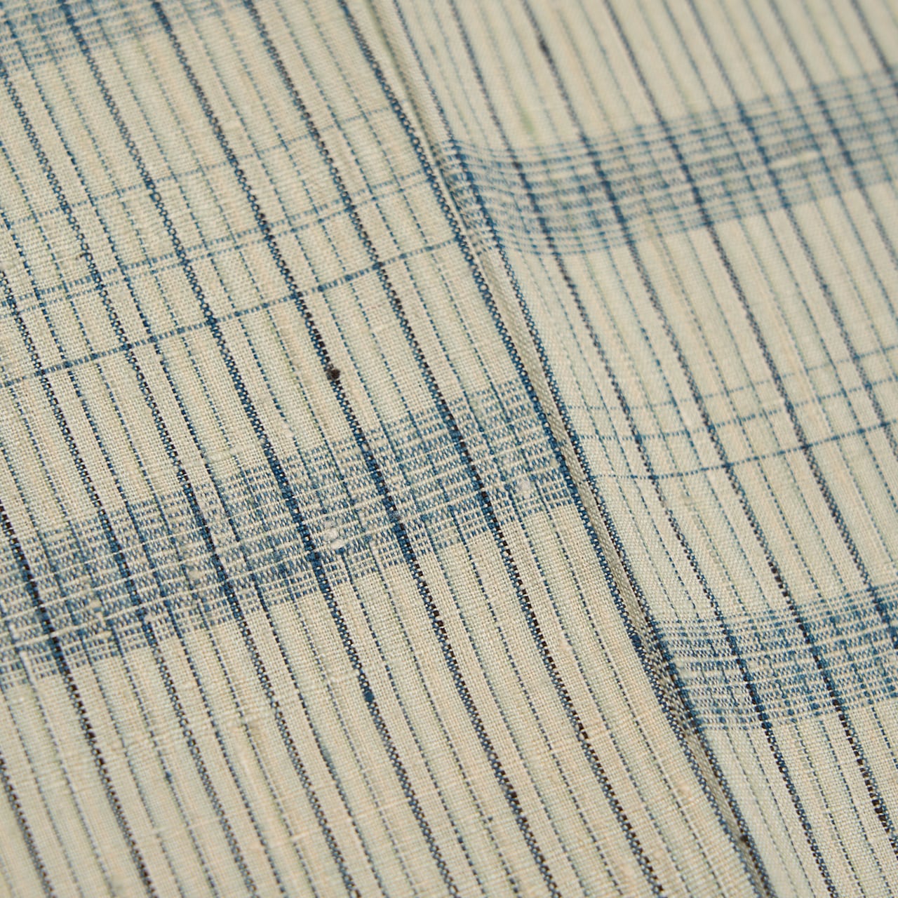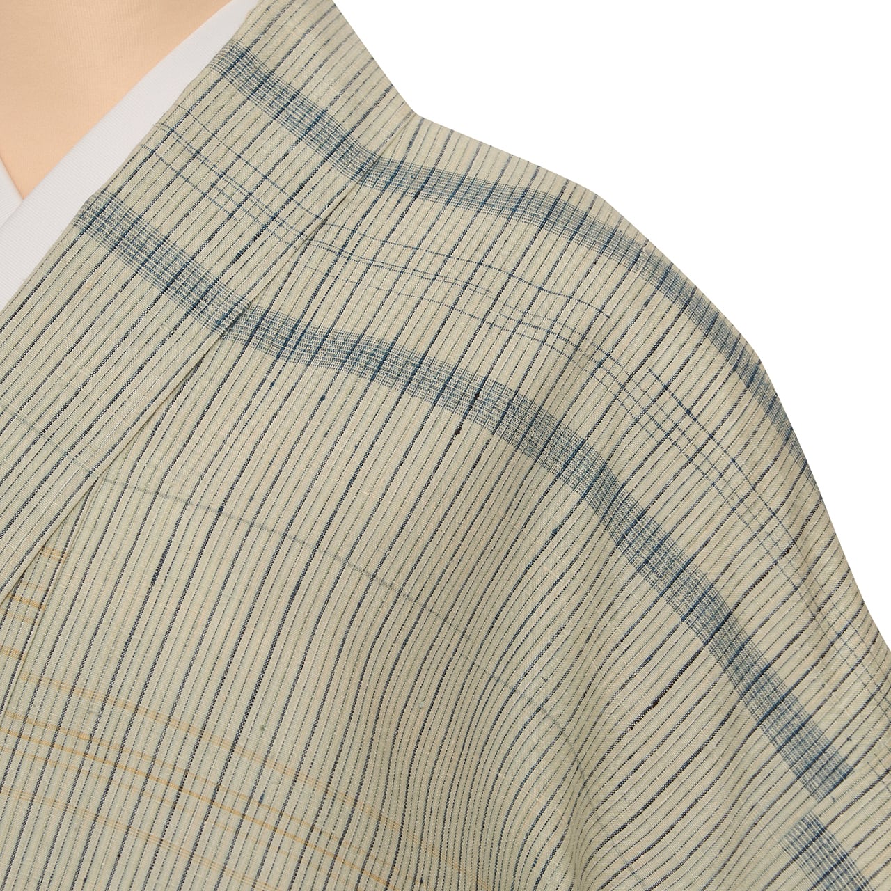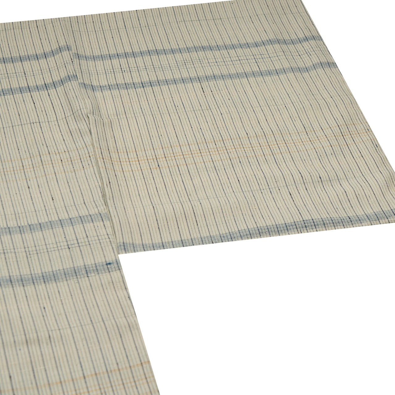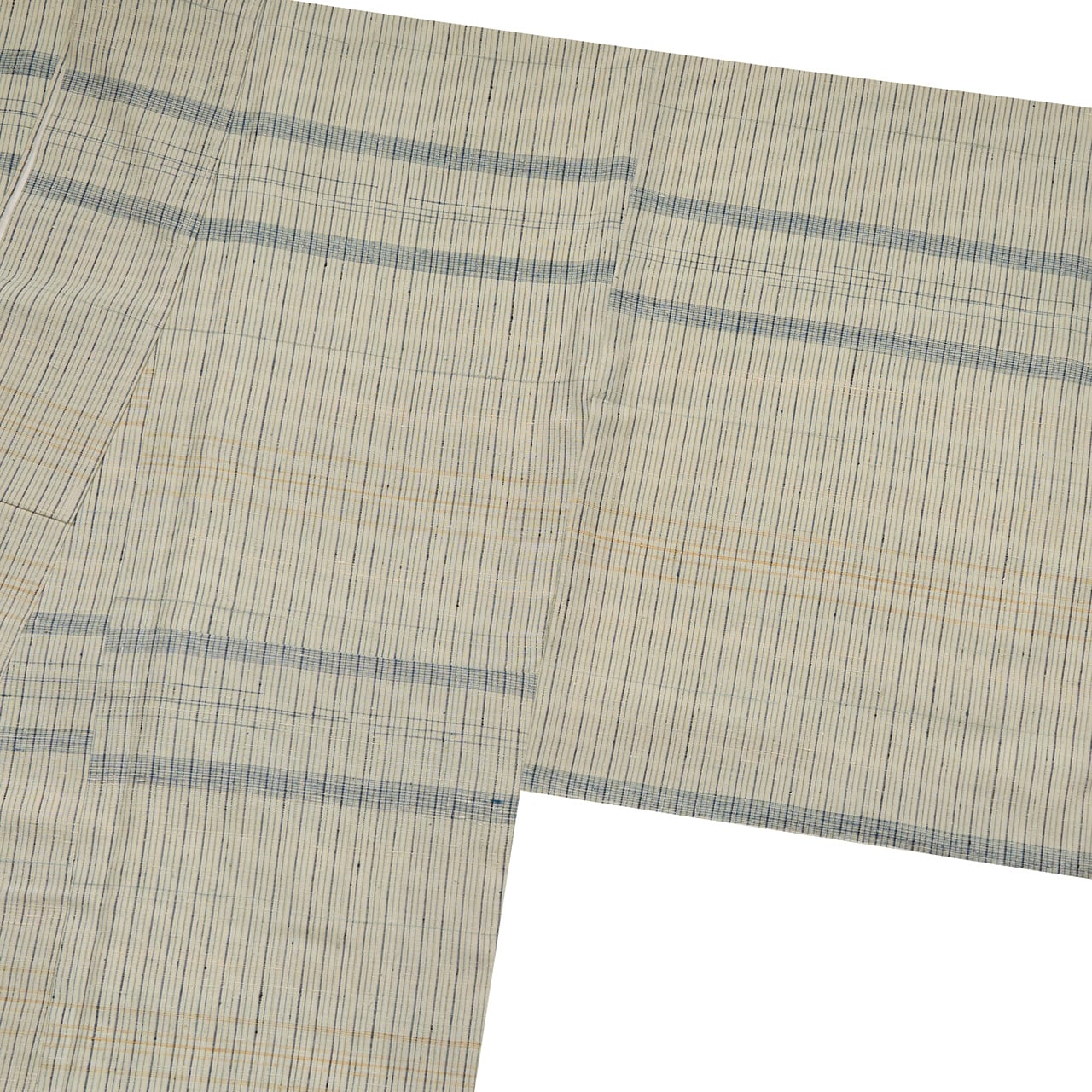 ふんわりとした白と少し青味のある白・白花色の地織りに、濃い藍色鉄紺色の縦縞が織られていますが、それに寄り添うように秘色色の淡い水色が並んでいたり、縞の間には舛花色の淡い藍色などが配置されていたり、ニュアンスのあるグラデーションのような味わいのある縞模様が表されています。