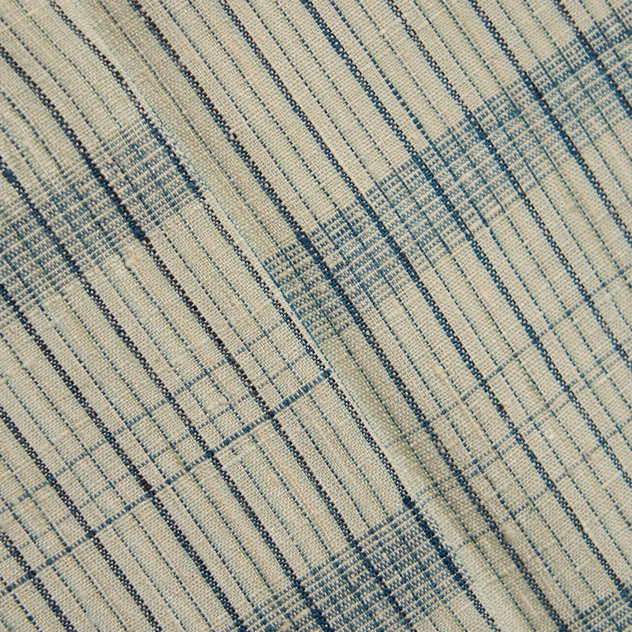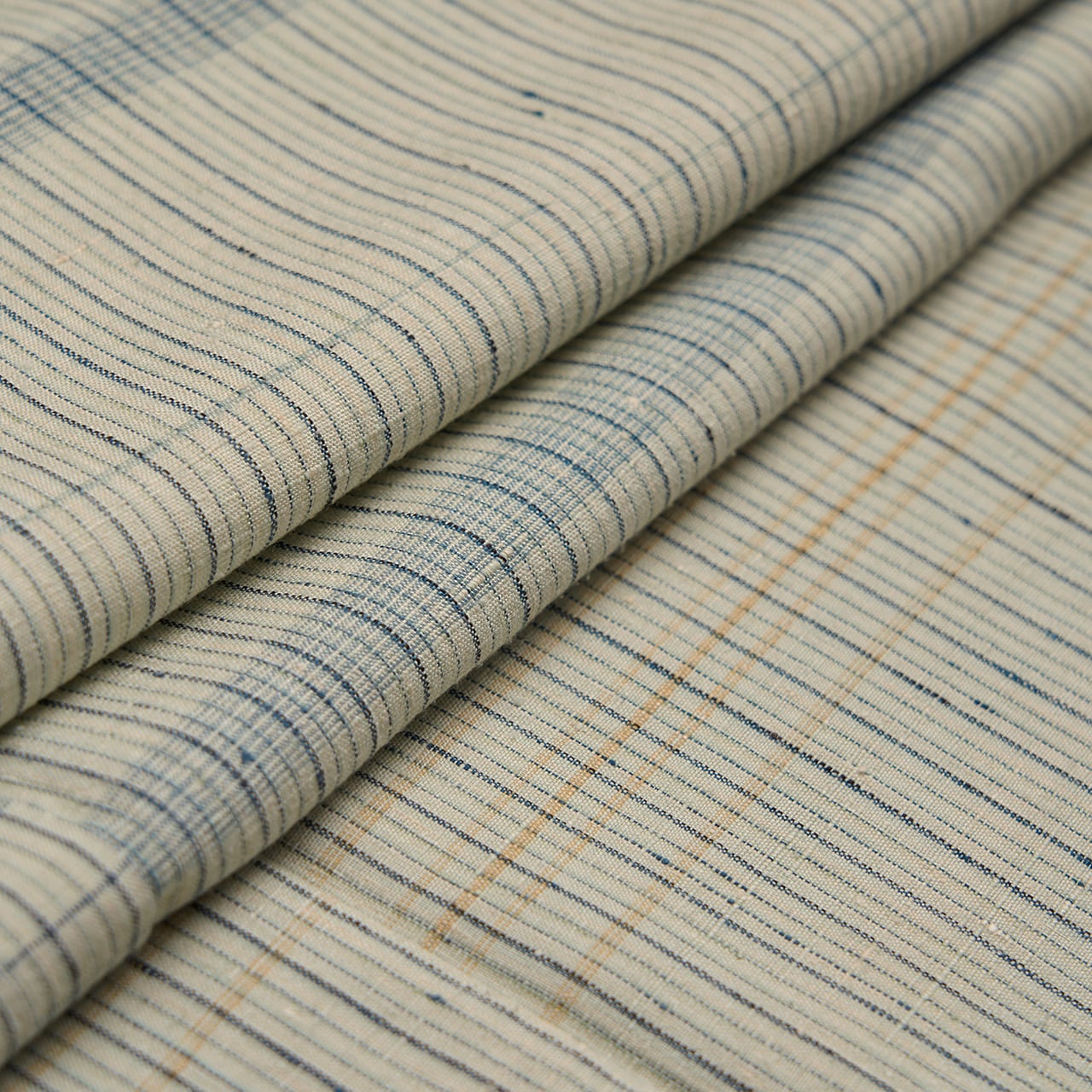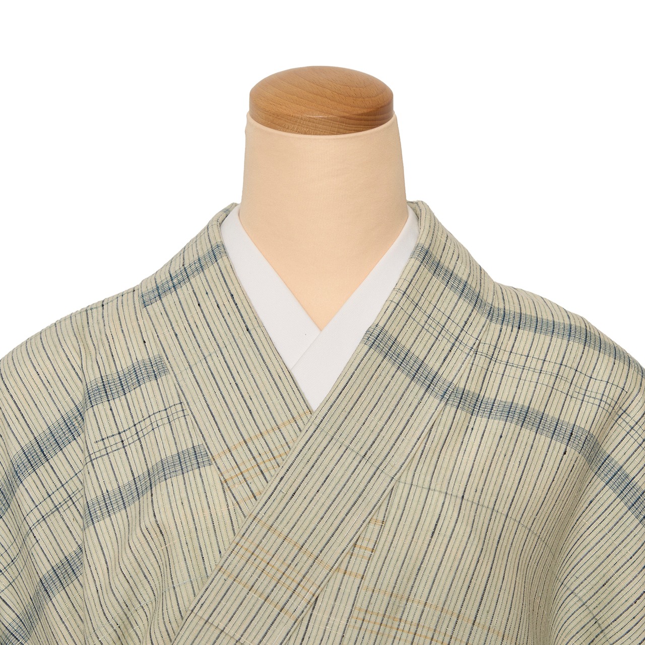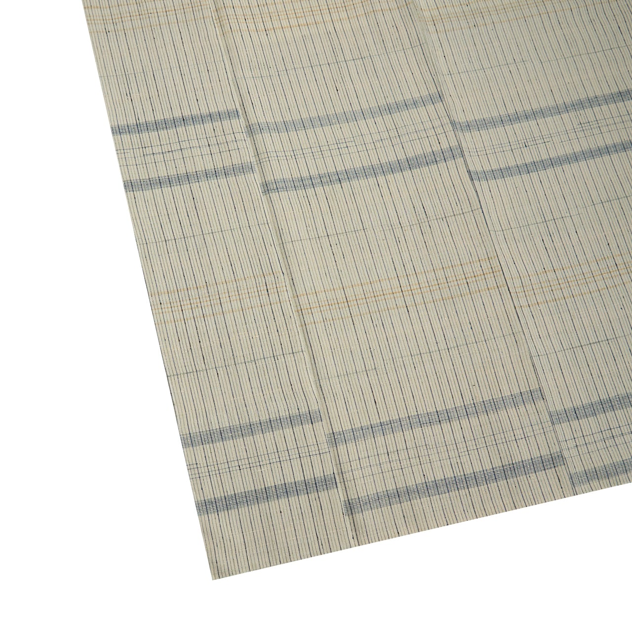 ふんわりとした白と少し青味のある白・白花色の地織りに、濃い藍色鉄紺色の縦縞が織られていますが、それに寄り添うように秘色色の淡い水色が並んでいたり、縞の間には舛花色の淡い藍色などが配置されていたり、ニュアンスのあるグラデーションのような味わいのある縞模様が表されています。