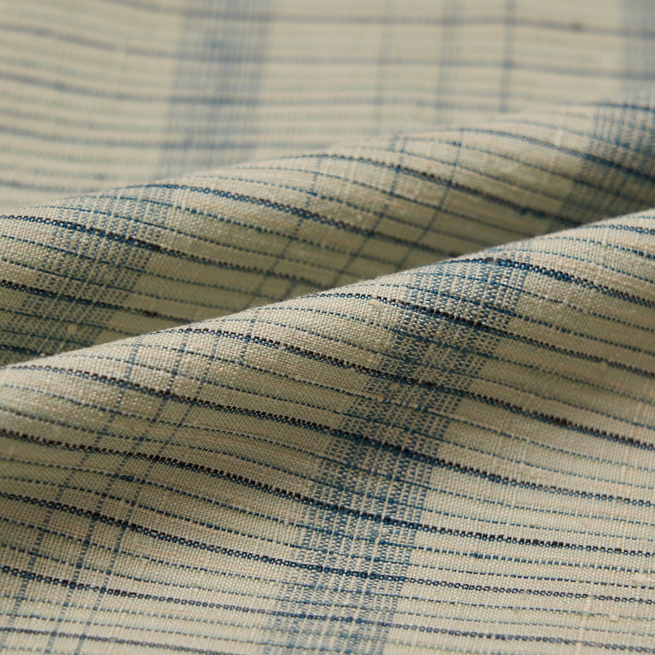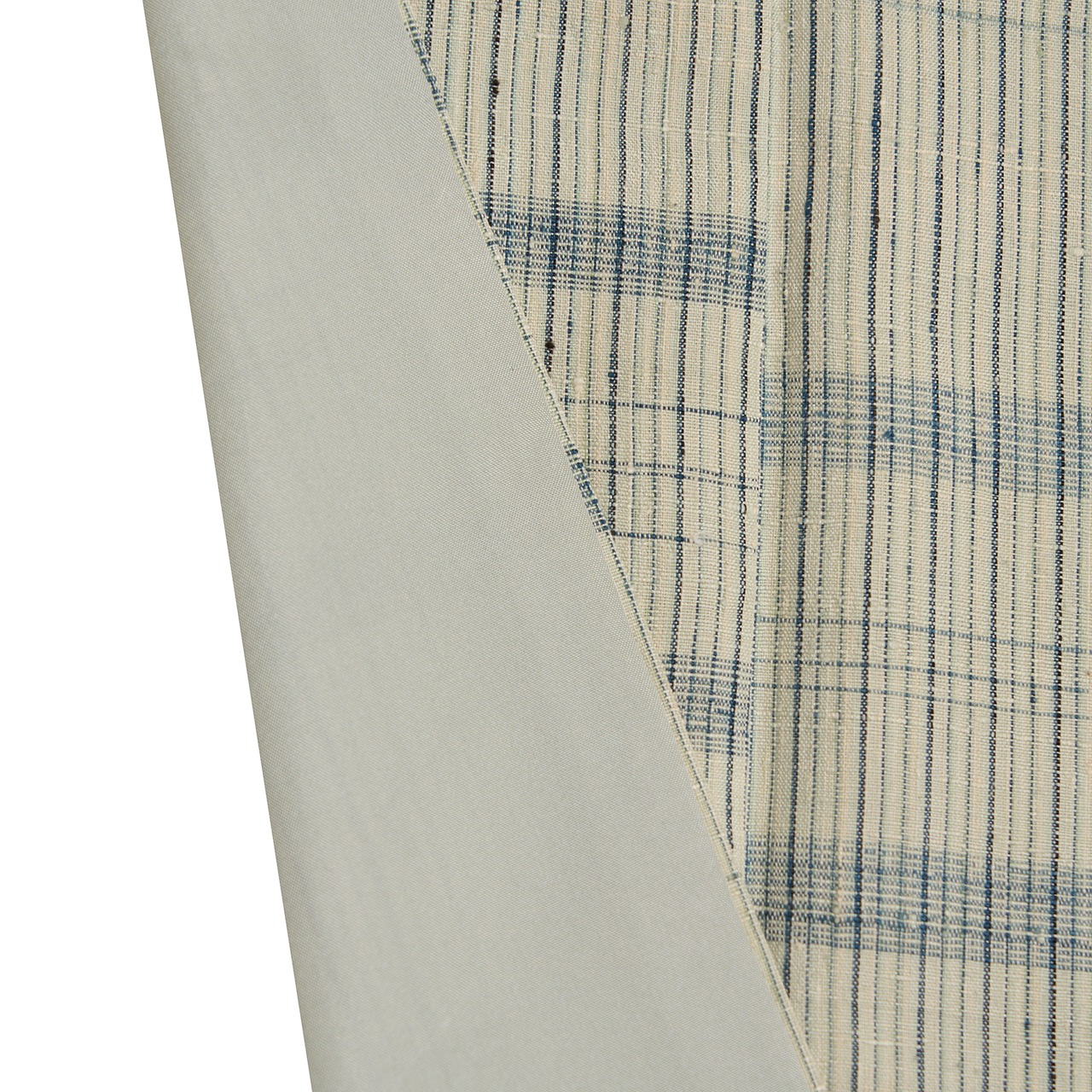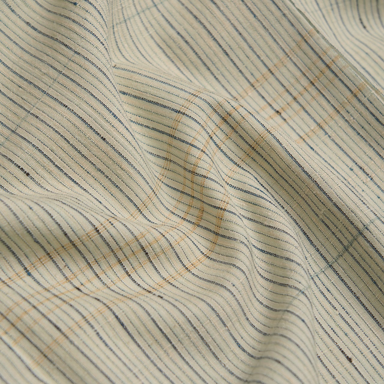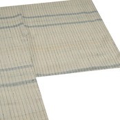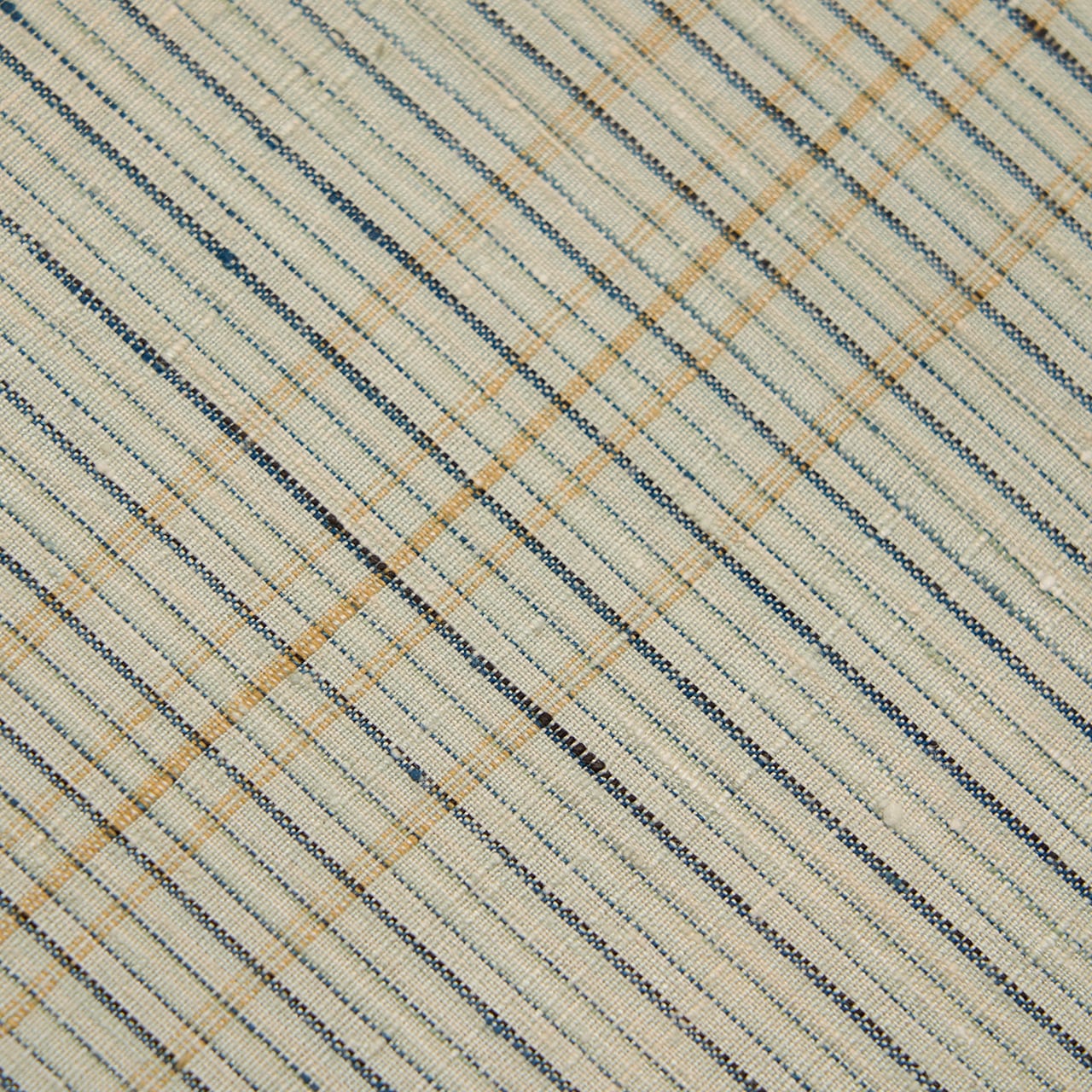 ふんわりとした白と少し青味のある白・白花色の地織りに、濃い藍色鉄紺色の縦縞が織られていますが、それに寄り添うように秘色色の淡い水色が並んでいたり、縞の間には舛花色の淡い藍色などが配置されていたり、ニュアンスのあるグラデーションのような味わいのある縞模様が表されています。