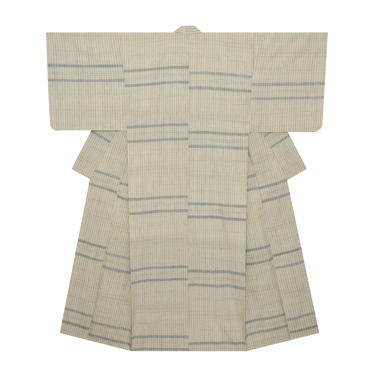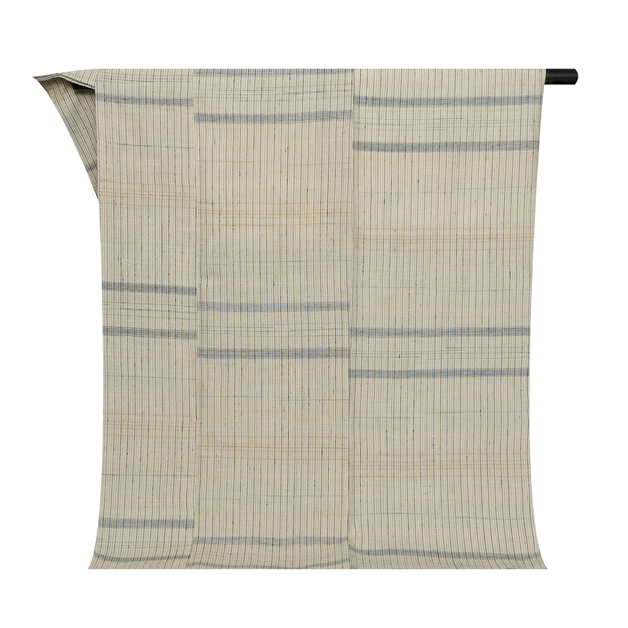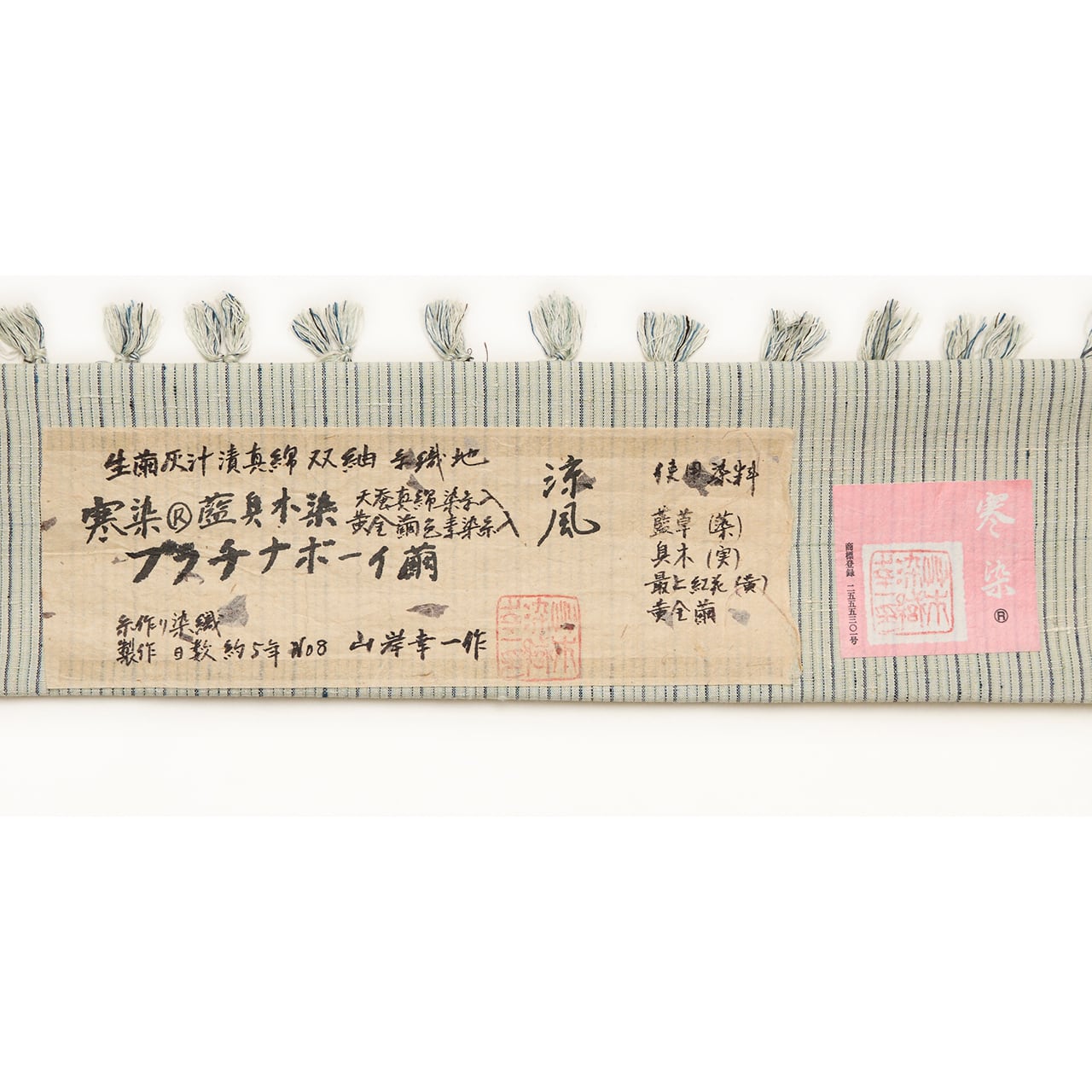 その綺麗な縦縞に交差するように、少し濃い藍・青碧色の段がやや太く織り込まれて絵羽附けのように並び、段の間には少し明るい藍・水浅葱色や紅花で染められた白茶色の糸がランダムに織り込まれ、変化のある表情となった、山岸幸一さんのとても素晴らしい作品です。