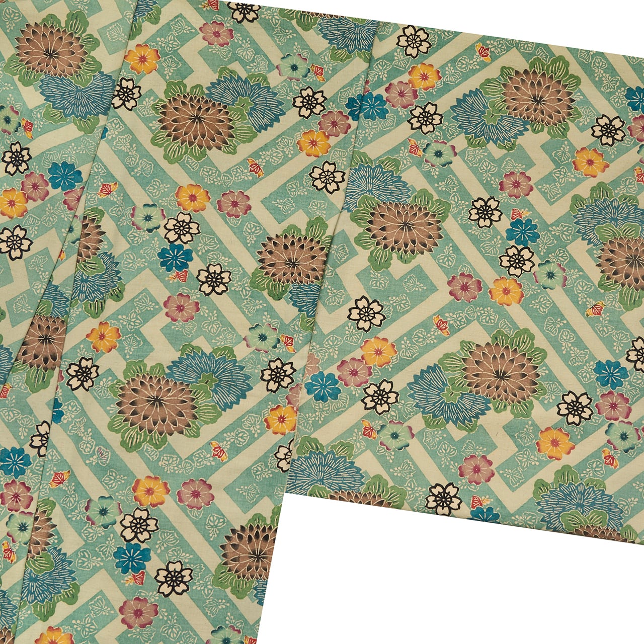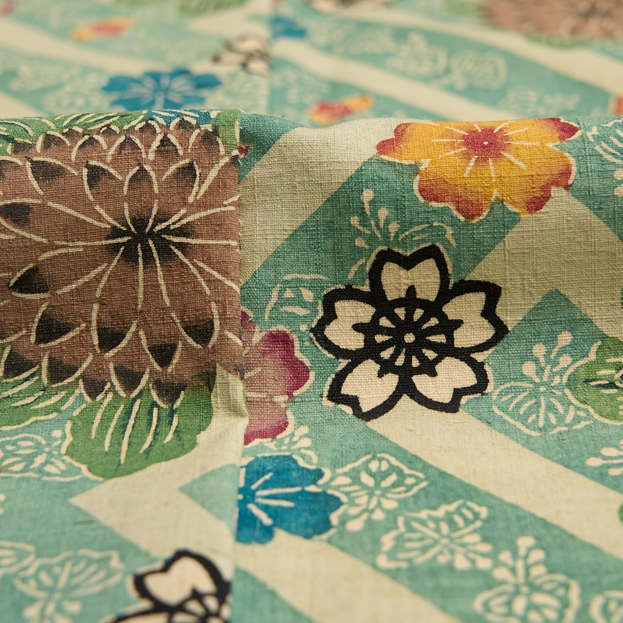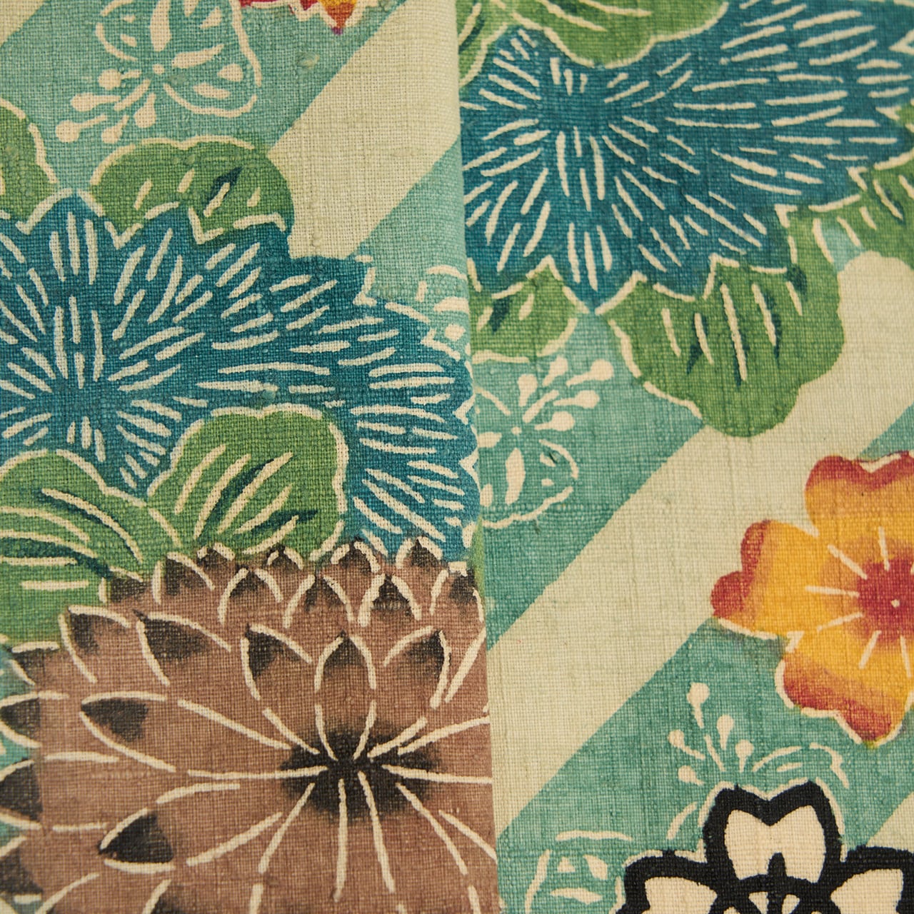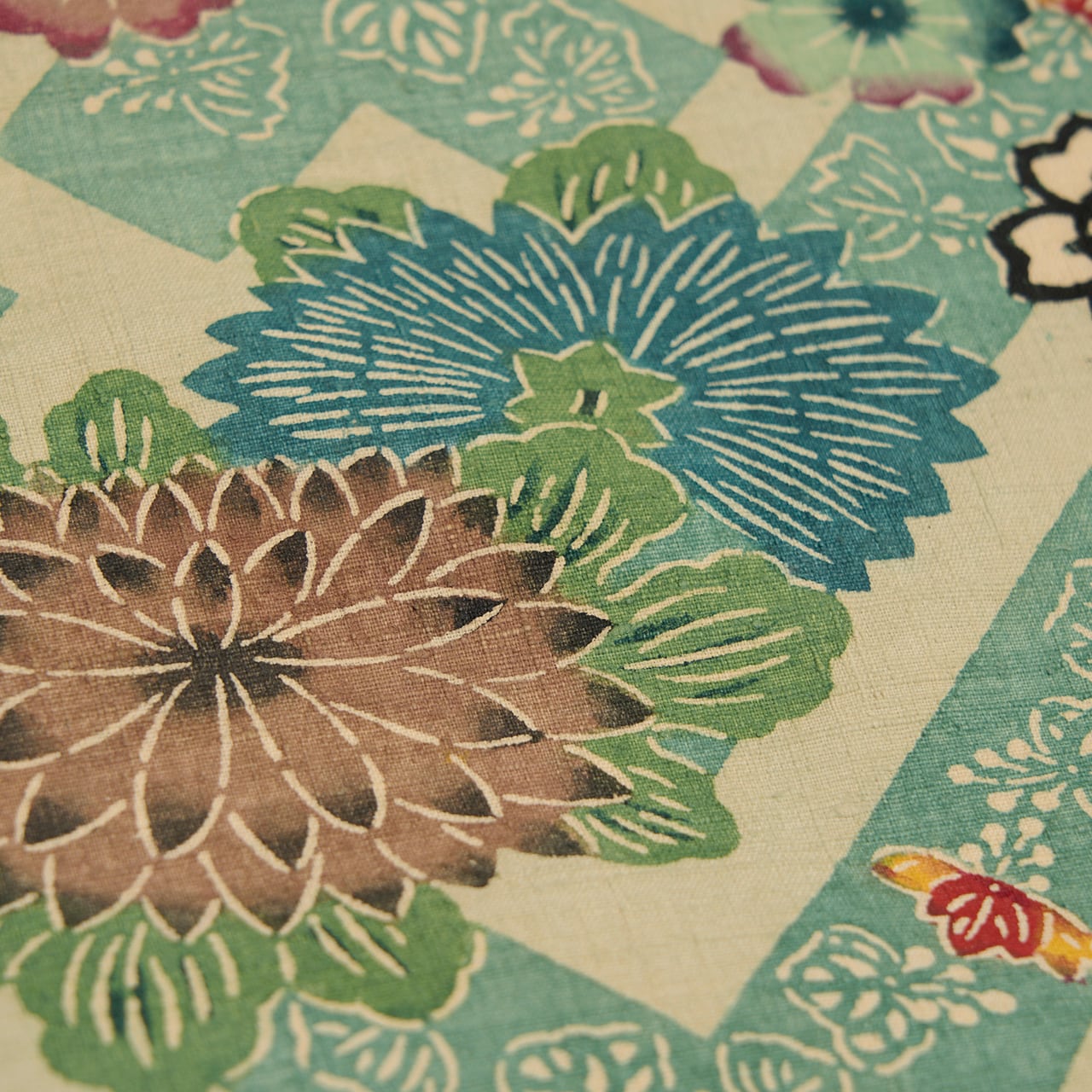 それを背景にして、上の層には大きな菊のお花が置かれ、そのまわりに桜のお花が色とりどりに染められて散らされた、とても爽やかな色使いの、素晴らしい型絵染のお着物地です。