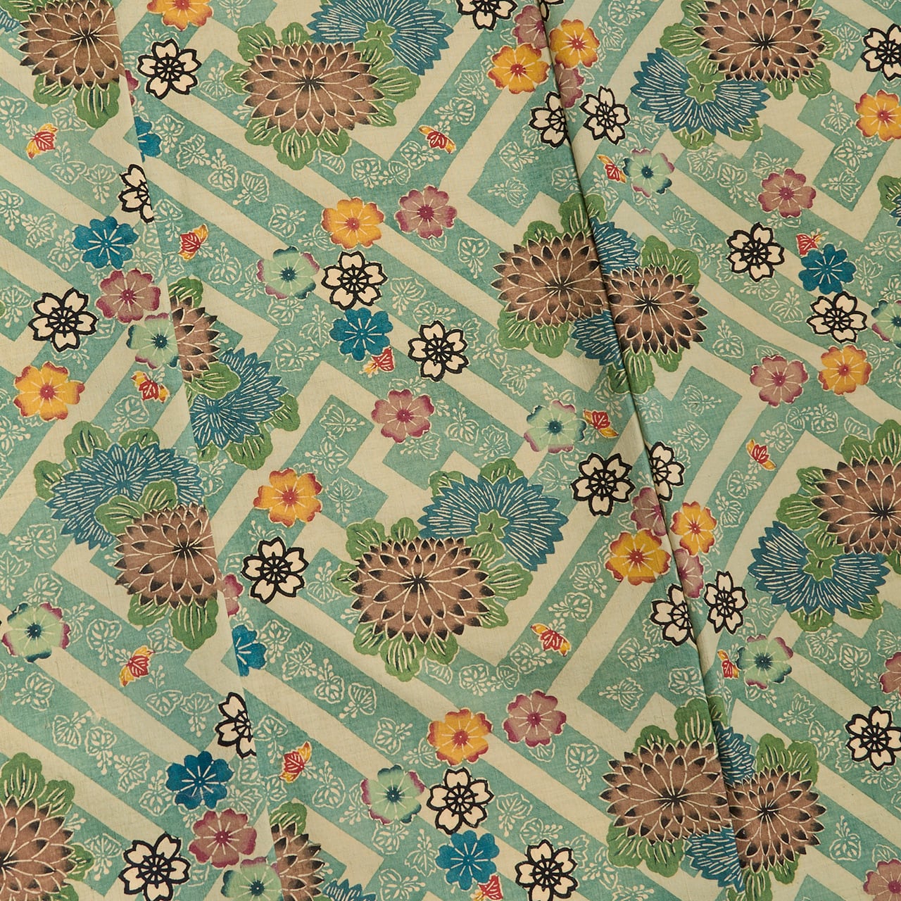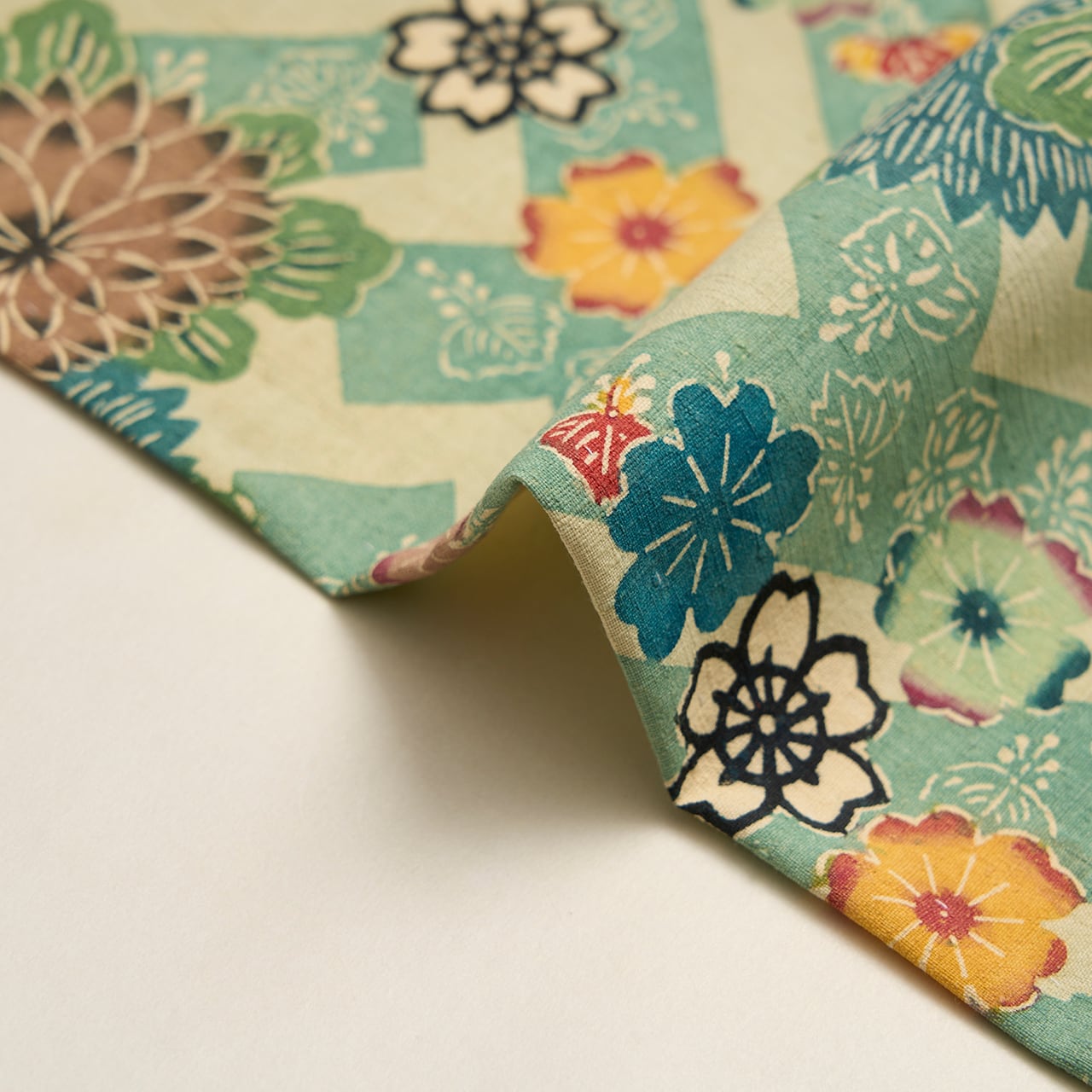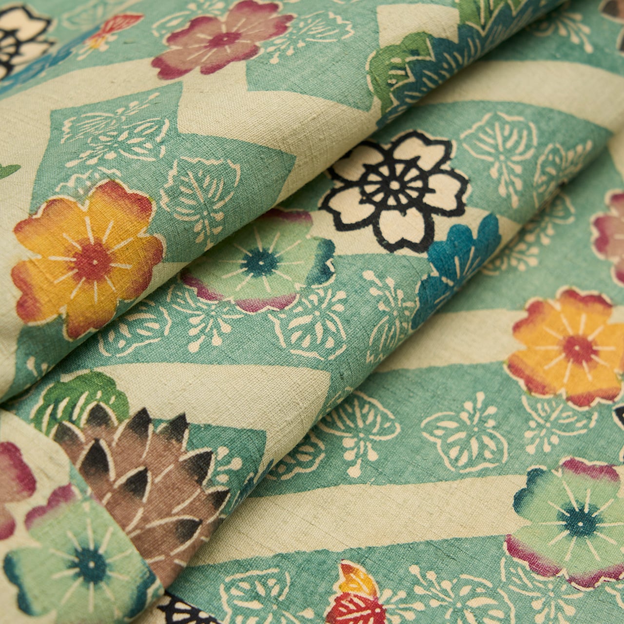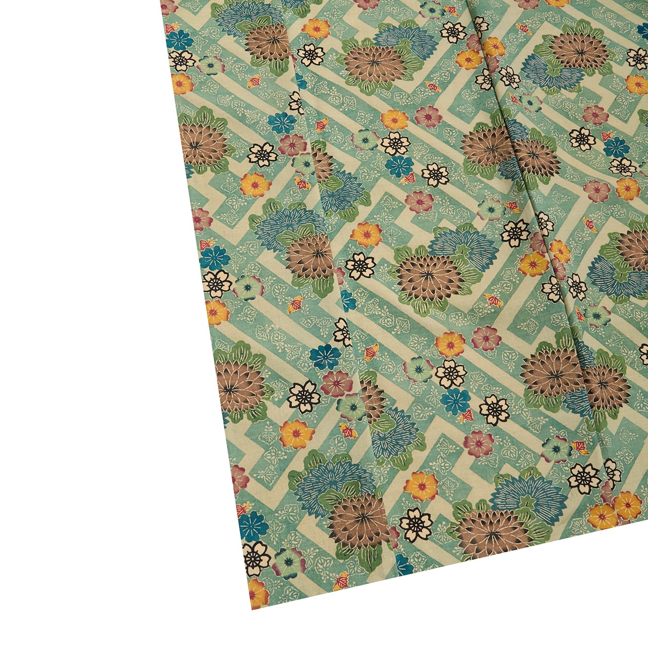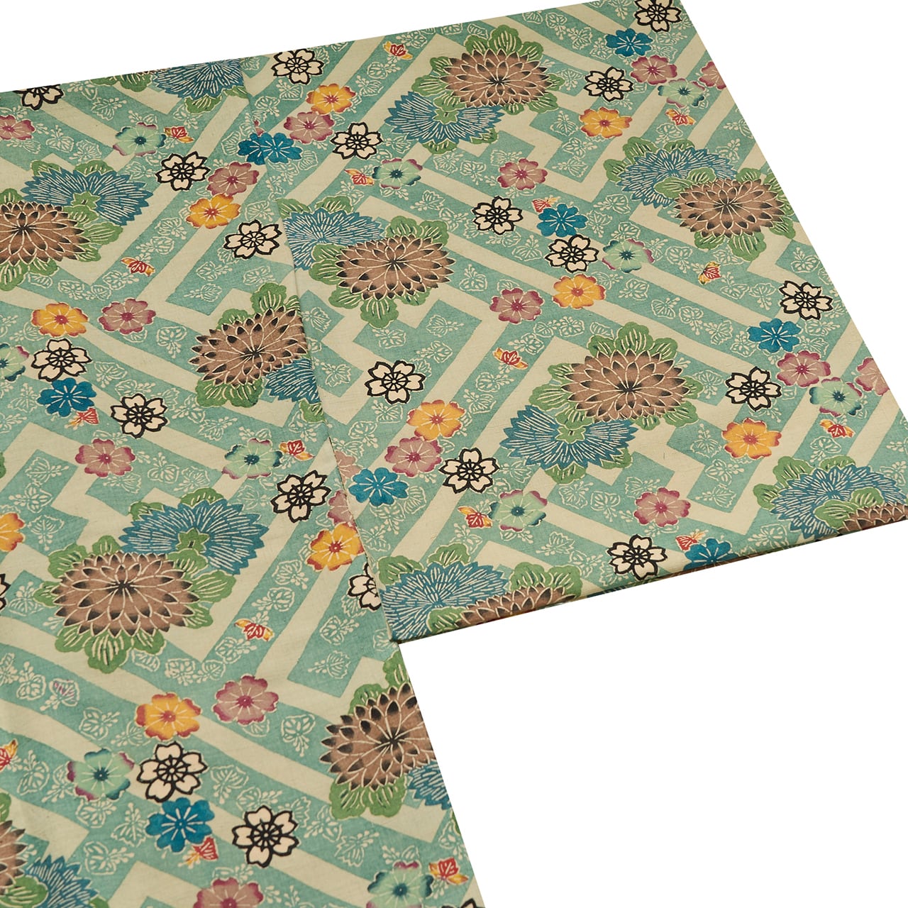 それを背景にして、上の層には大きな菊のお花が置かれ、そのまわりに桜のお花が色とりどりに染められて散らされた、とても爽やかな色使いの、素晴らしい型絵染のお着物地です。