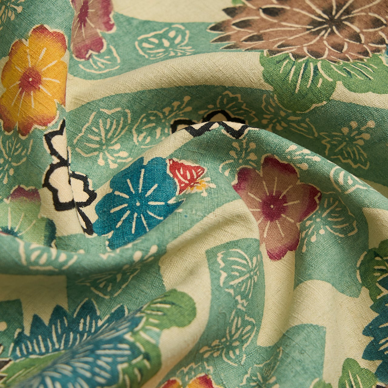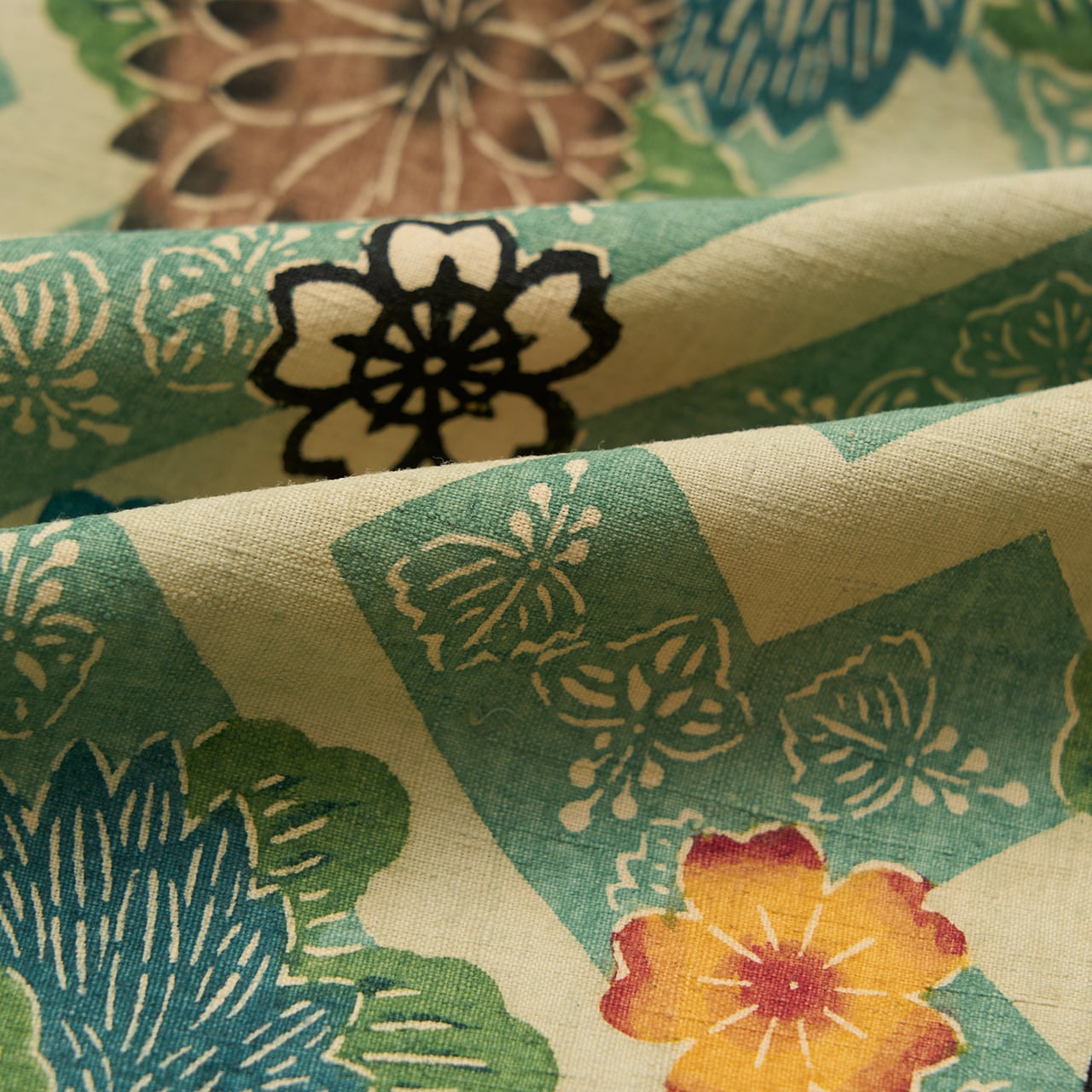 琉球紅型の流れを汲んだオリジナルの技法で染められていますが、菊や桜のお花には紅型の特徴でもある隈取りの暈しが施されているのも、味わいがあってとても素敵だと思います。