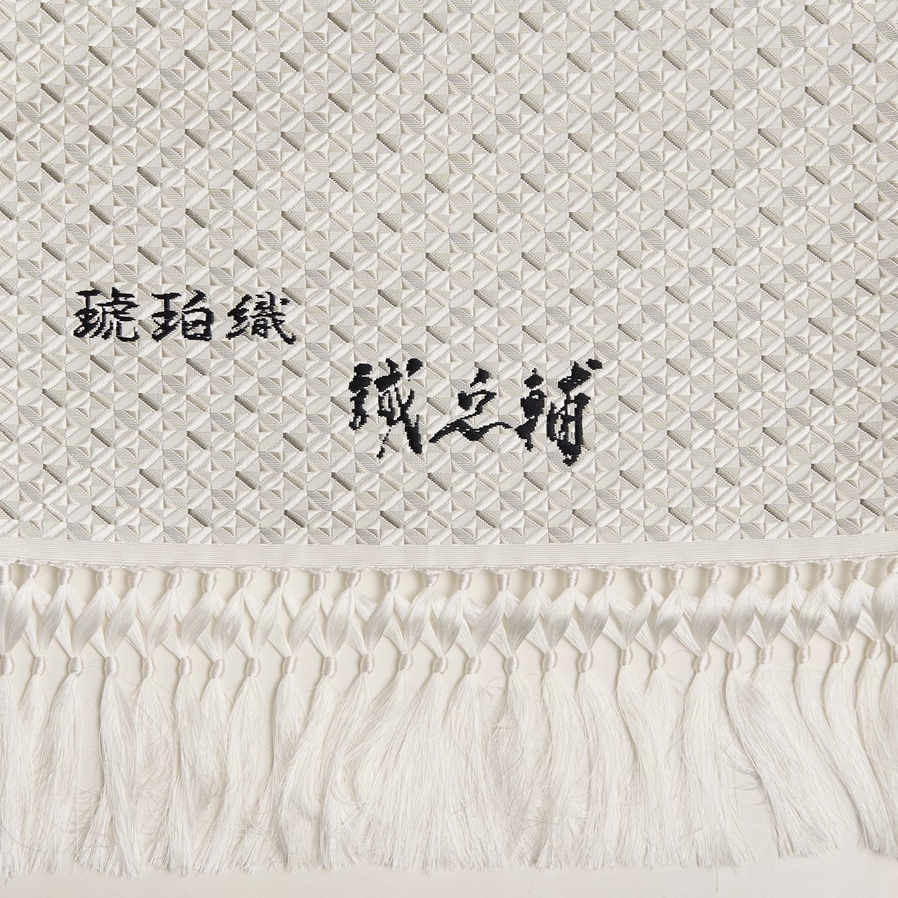 小さな菱重ねの模様がびっしりと並び、菱の中には十字の形が織り込まれ、とても立体的に見える不思議な模様の織りとなっています。