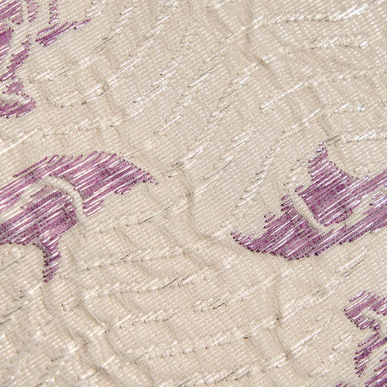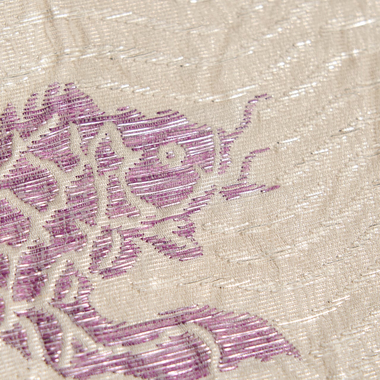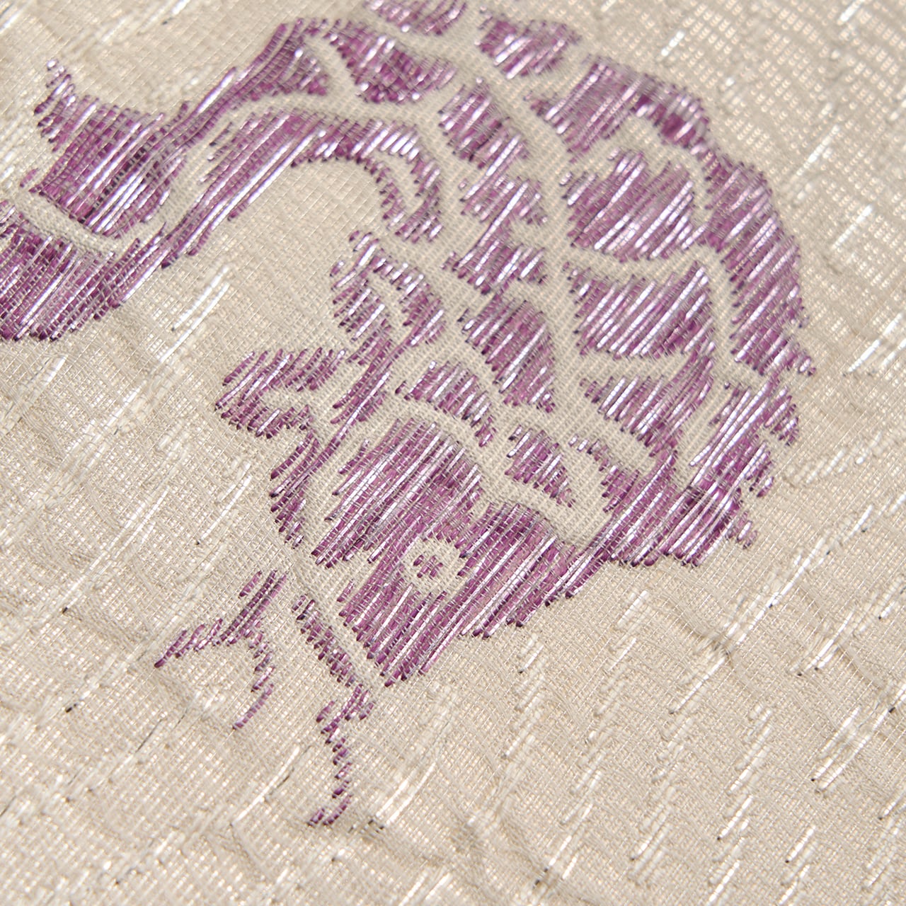 たとう紙には、貝紫に関して大変造詣の深い吉岡常雄さんの監修と書かれていますので、名物裂の文様をこの色使いと大きさで表されることを提案されたのだと思いますが、白と紫のコントラストも美しく、冴え冴えとしたとてもお洒落な帯となっています。