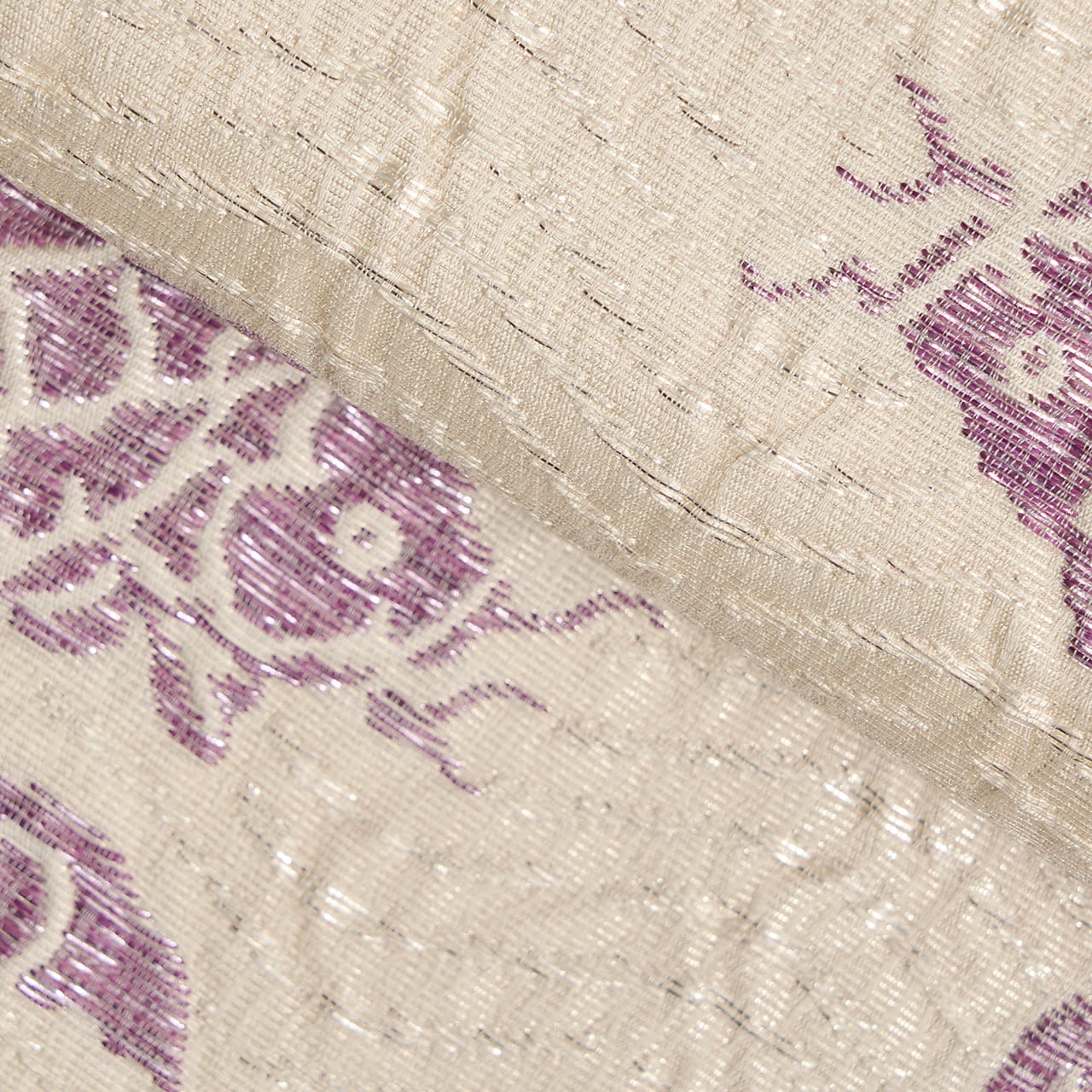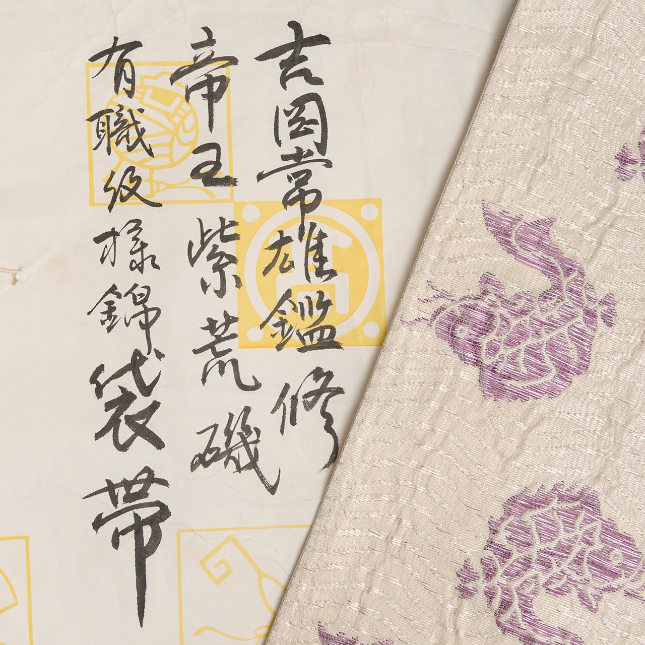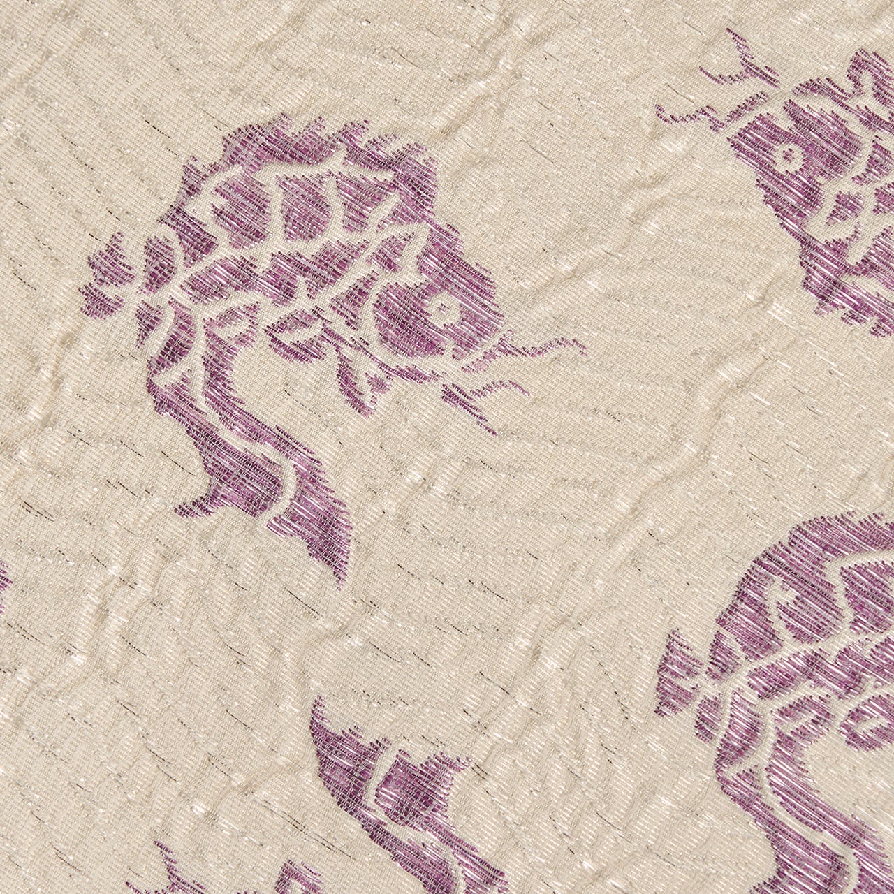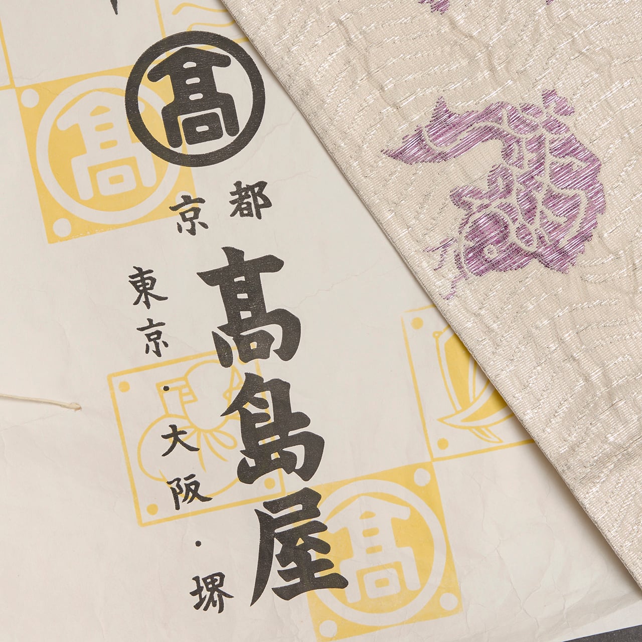 たとう紙には、貝紫に関して大変造詣の深い吉岡常雄さんの監修と書かれていますので、名物裂の文様をこの色使いと大きさで表されることを提案されたのだと思いますが、白と紫のコントラストも美しく、冴え冴えとしたとてもお洒落な帯となっています。