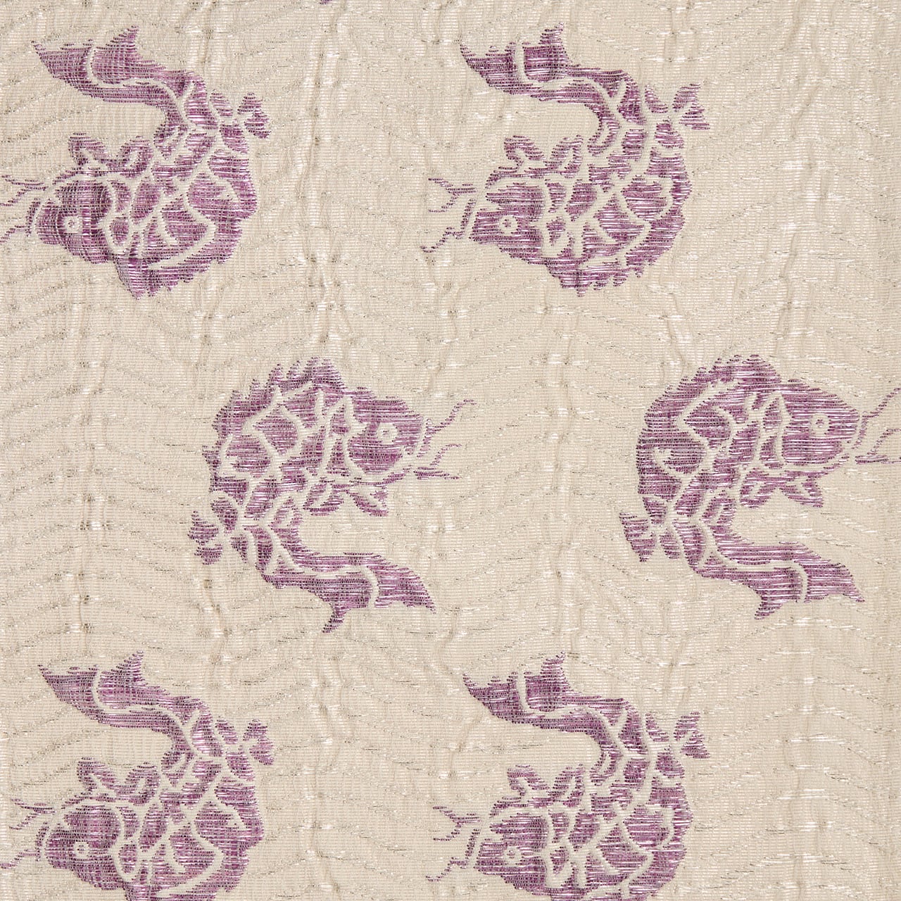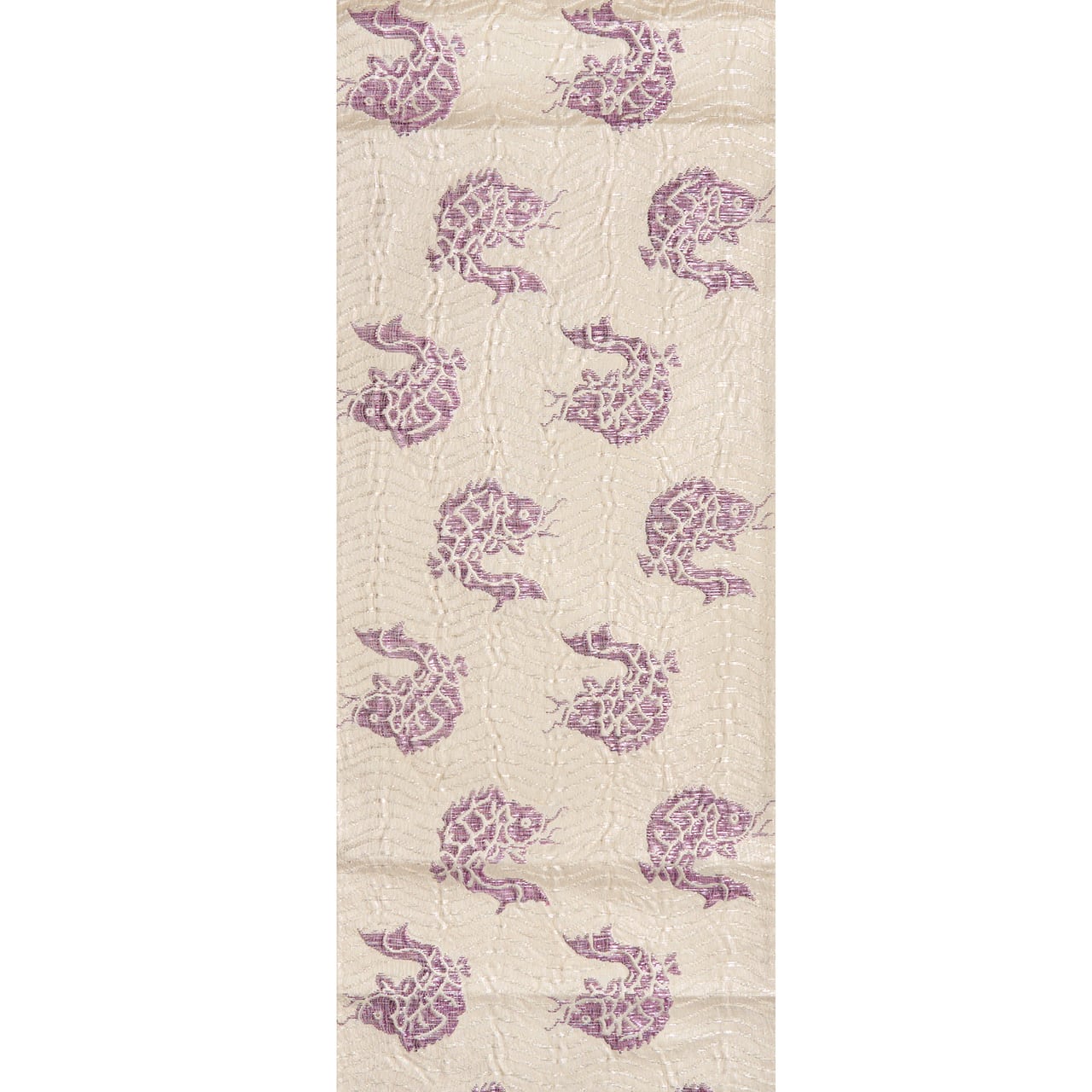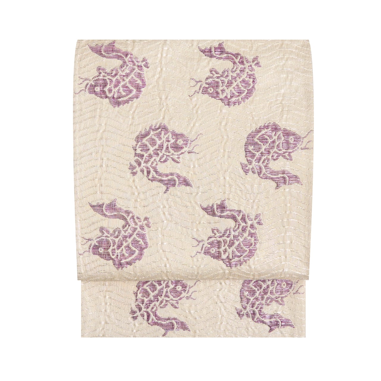 象牙色の少しふんわりとした質感の織りの地に、白と銀の極細の箔の糸で波の模様が織り出され、そこに躍動感のある姿の魚が貝紫の綺麗な紫・暗紅色で織り出された、名物裂の荒磯文様の、じゅらくさんの帝王紫ブランドの格調高さのある袋帯です。