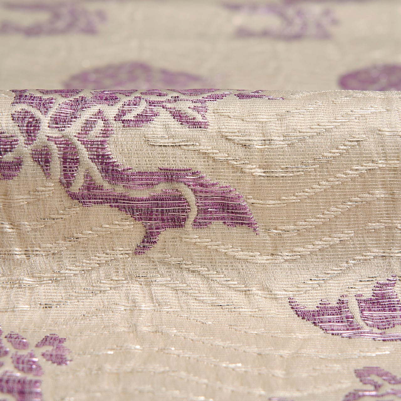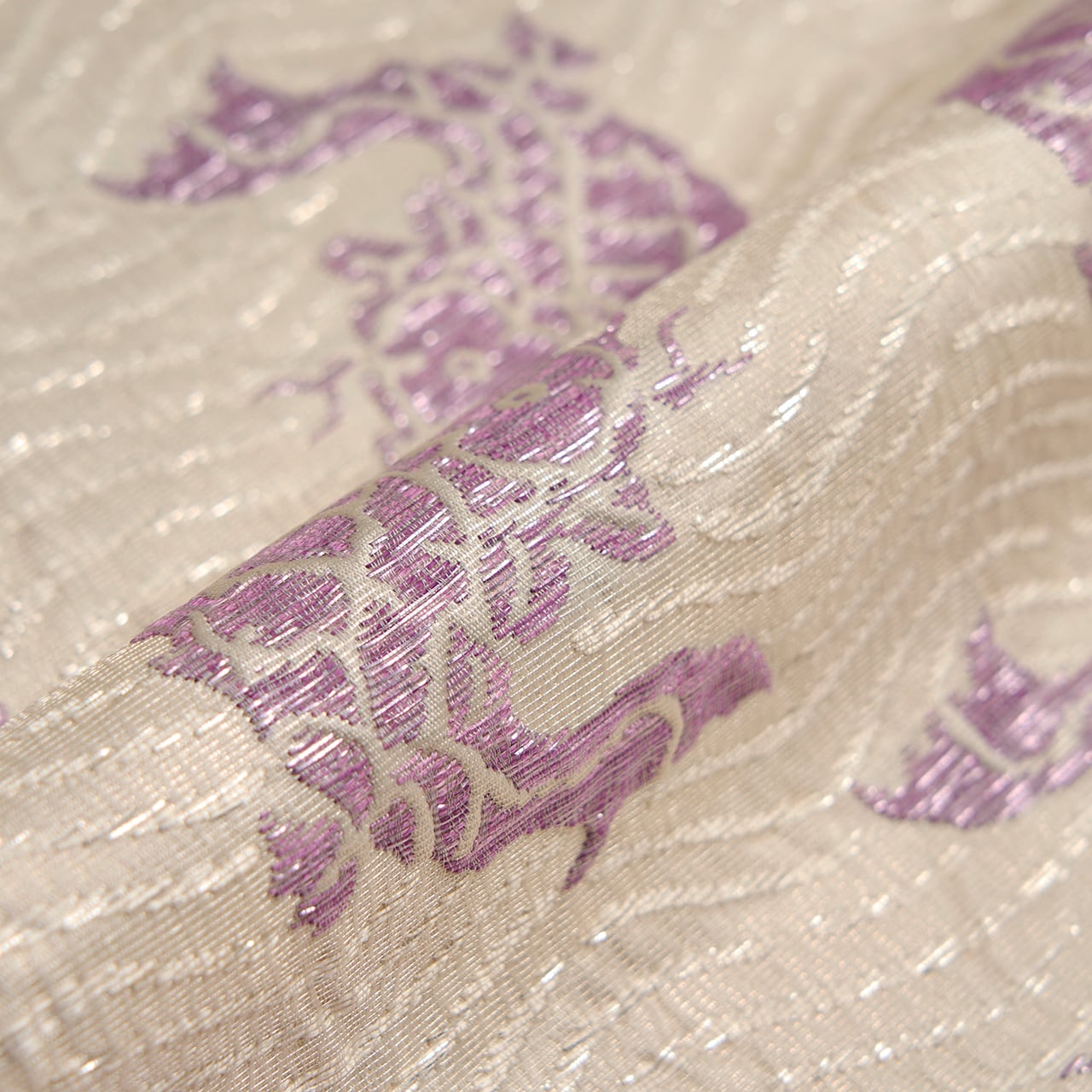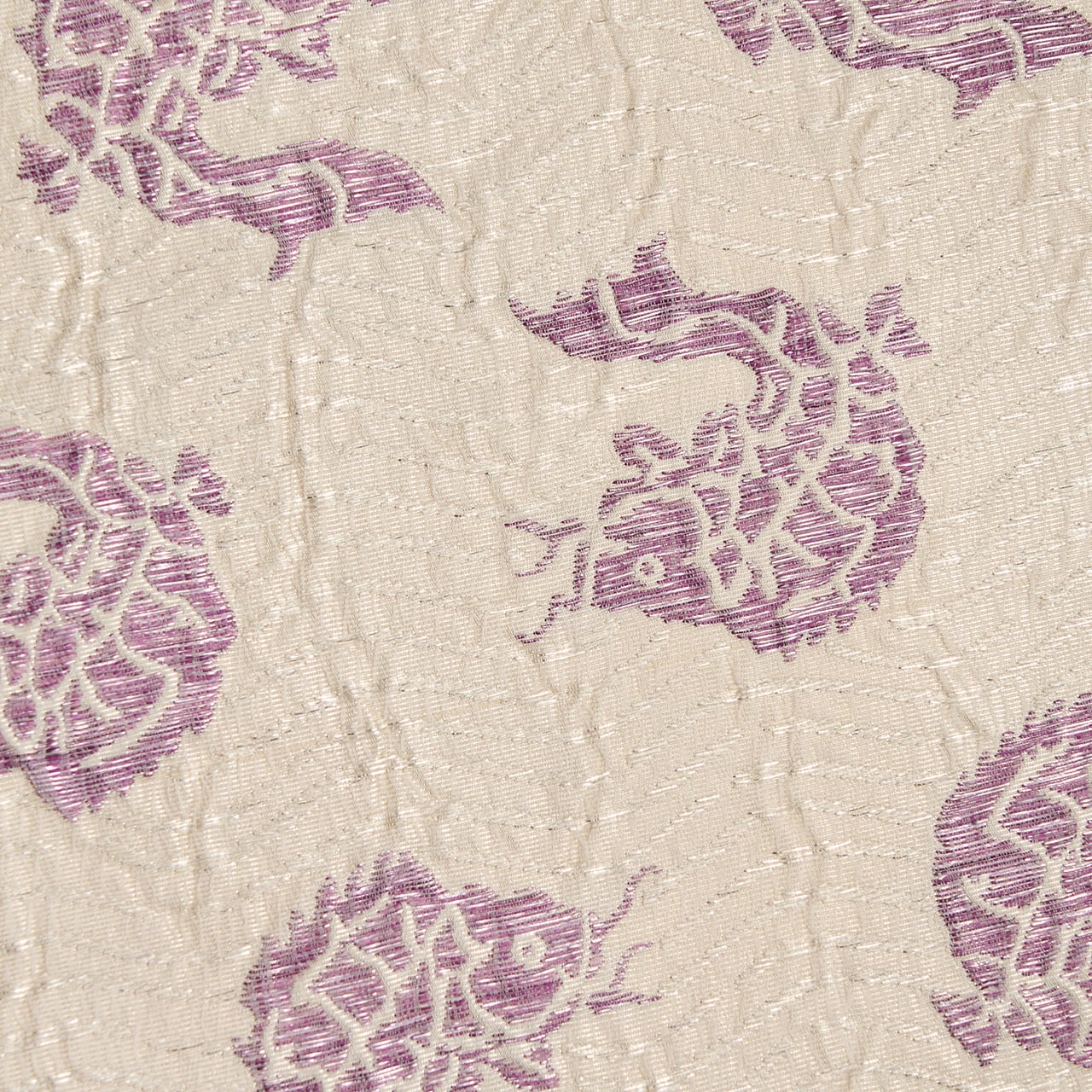 象牙色の少しふんわりとした質感の織りの地に、白と銀の極細の箔の糸で波の模様が織り出され、そこに躍動感のある姿の魚が貝紫の綺麗な紫・暗紅色で織り出された、名物裂の荒磯文様の、じゅらくさんの帝王紫ブランドの格調高さのある袋帯です。