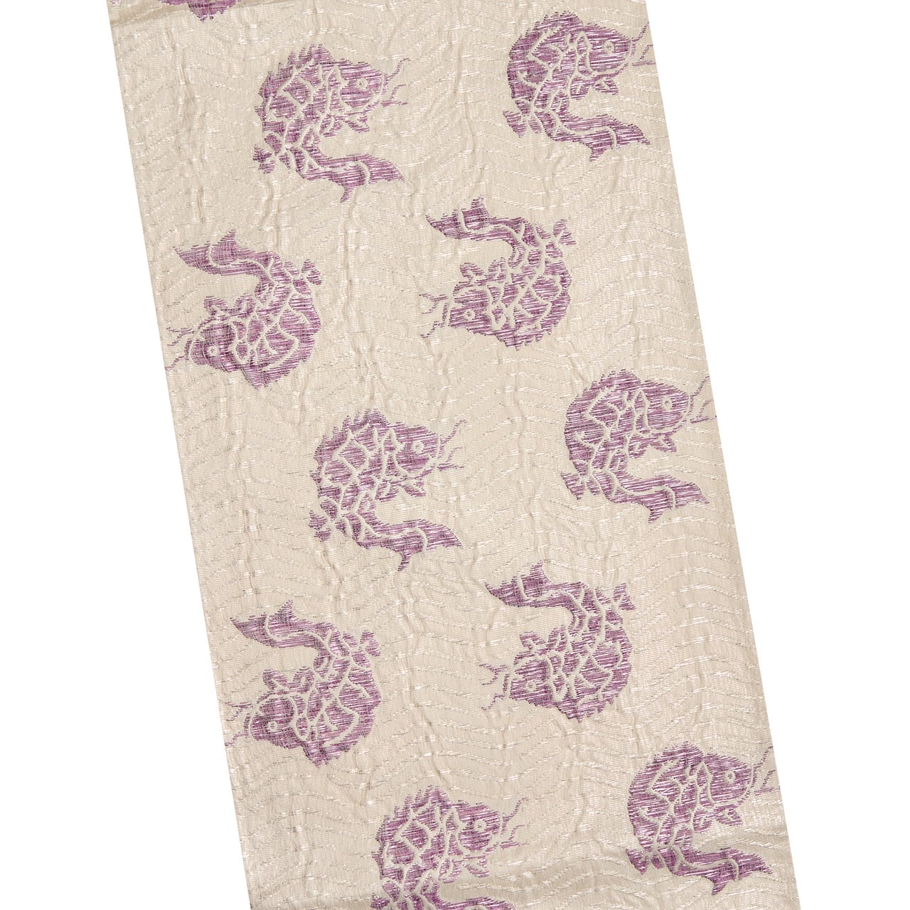 箔の糸で織られた波の模様が、動きによって少しキラキラと輝くのもとても綺麗ですし、その中を泳いでいるような貝紫のお魚の姿もとても活き活きとして美しいです。