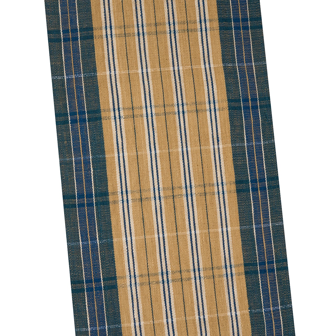 地元で採れる栗の皮や小鮒草などの草木を染料として染められた独特の白茶色の明るい薄茶の地に、両端には藍で染められたひとつは少し緑色がかった虫襖色と、綺麗な藍色の太い縞が織られ、間の白茶色の部分にも象牙色と藍色の細い縞が織り込まれた、スキッとした縞模様に、横には飛び飛びに藍色の細い縞と、丹波布ならではの真綿のつまみ糸が織り込まれた、手紡ぎ糸を手織りされた独特の味わいがとても心地よく目に映る、素敵な八寸名古屋帯です。