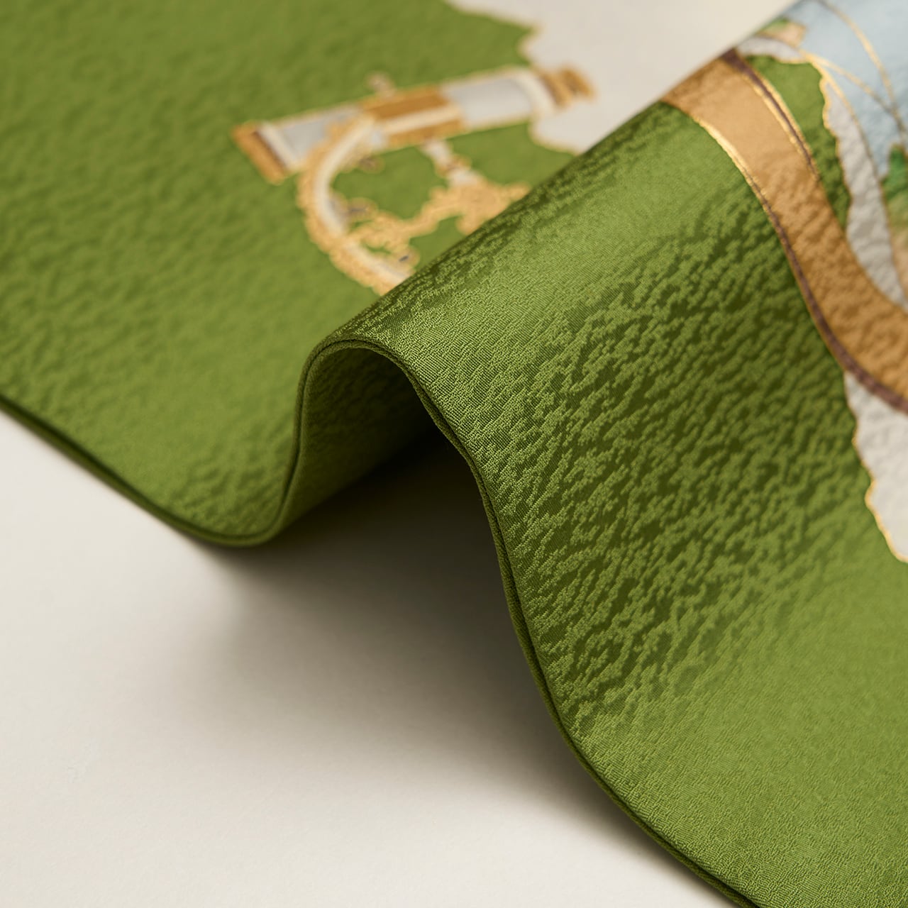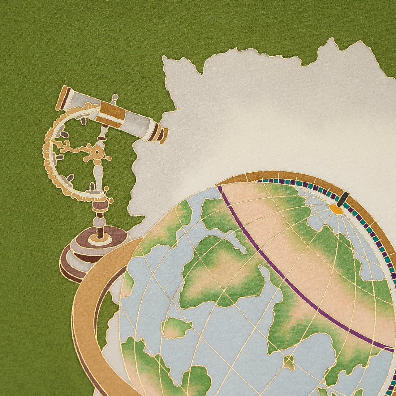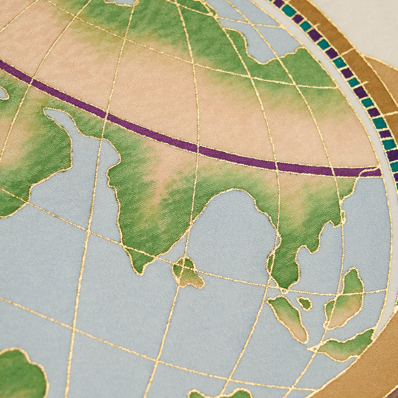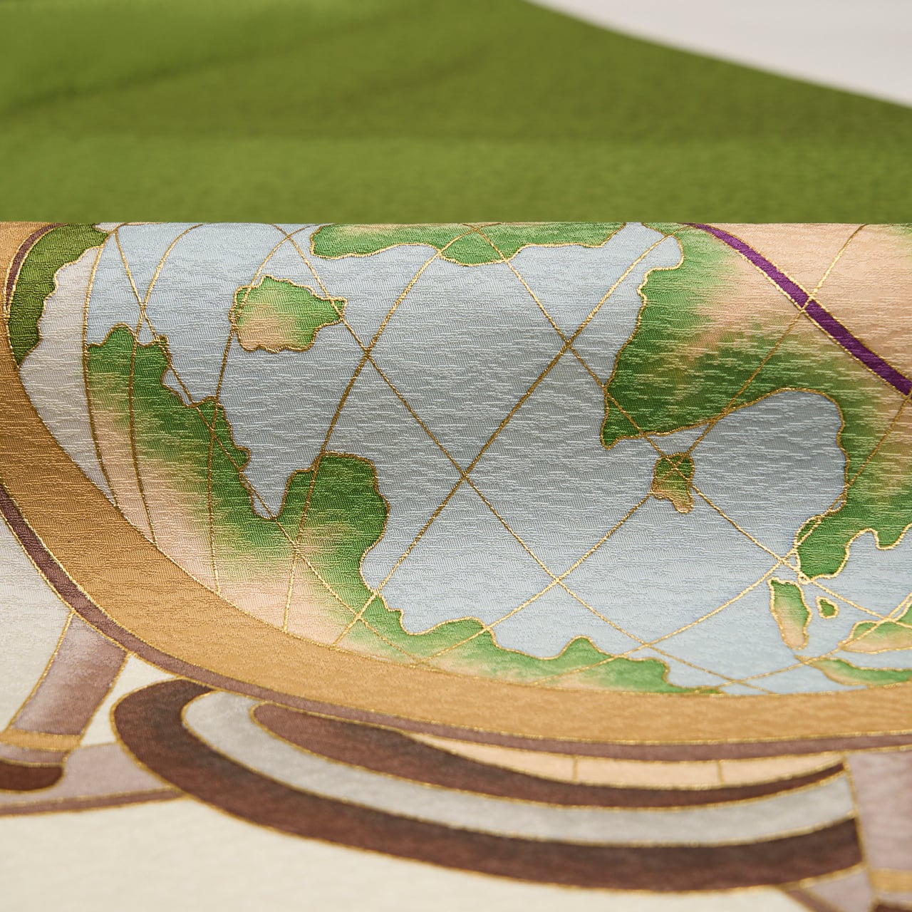 ひび割れのような、石畳のような地模様のある紋意匠の生地が明るい草色・松葉色に染められ、お太鼓には古い地図のような紙の形が取られて、そこに大きな地球儀と望遠鏡が友禅で描かれた、とてもユニークなモチーフが素敵な、岡重さんの九寸名古屋帯です。