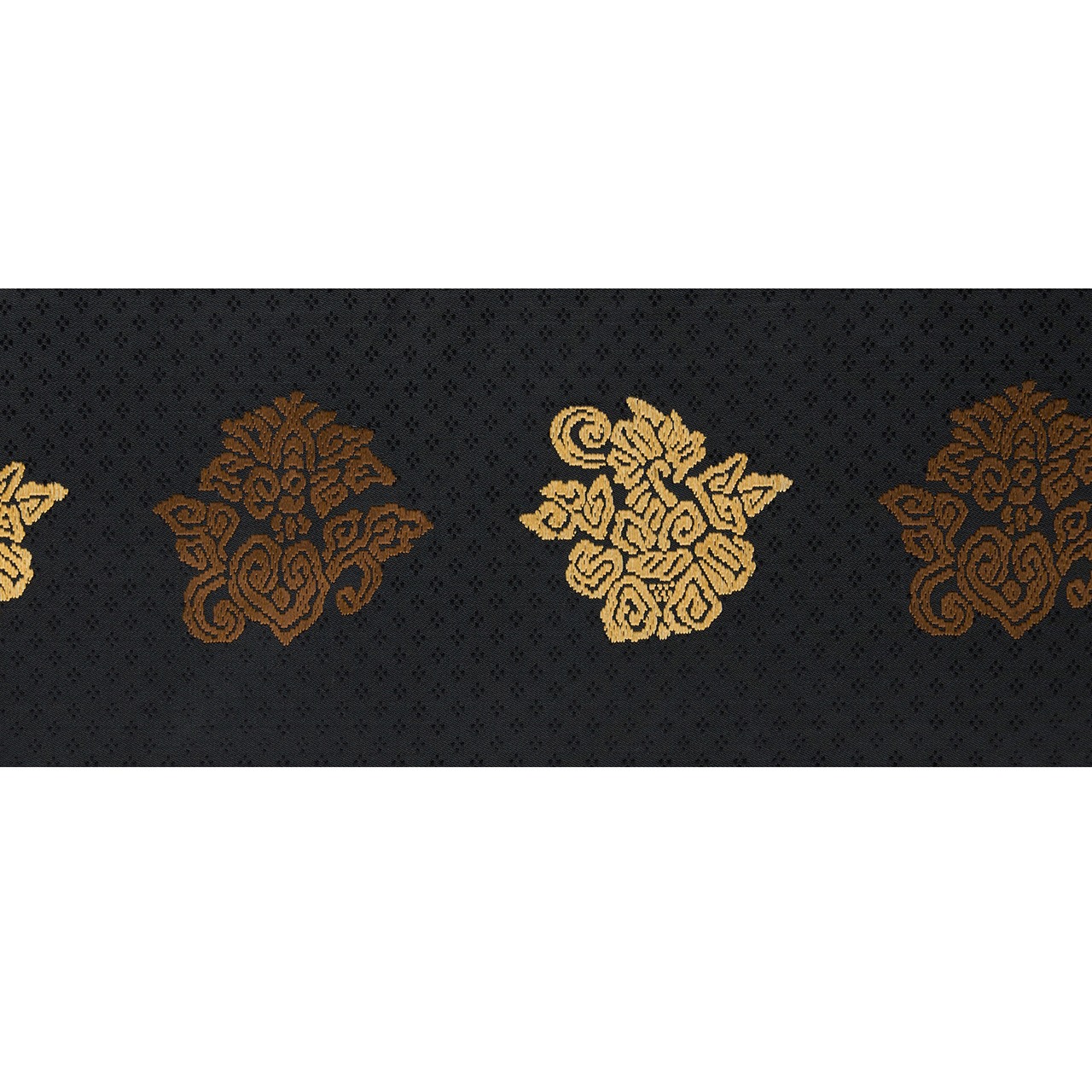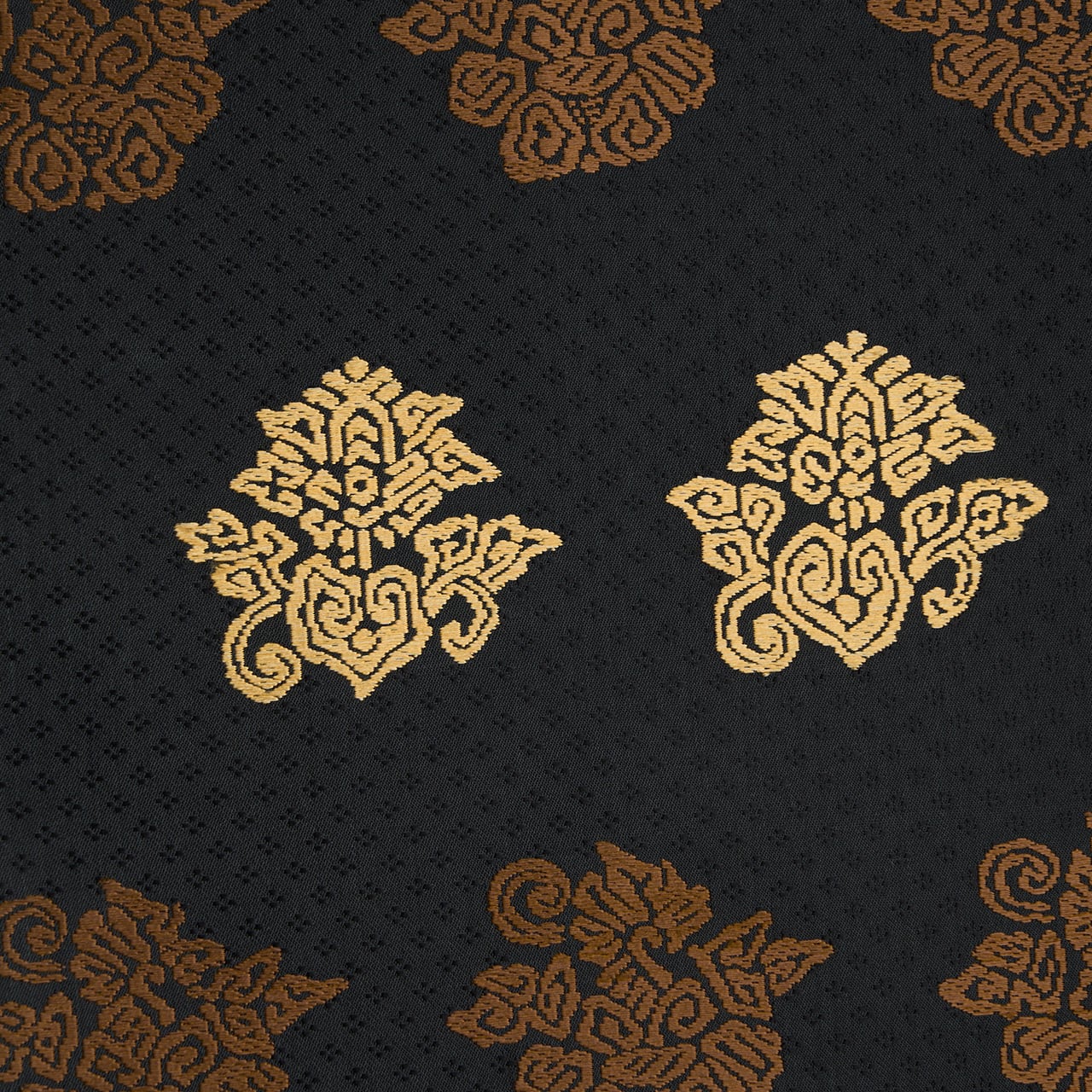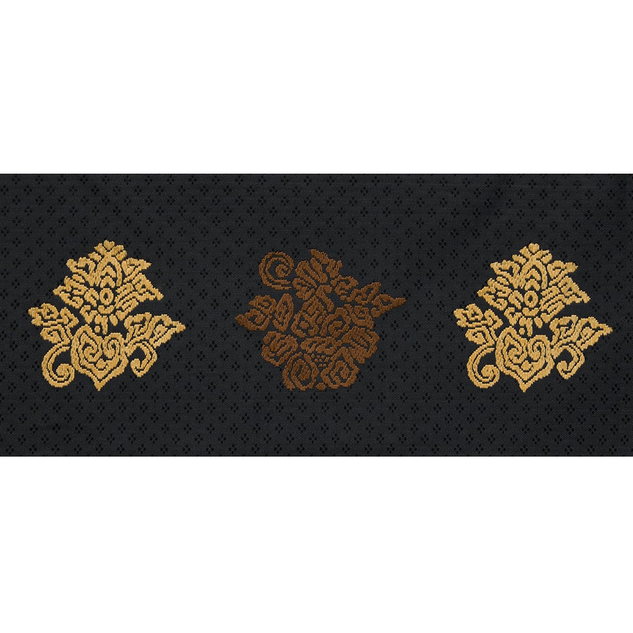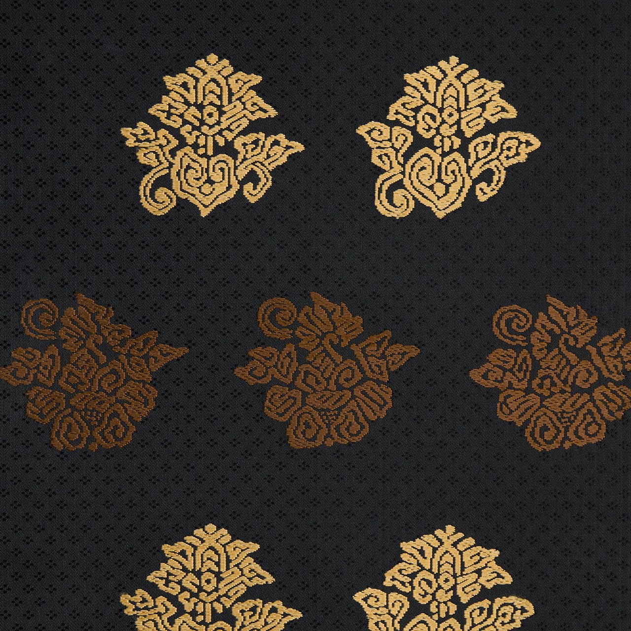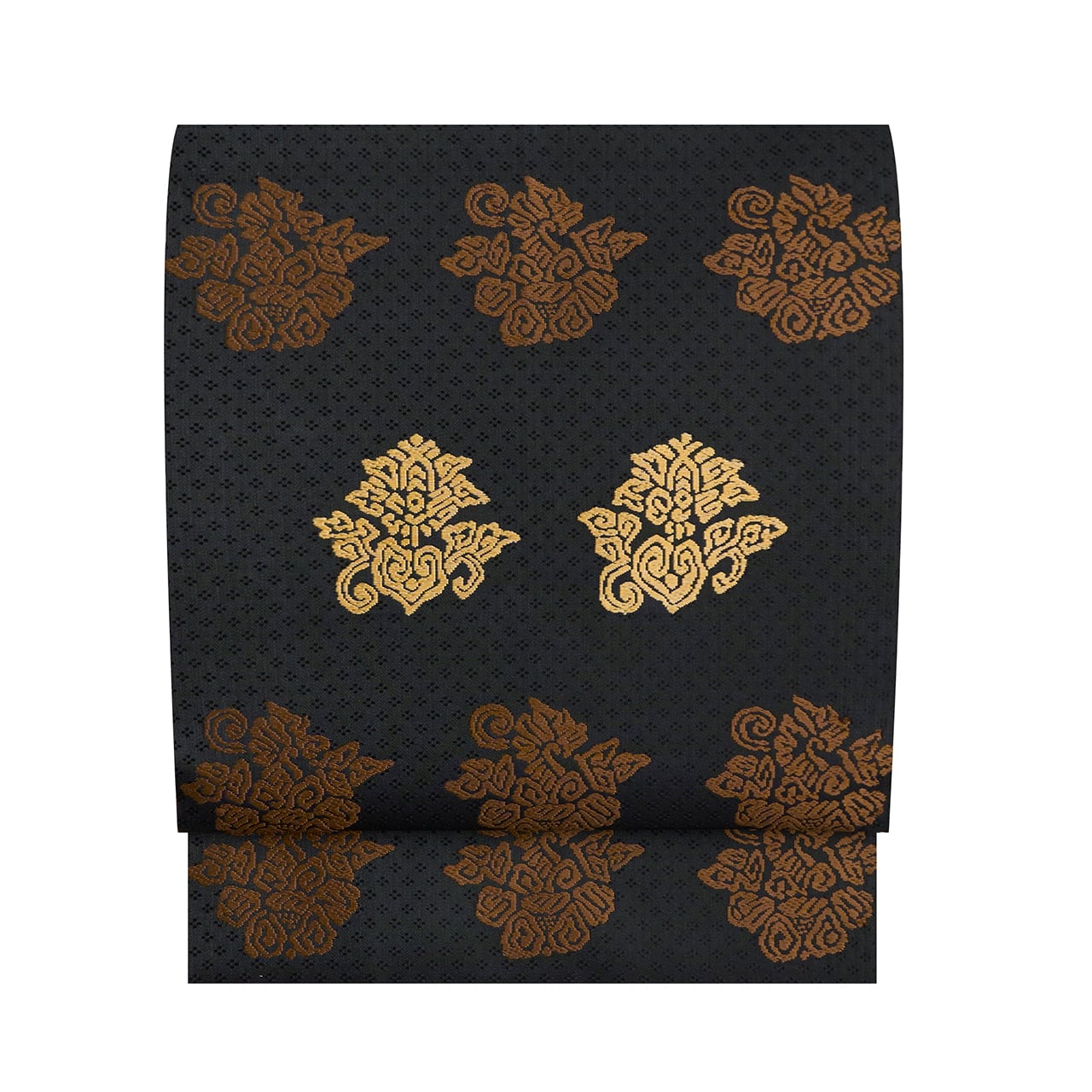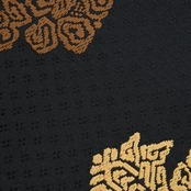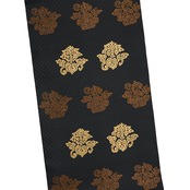 こちらは上品な光沢のある生地に、細かな花菱の文様がびっしりと連続して織り込まれた地に、鳥の子色のペルシャ花文のような形と、煎茶色の鳥のような形の模様が織り出され、名物裂的な格調高さを感じられるような素敵な名古屋帯の作品です。