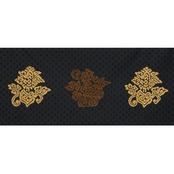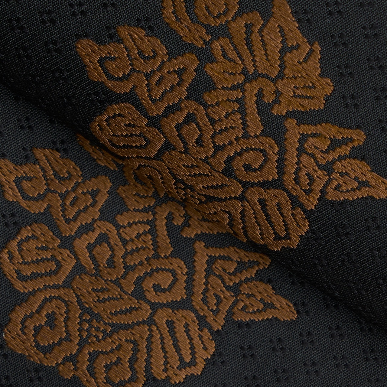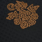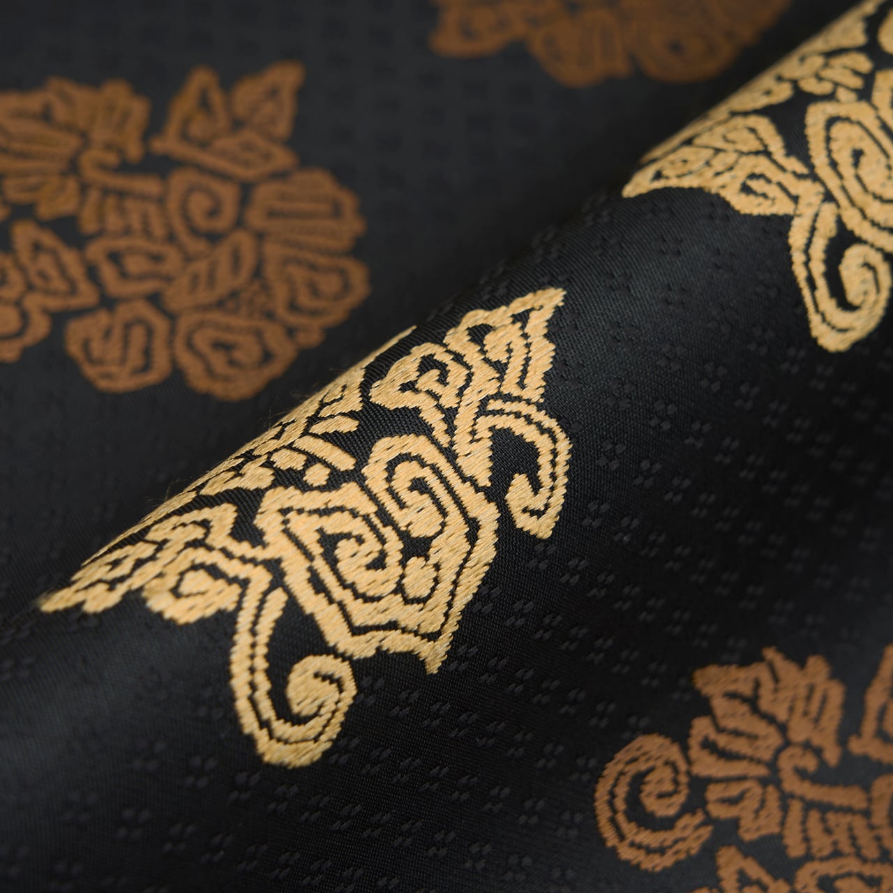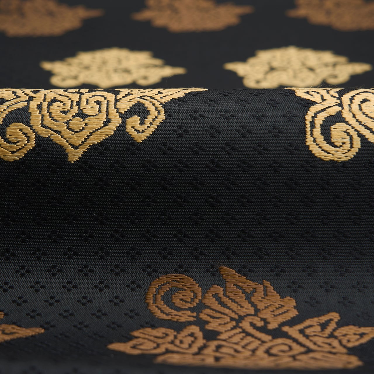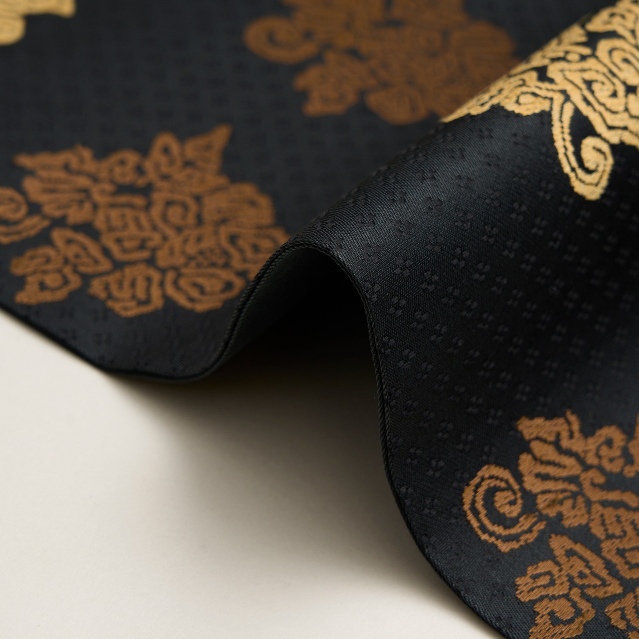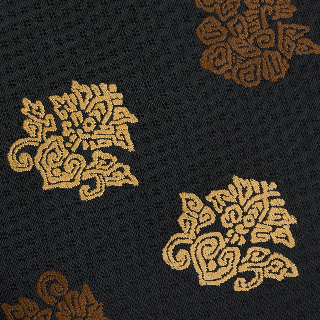 こちらは上品な光沢のある生地に、細かな花菱の文様がびっしりと連続して織り込まれた地に、鳥の子色のペルシャ花文のような形と、煎茶色の鳥のような形の模様が織り出され、名物裂的な格調高さを感じられるような素敵な名古屋帯の作品です。