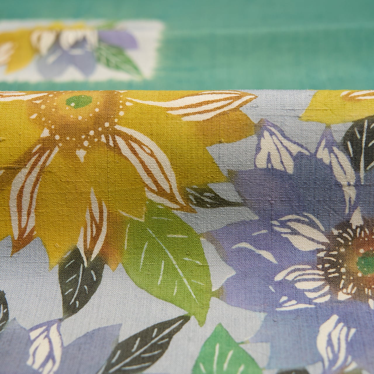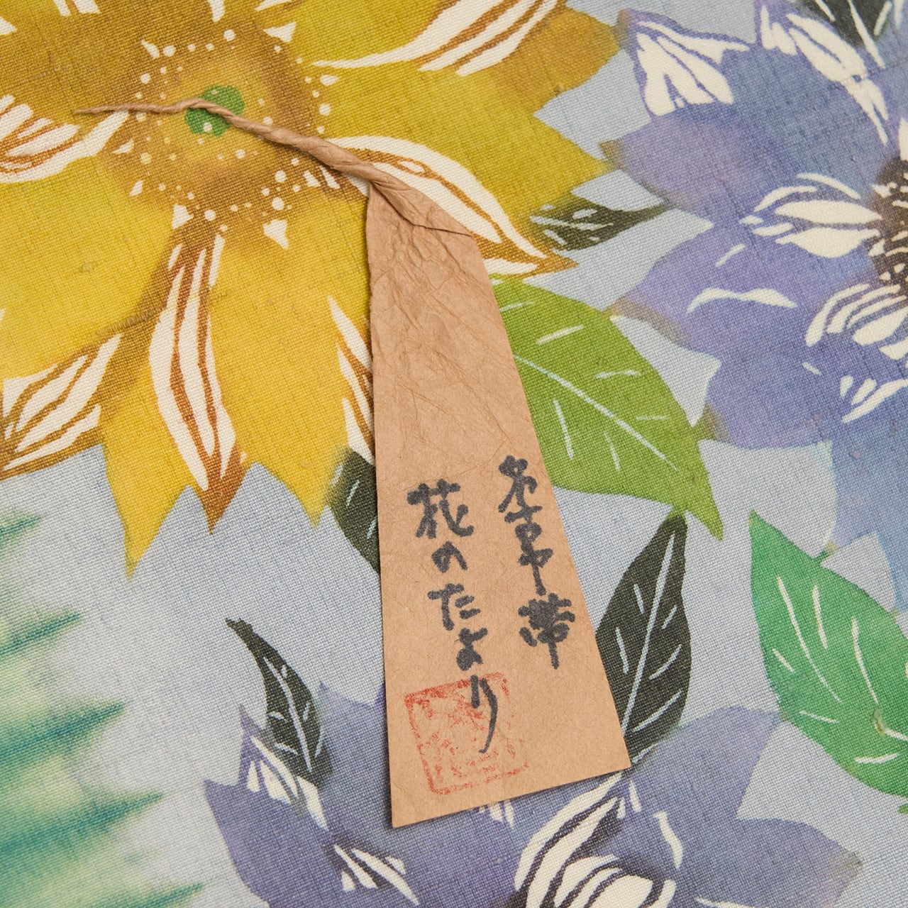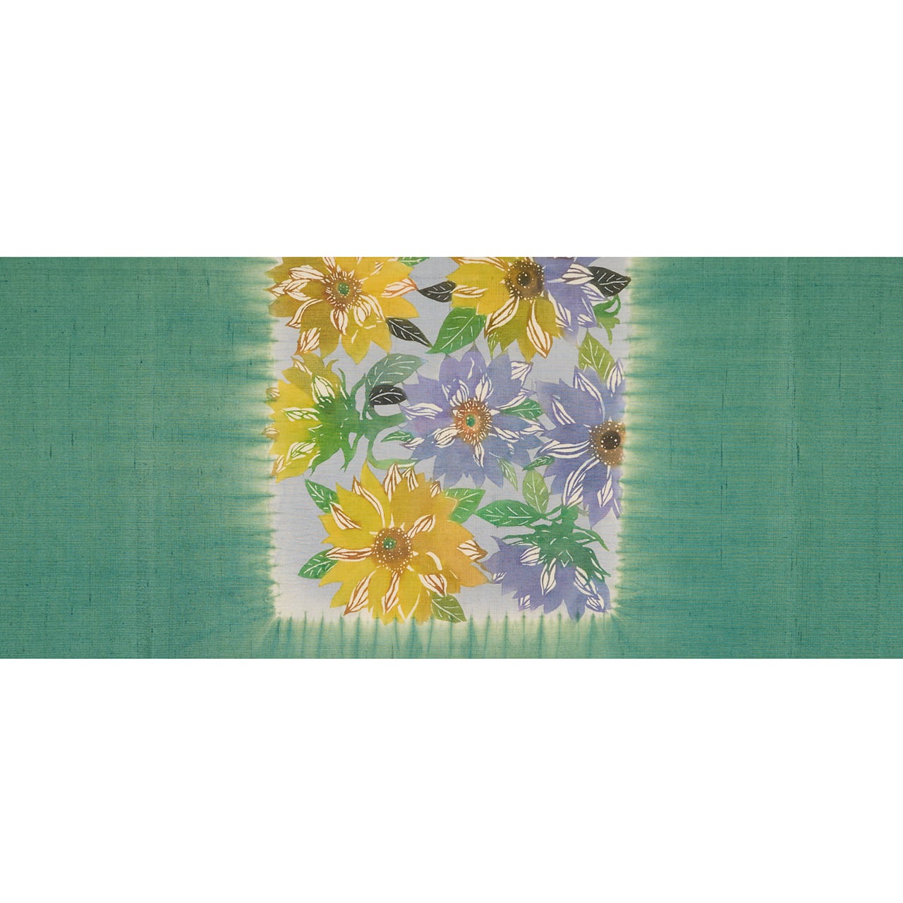 こちらは緯糸に少し節の見られる座繰りのさらっとした紬地が、柄のある部分だけを四角く染め抜くように、絞り染めで翡翠色に染め分けられて、大胆な調子に満開に咲くヒマワリのお花が型絵染で描かれた、素晴らしい九寸名古屋帯の作品です。