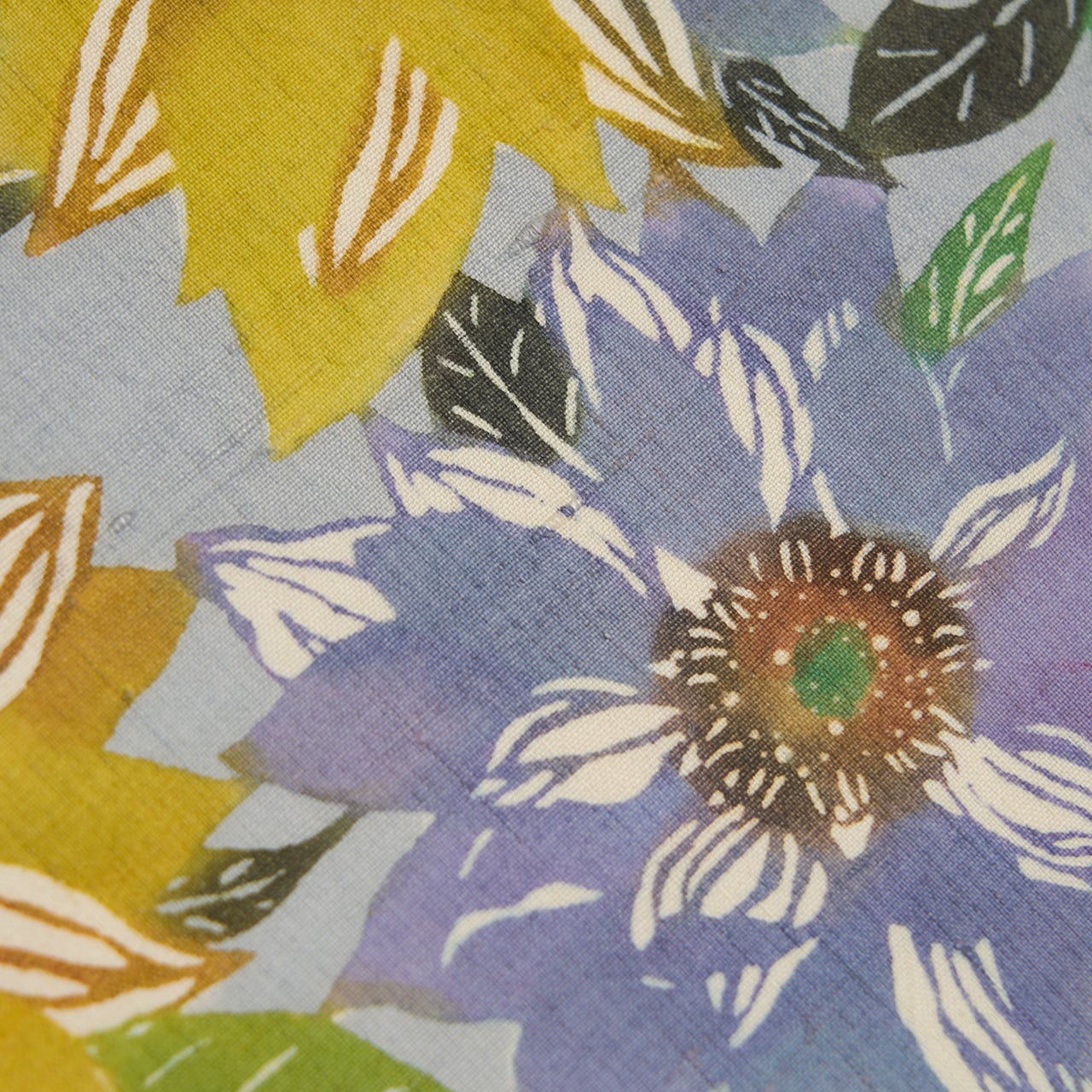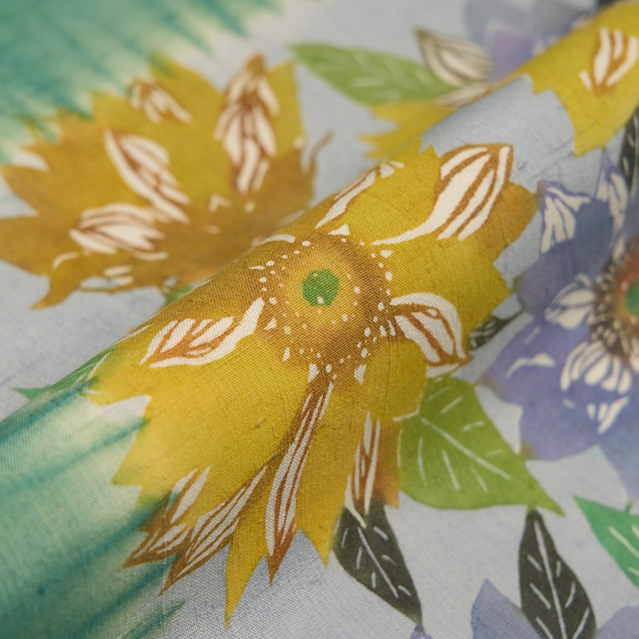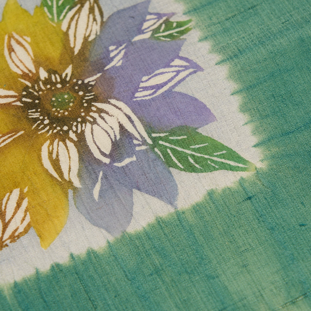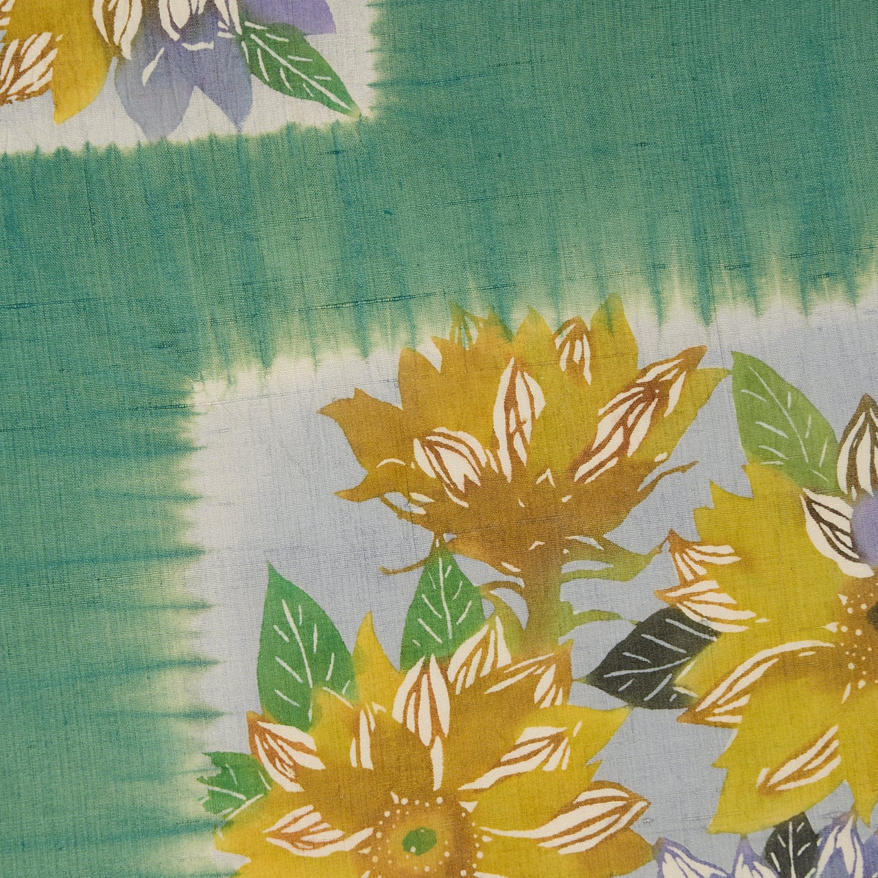 こちらは緯糸に少し節の見られる座繰りのさらっとした紬地が、柄のある部分だけを四角く染め抜くように、絞り染めで翡翠色に染め分けられて、大胆な調子に満開に咲くヒマワリのお花が型絵染で描かれた、素晴らしい九寸名古屋帯の作品です。