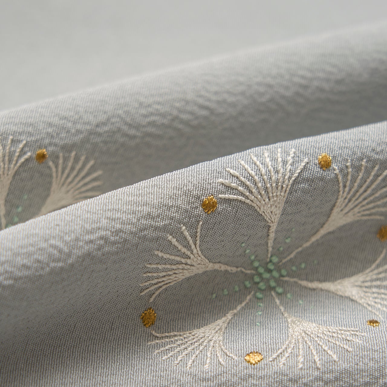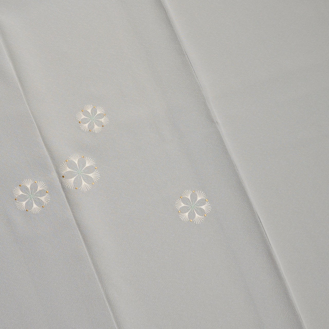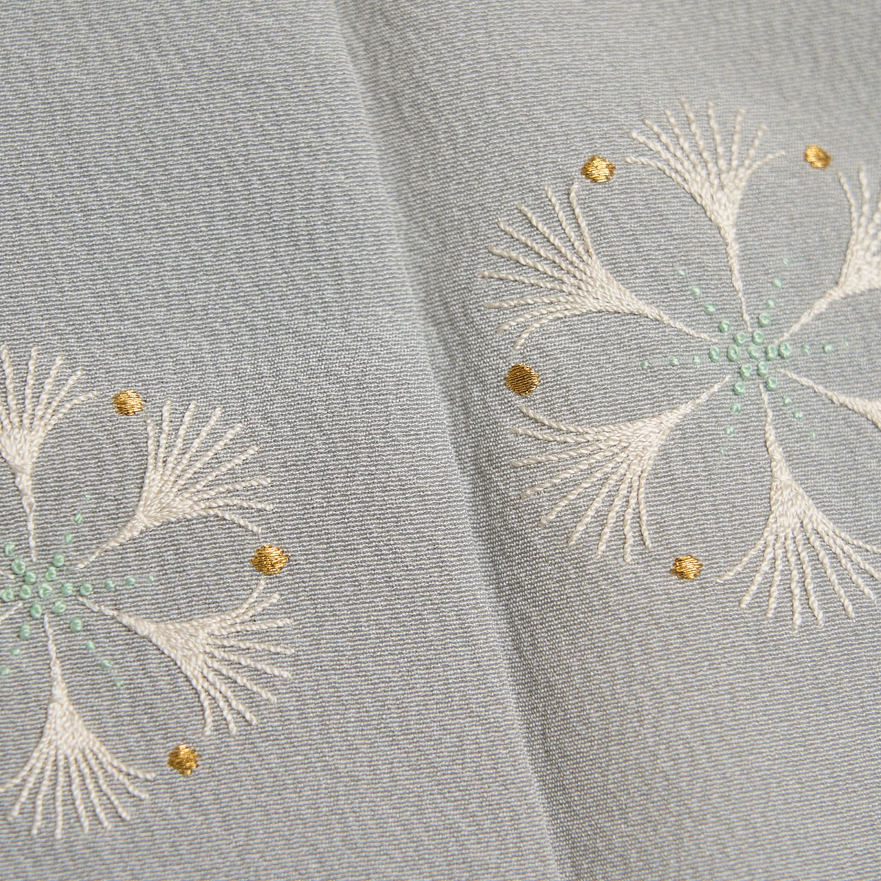 しっかりとしたしなやかな一越ちりめんの生地が、淡い少し青味のあるグレー・灰青色に染められ、上前に可愛らしいお花の模様が手刺繍で表された、気品のある素敵な森康次さんの附下の作品です。