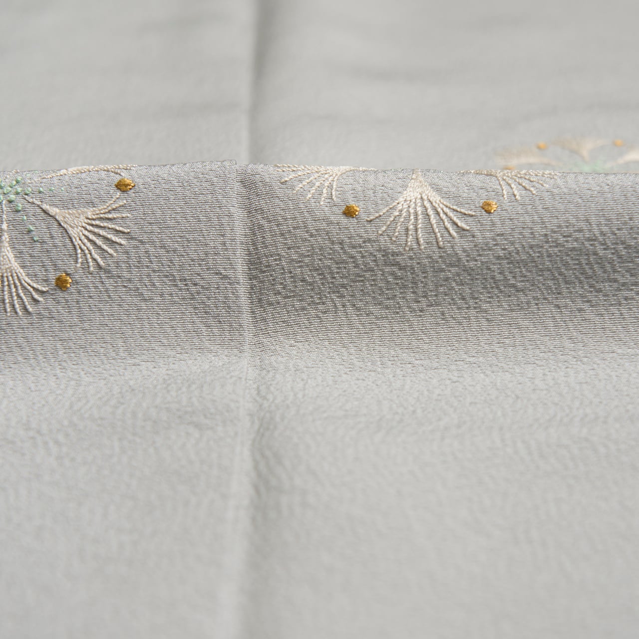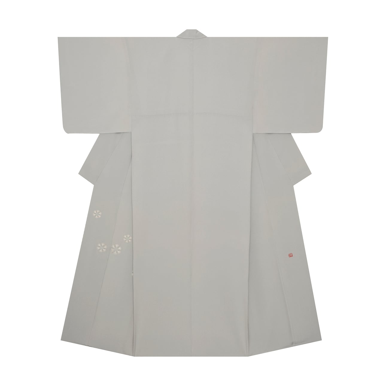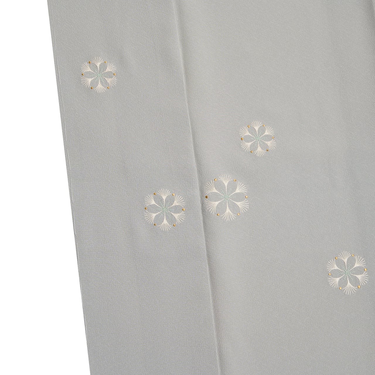 しっかりとしたしなやかな一越ちりめんの生地が、淡い少し青味のあるグレー・灰青色に染められ、上前に可愛らしいお花の模様が手刺繍で表された、気品のある素敵な森康次さんの附下の作品です。
