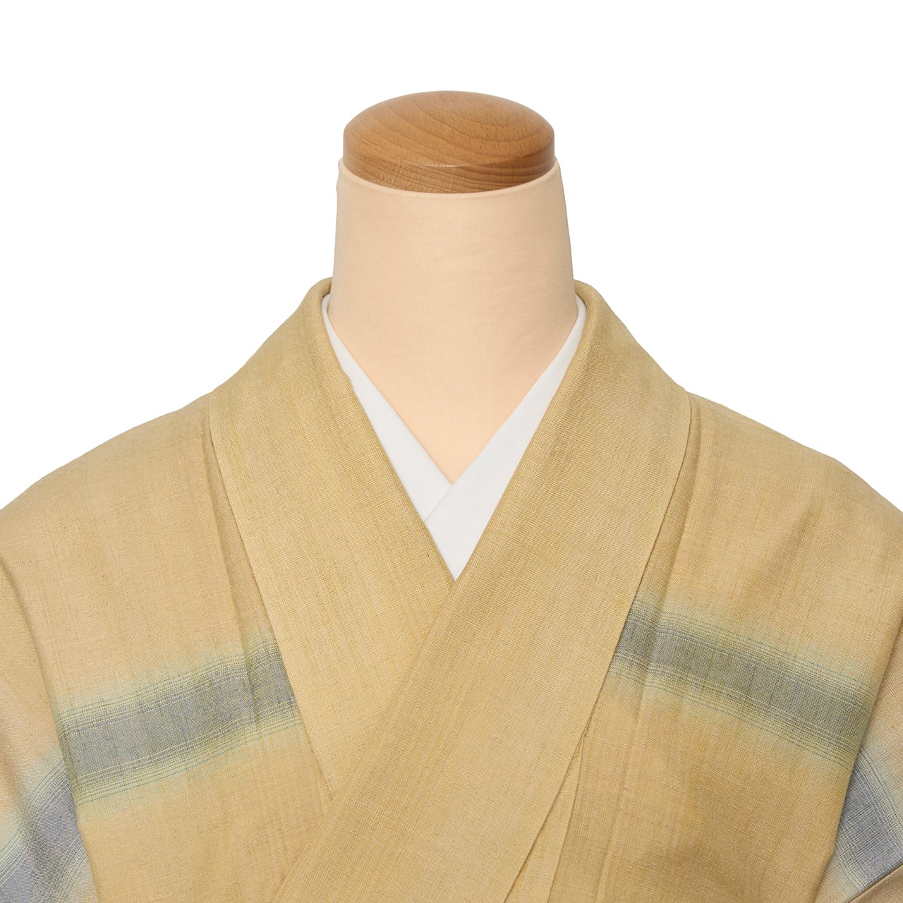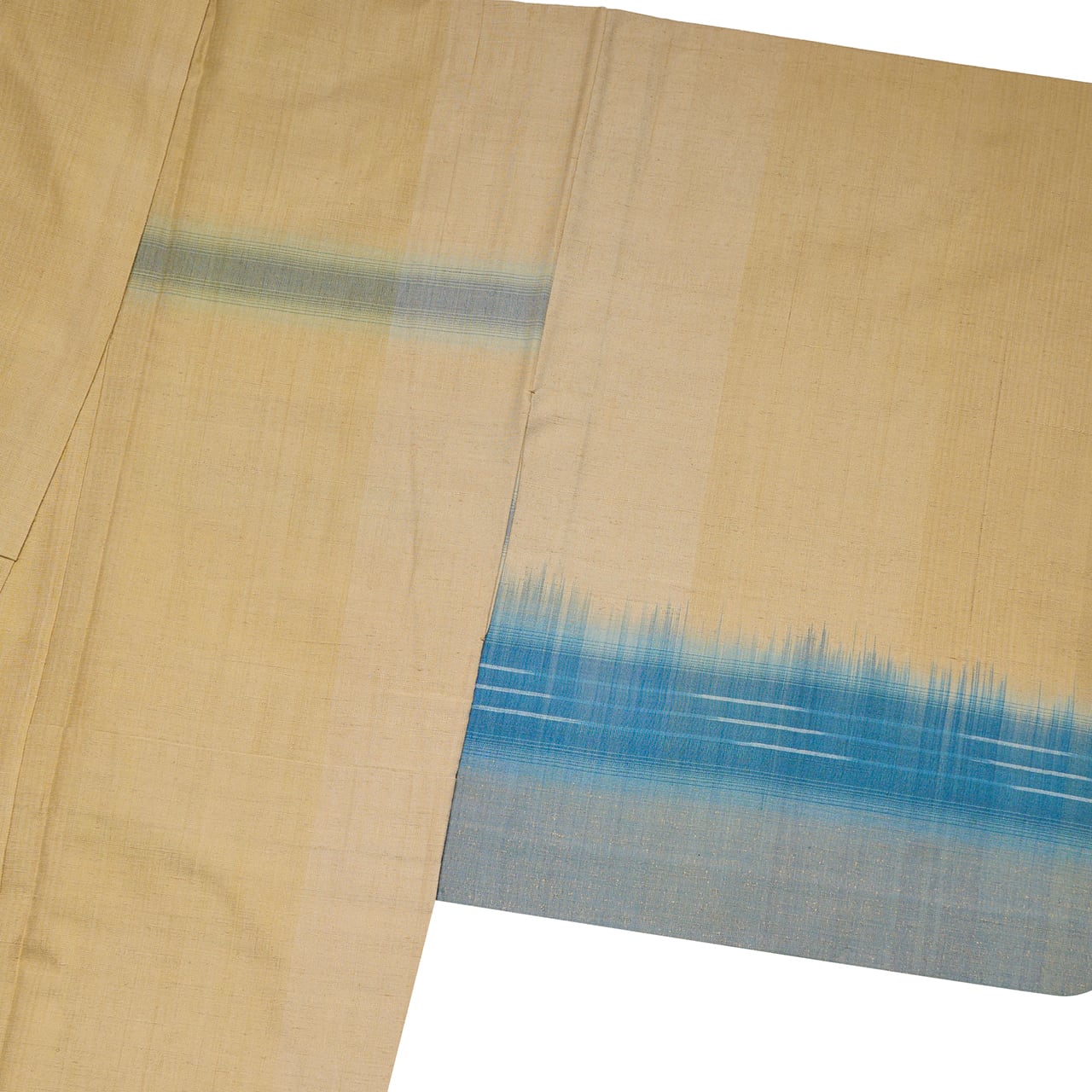黄色味の強いベージュ・枯色のしっかりとした打ち込みの張りのある紬地に、裾から衿先の少し下くらいまでの位置に玉虫のような、シャンブルのようなグレー味のある藍・藍鼠色が織り込まれ、それに一段ずつ濃く明るい藍・青藍色の段が入れられ、その段の中にも横絣の線が織り込まれるという、とても凝った織りで絵羽附けにされた、染め絣の単衣のお着物です。