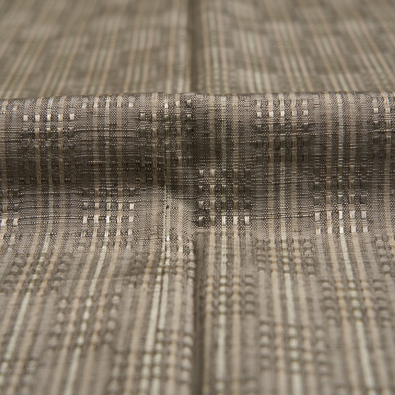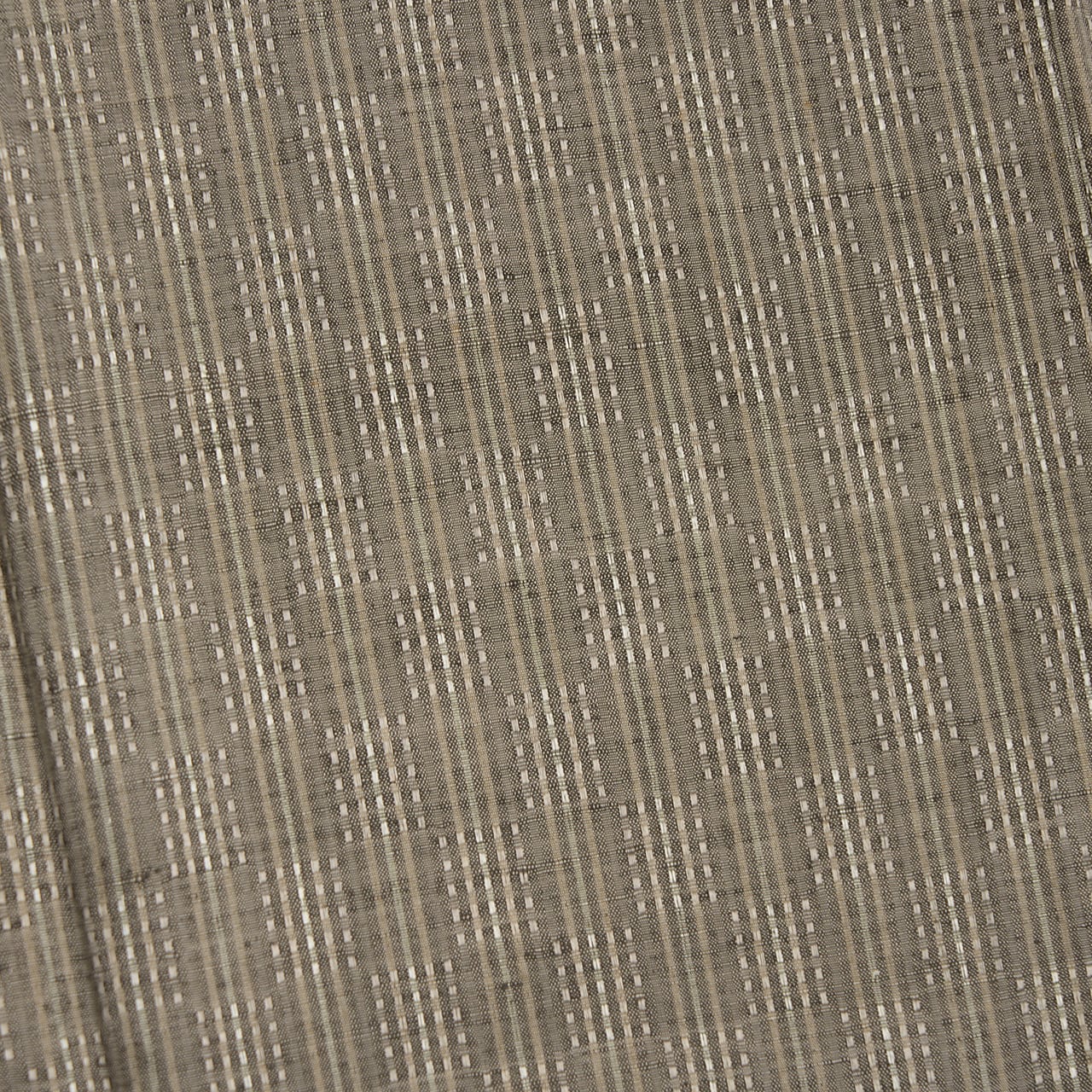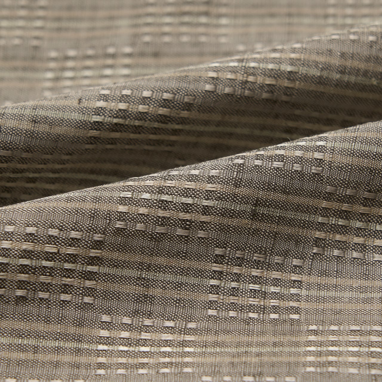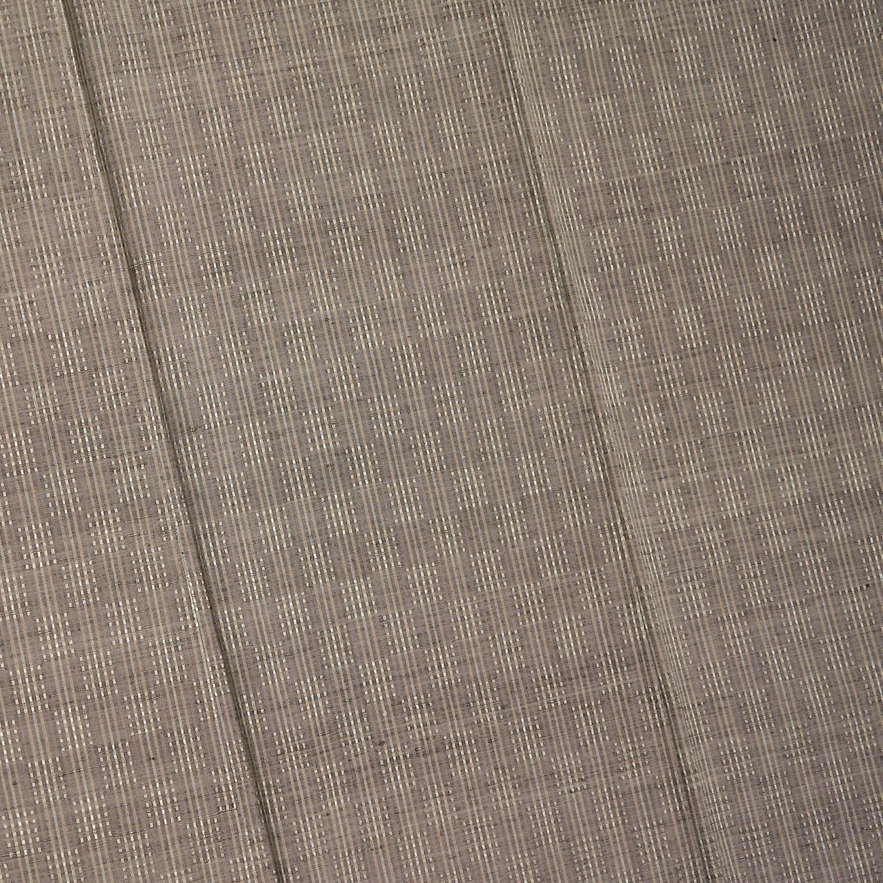 ふっくらとした質感の上質な淡いグレー・利休白茶色の地に、縦にそれよりやや薄い色のグレーと、少しだけ淡いピンク味のあるグレー・枯野色、白鼠色の糸で縞模様が織り込まれ、それが市松の配置にロートン織の浮き織にされていますが、真ん中の白鼠色の糸には山繭の糸が織り込まれているようで、浮織による光沢だけでなく、山繭の光沢が加わって、キラッと光るような輝きが美しく目に映るような、素敵な有明紬のお着物です。