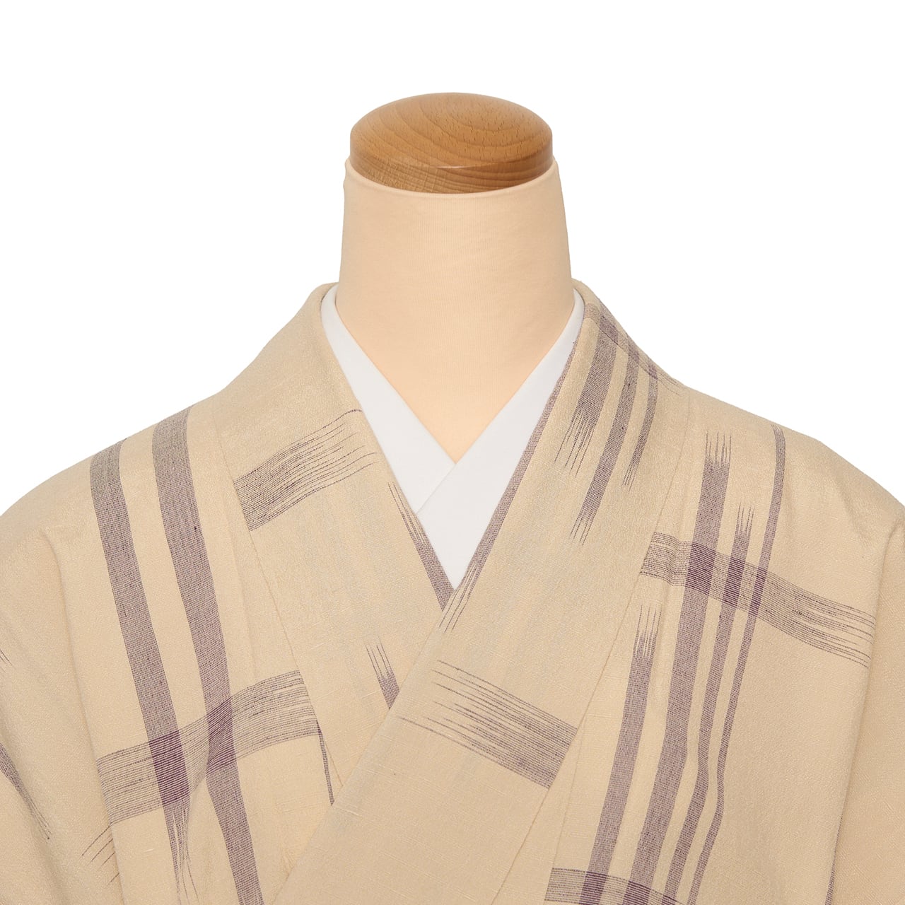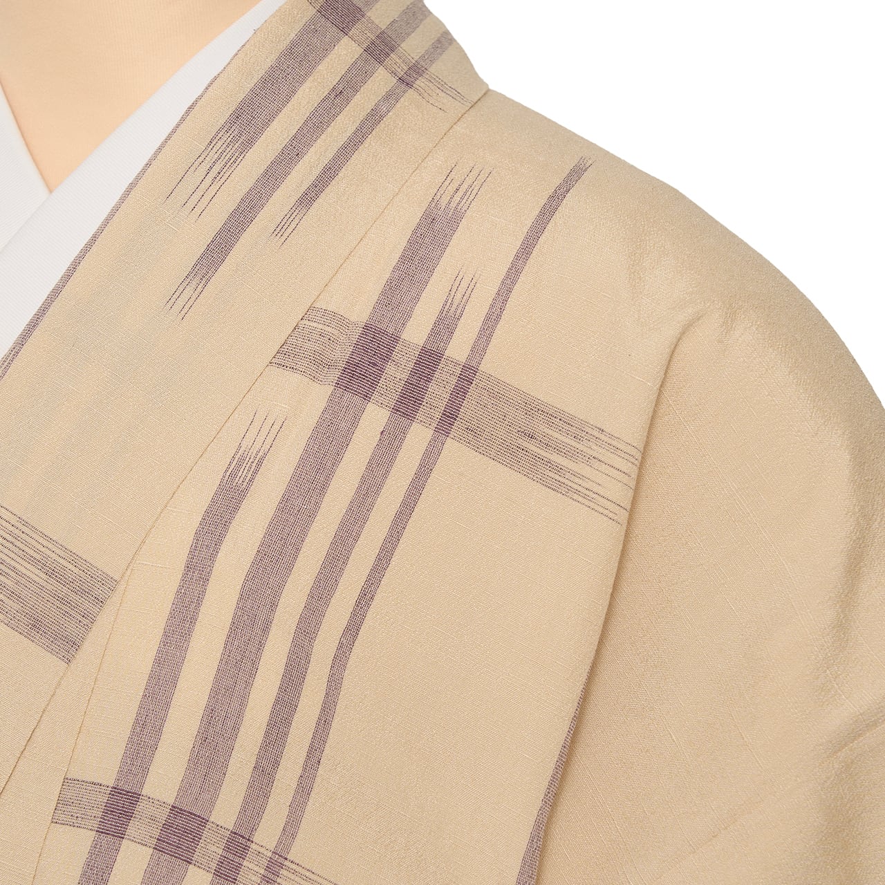 緯糸に撚りが掛けられた糸で織られた弾力性が心地よく感じられる練色の生地に、濃色の薄紫の糸で大振りな十字絣の模様が重なるように配置されて織り込まれた、すっきりとしたお洒落な雰囲気の結城ちぢみのお着物です。