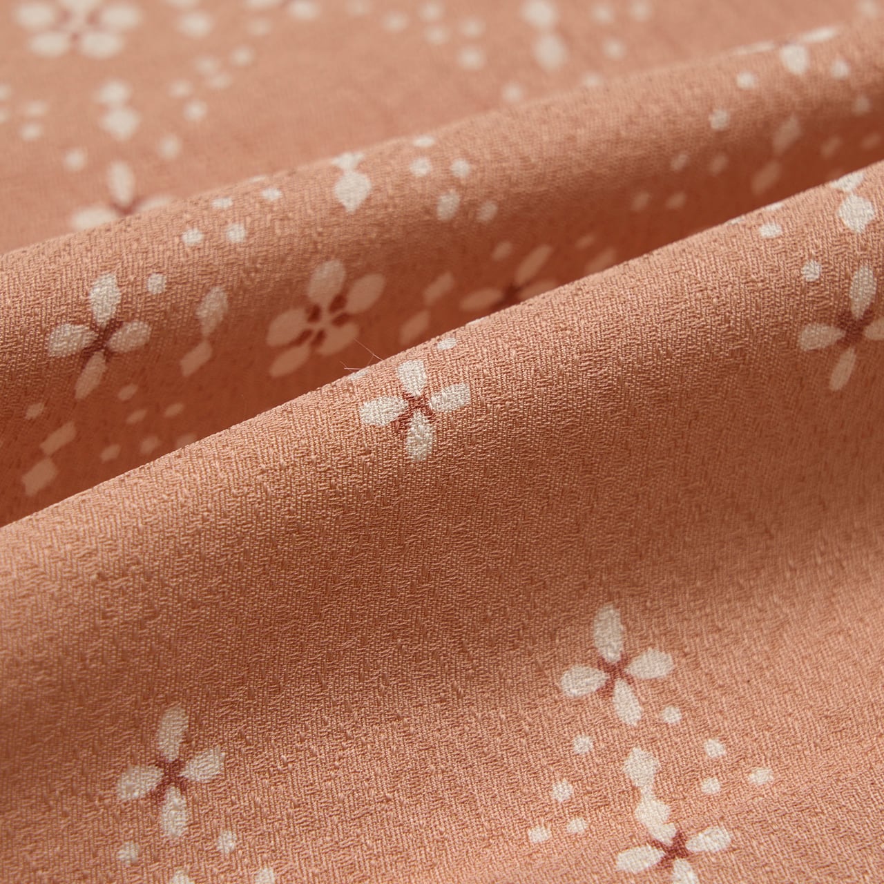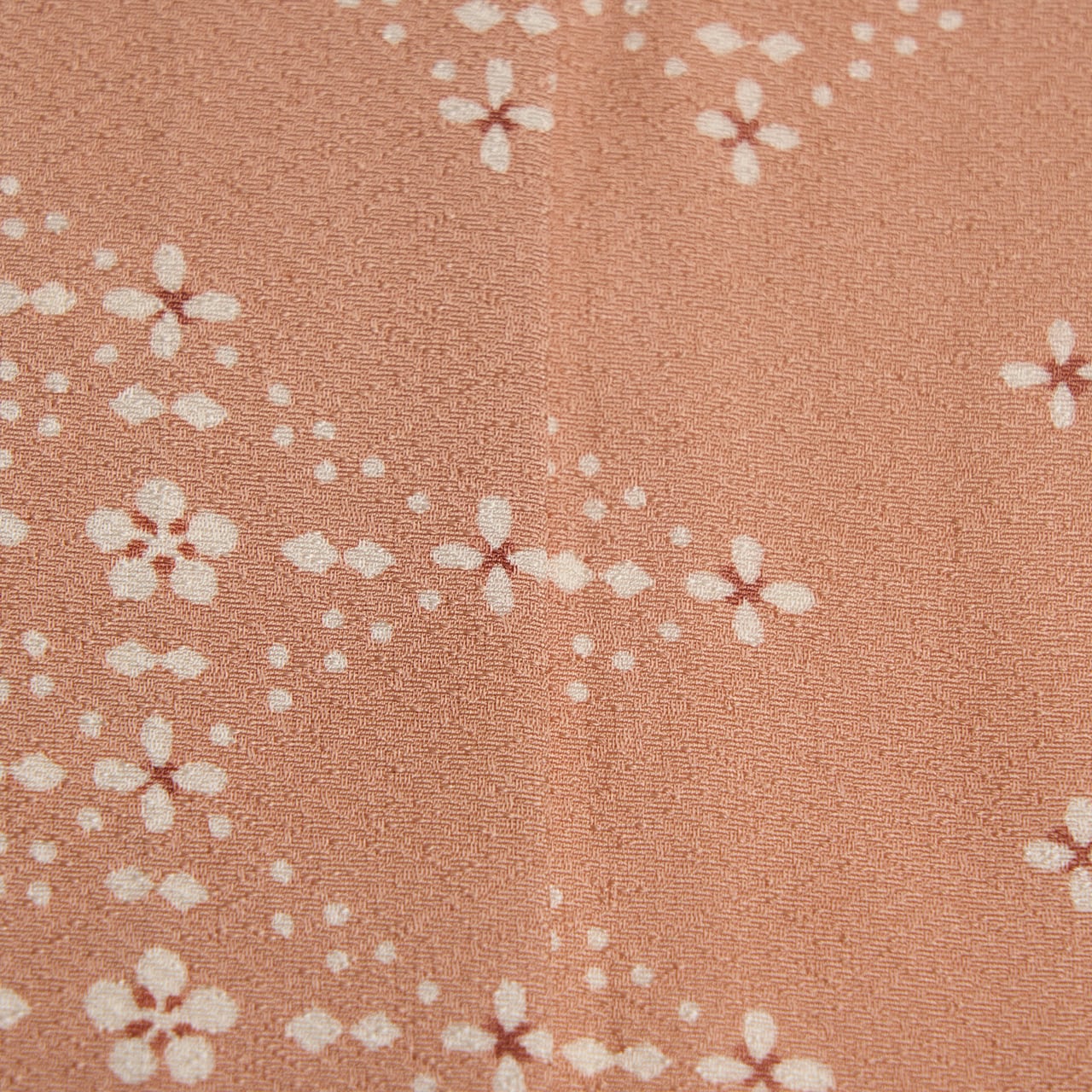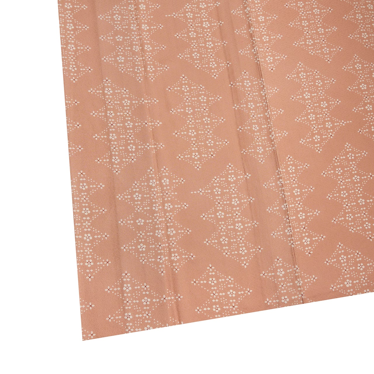 とても細かい紗綾型の地模様のある紋意匠の生地が、柔らかさのある珊瑚色のコーラルピンクに染められ、7個の菱形が連なってジグザグの形になったものに、大小のお花が白く型友禅で染め抜かれ、お花の中心は蘇芳色で色付けされた、とても品の良い華やかさのある素敵な小紋の単衣のお着物です。