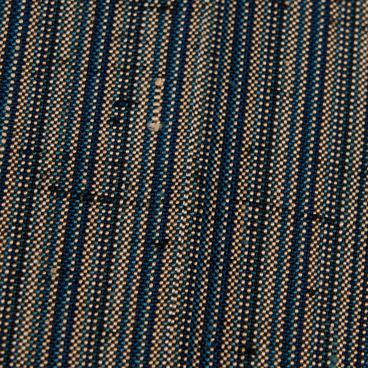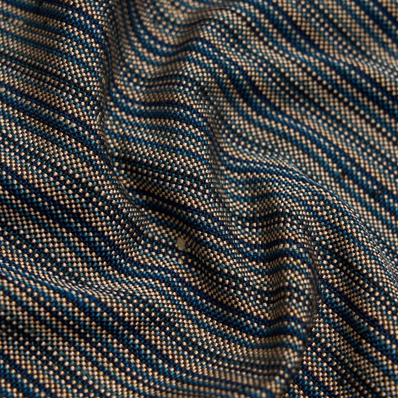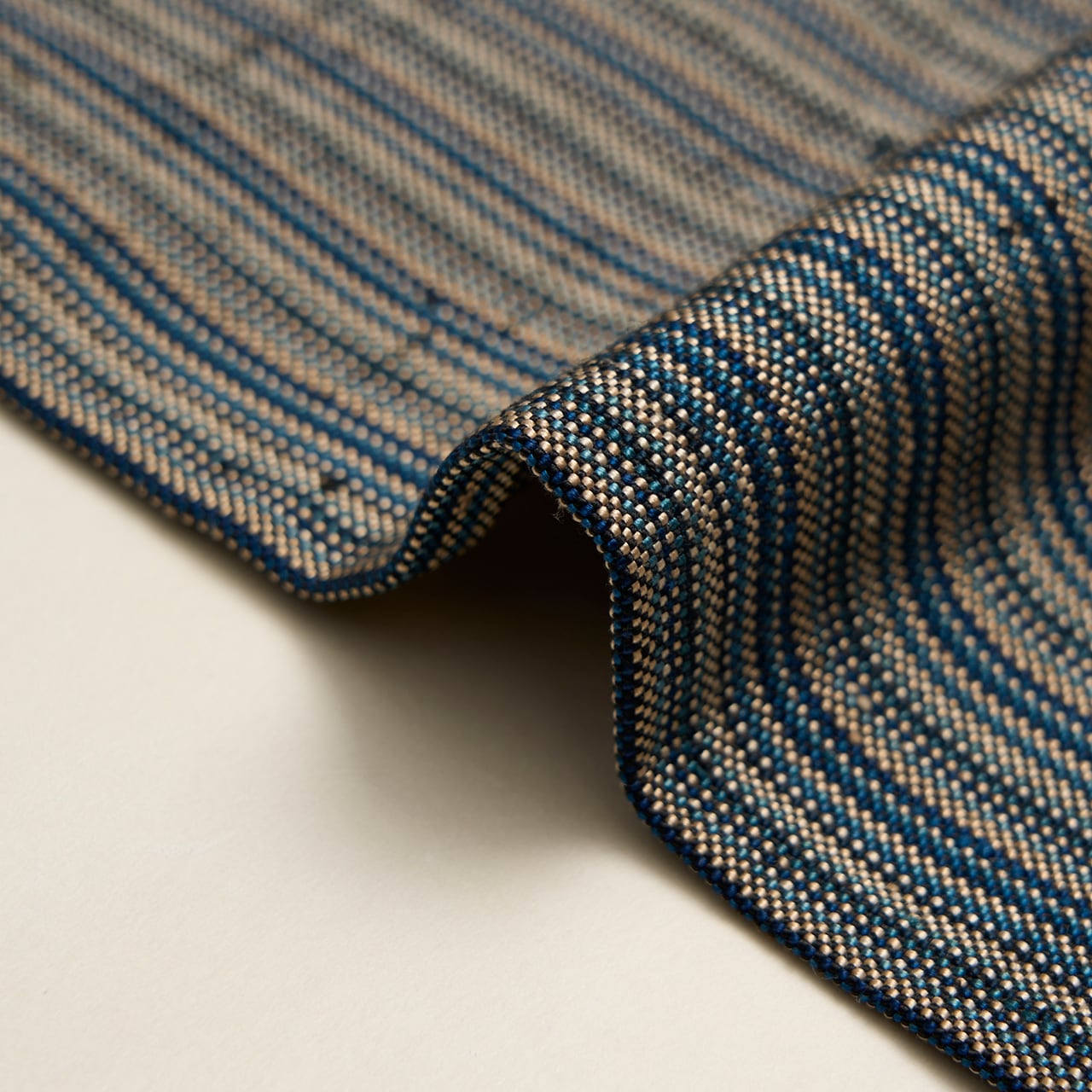 少しグレー味のあるベージュ・亜麻色の地に、濃い藍色と少しだけ緑味のある中間の藍・青緑色、そして少し淡い藍・錆浅葱色の縞が繰り返しで並んで、スマートでお洒落な模様を構成していますが、その1本ずつの糸の存在感と光沢がとても綺麗な輝きを放っています。
