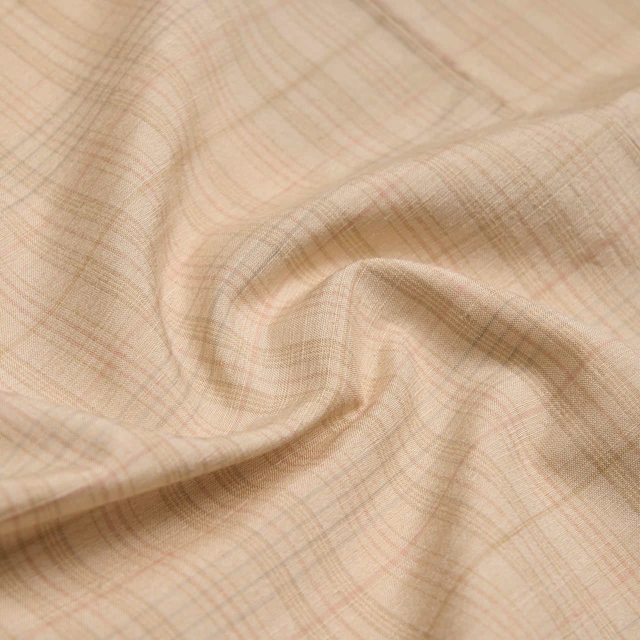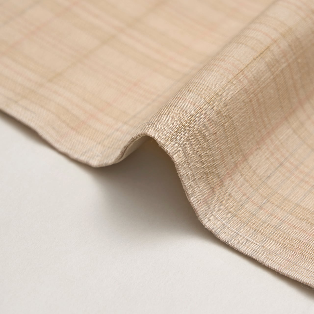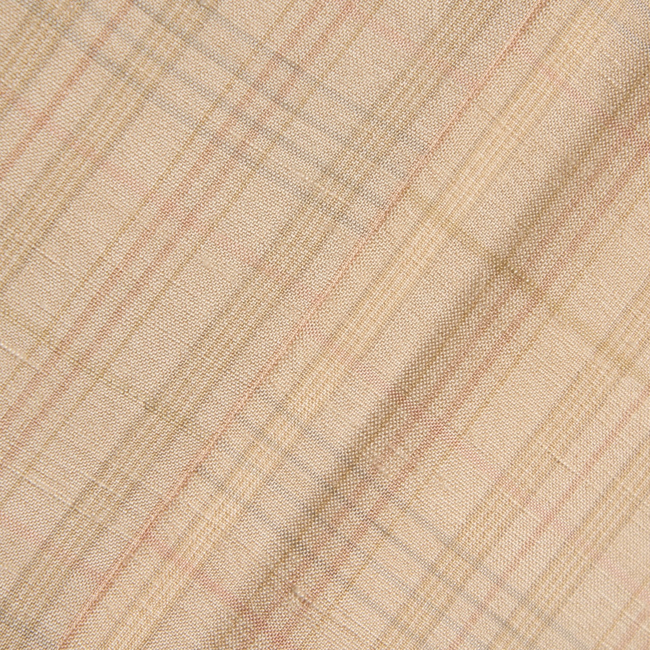 こちらは、地色が少しだけピンク味の感じられる柔らかいベージュ・灰梅色となっていて、それに利休色の淡い草色と退紅色のピンクが経緯に織り込まれ、優しい格子の模様を構成しています。