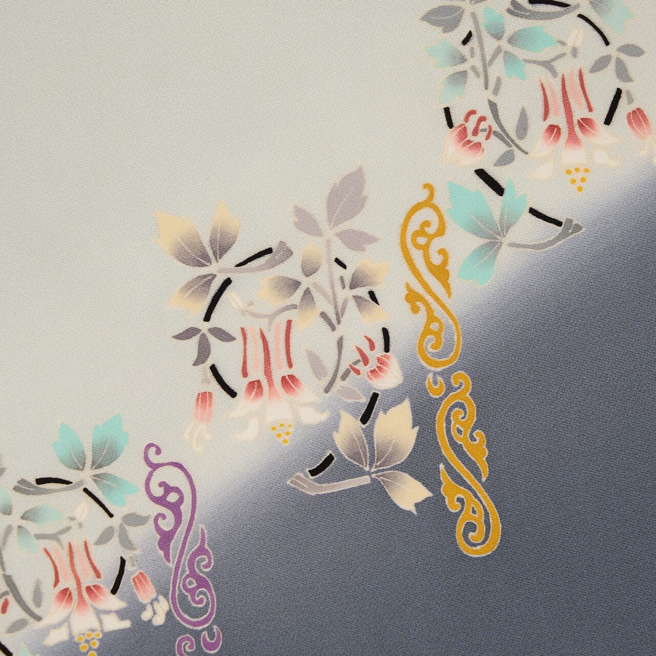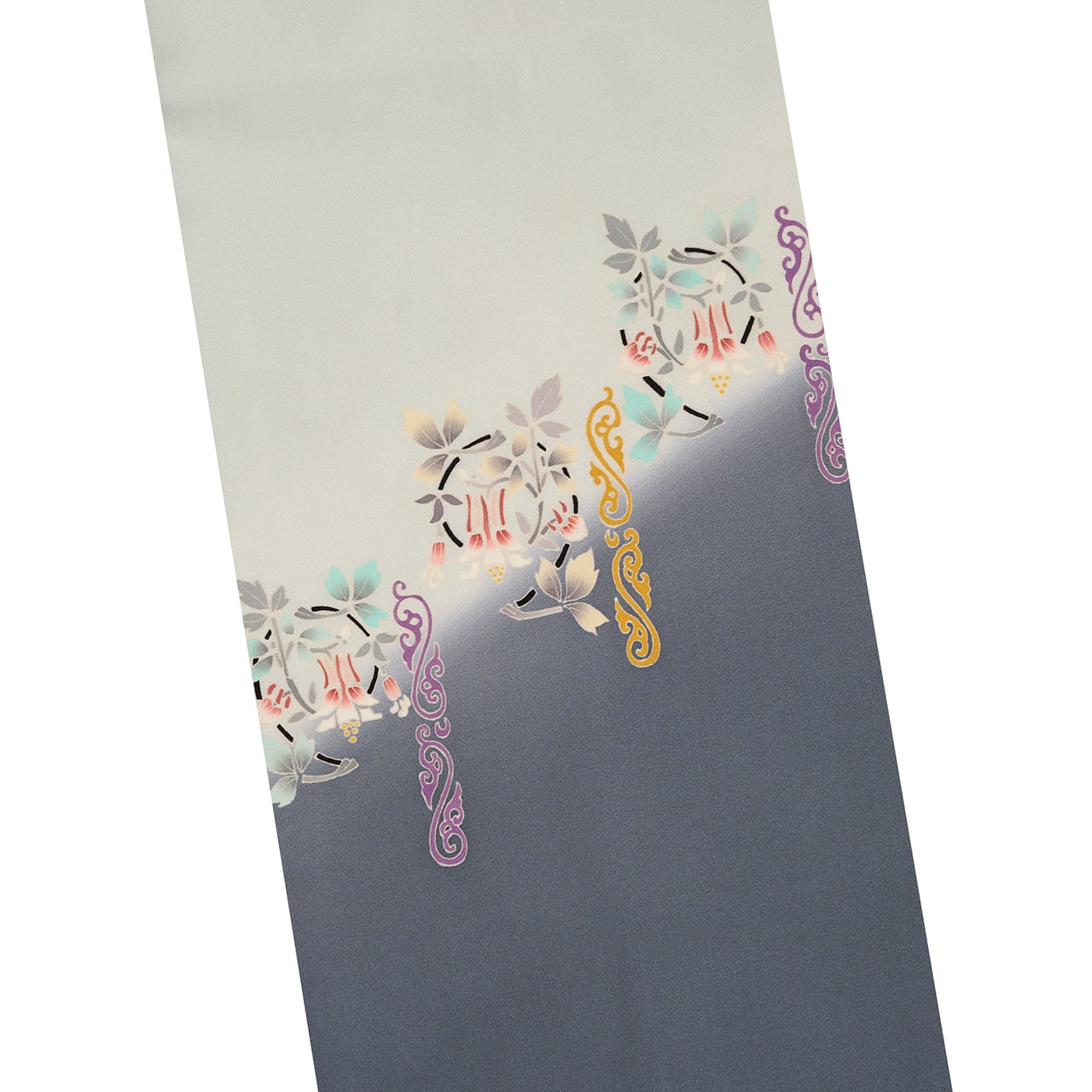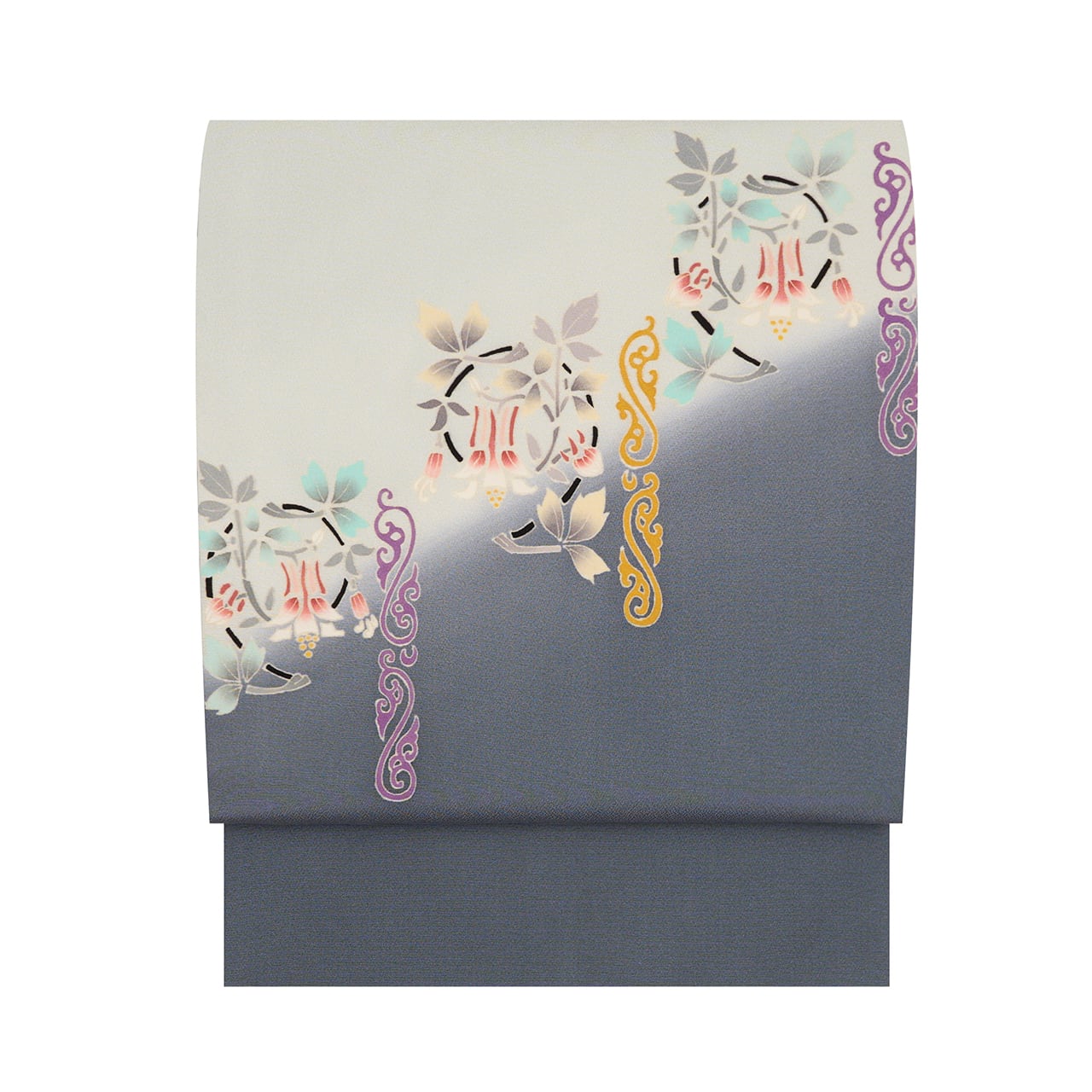 目の詰まったような一越ちりめんのしっかりとした生地が少し濃いグレー・鈍色に染められ、お太鼓の真ん中から明るい淡い水色がかった白・藍白色に斜めの暈しで染め分けられて、木朽葉色と古代紫色の蔓草の模様と、横には釣鐘型のお花と蔓草が手描きの友禅で描かれた、加賀友禅ならではの気品のある佇まいの素敵な九寸名古屋帯です。
