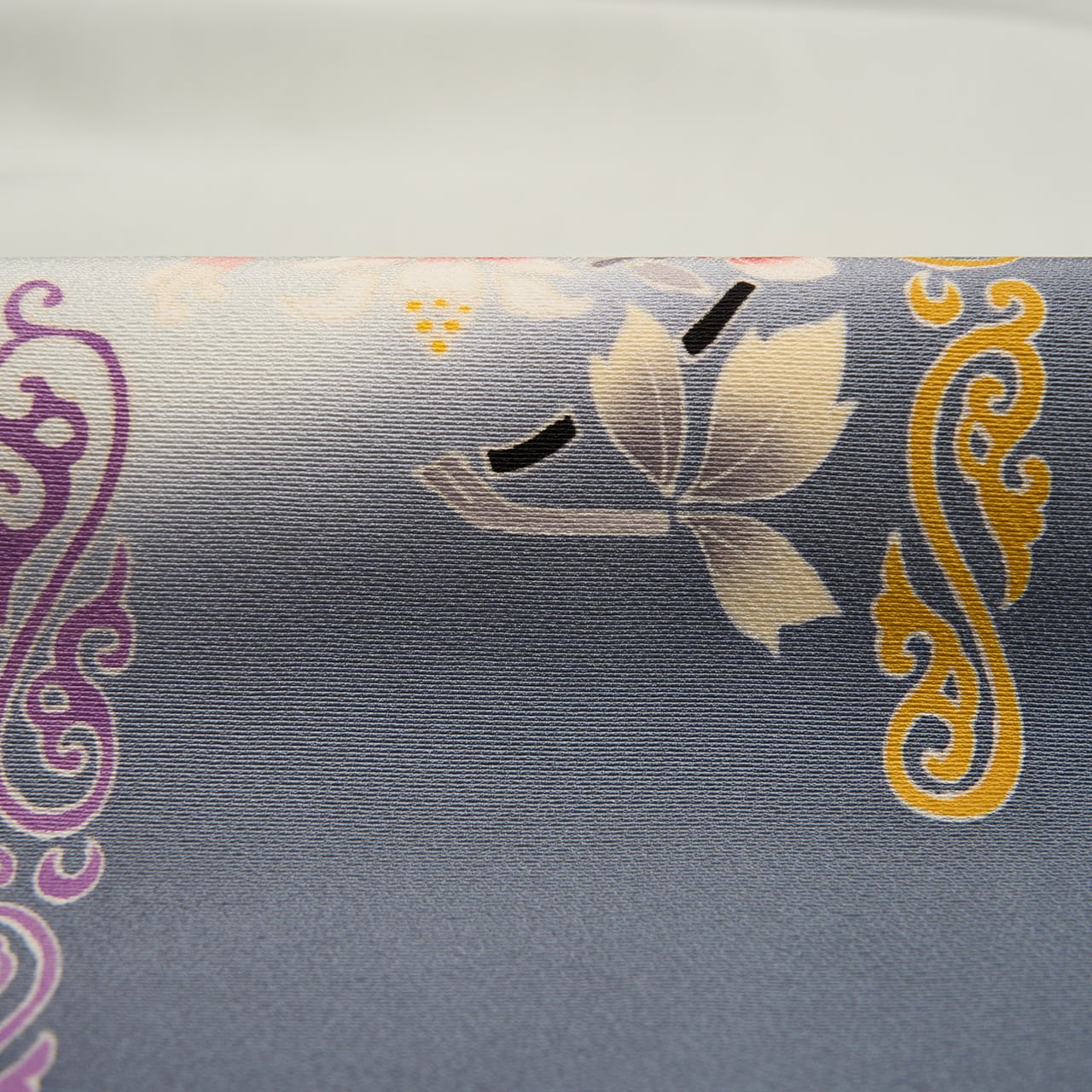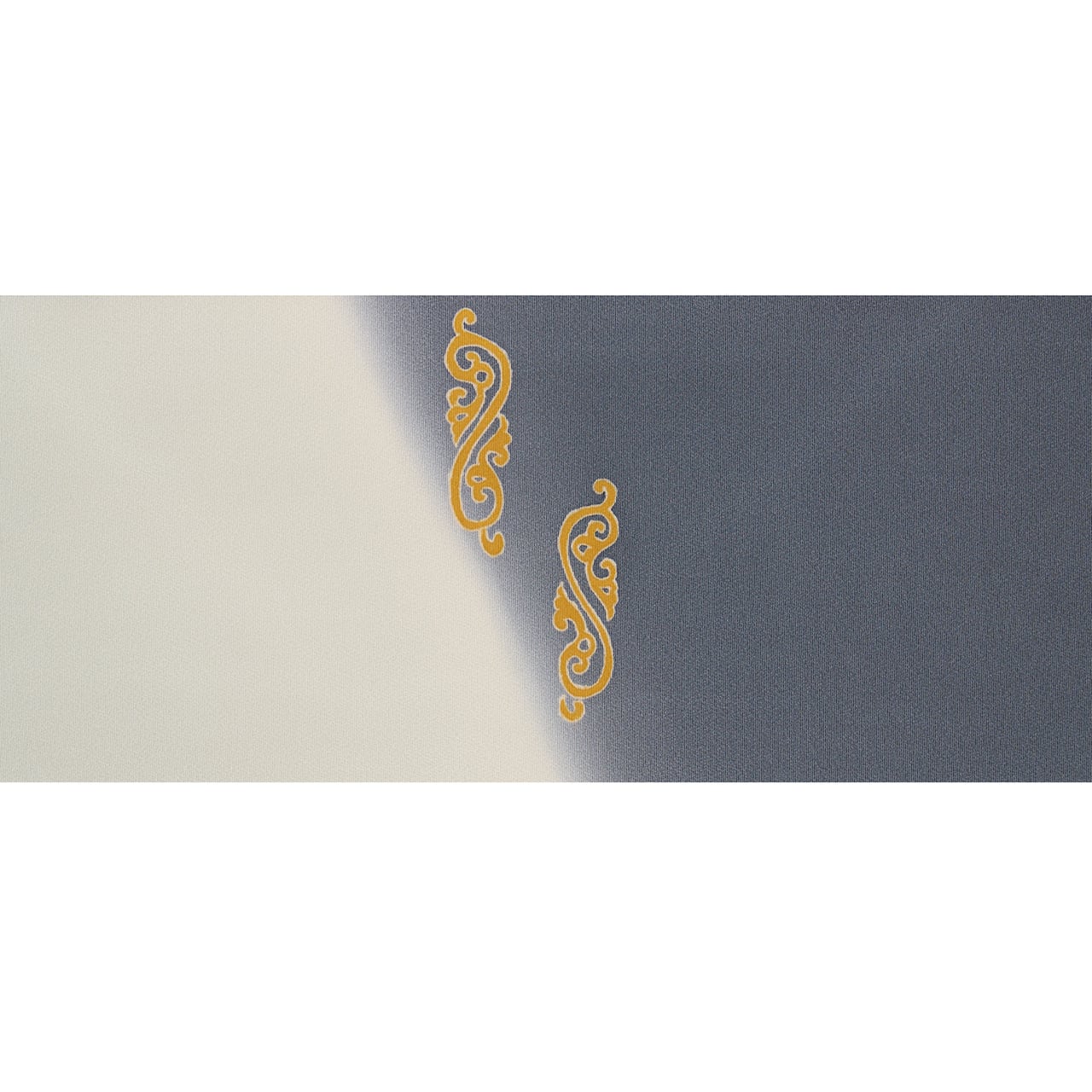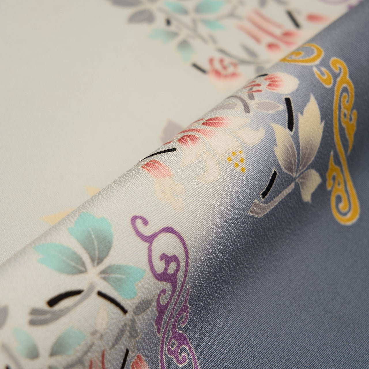 目の詰まったような一越ちりめんのしっかりとした生地が少し濃いグレー・鈍色に染められ、お太鼓の真ん中から明るい淡い水色がかった白・藍白色に斜めの暈しで染め分けられて、木朽葉色と古代紫色の蔓草の模様と、横には釣鐘型のお花と蔓草が手描きの友禅で描かれた、加賀友禅ならではの気品のある佇まいの素敵な九寸名古屋帯です。