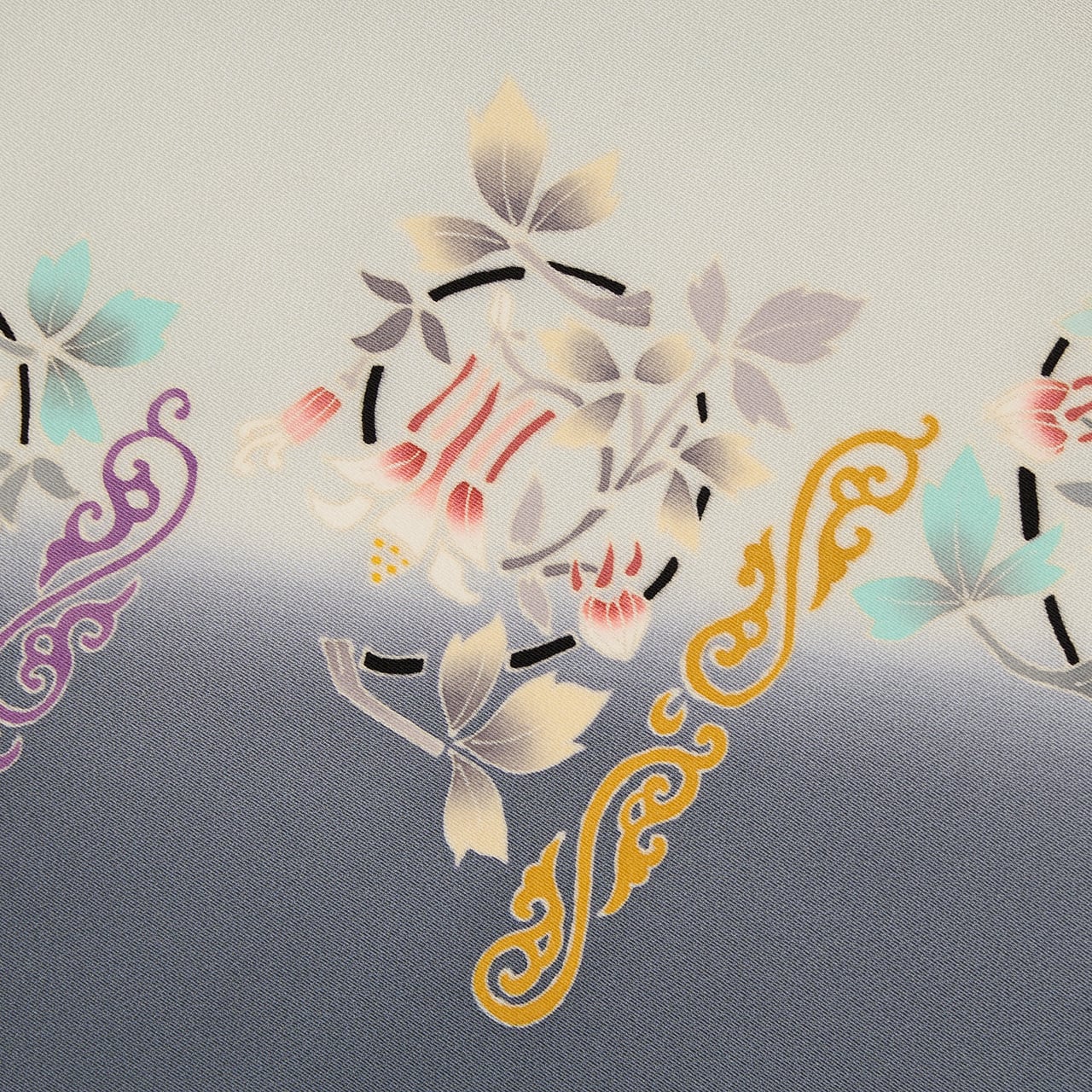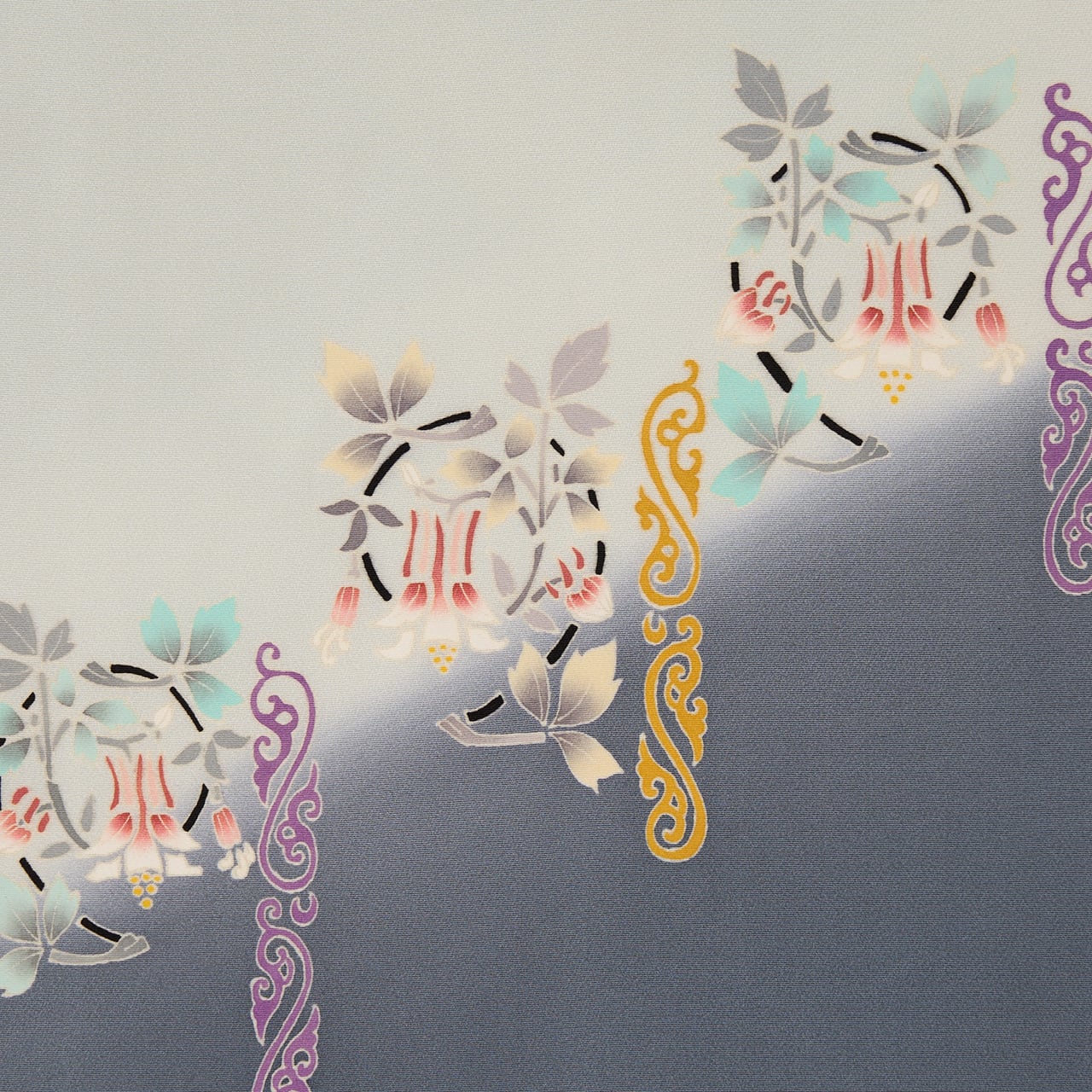 幾何学模様のようにディフォルメされた蔓草の模様の配置と、釣鐘型のお花のさりげない華やかさのある表現のバランスが良く、背景の暈しの境目に沿った模様の流れもとても美しく、モダンでセンスの良いお洒落な作品となっています。