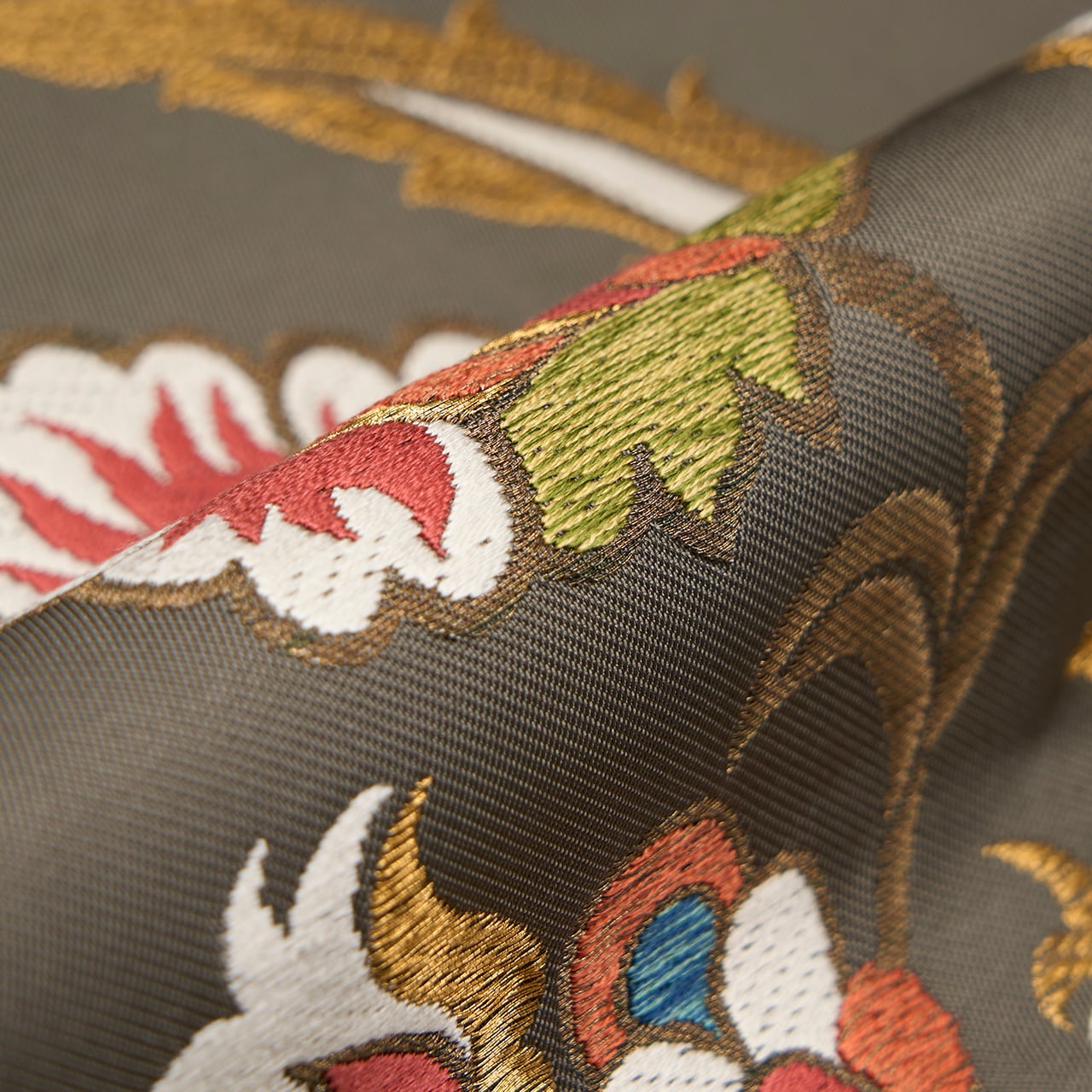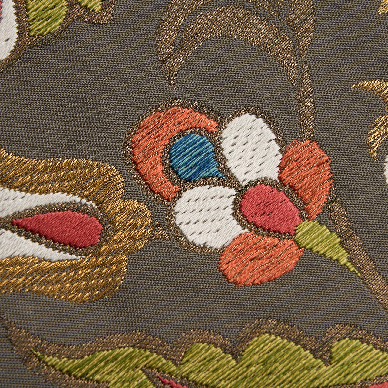 金糸は光沢のあるタイプのものと、少し燻したような光らないタイプのものが使い分けられていて、またしっかりとした手機で織られているため、くっきりとしたエッジの効いた模様の見え方となっています。