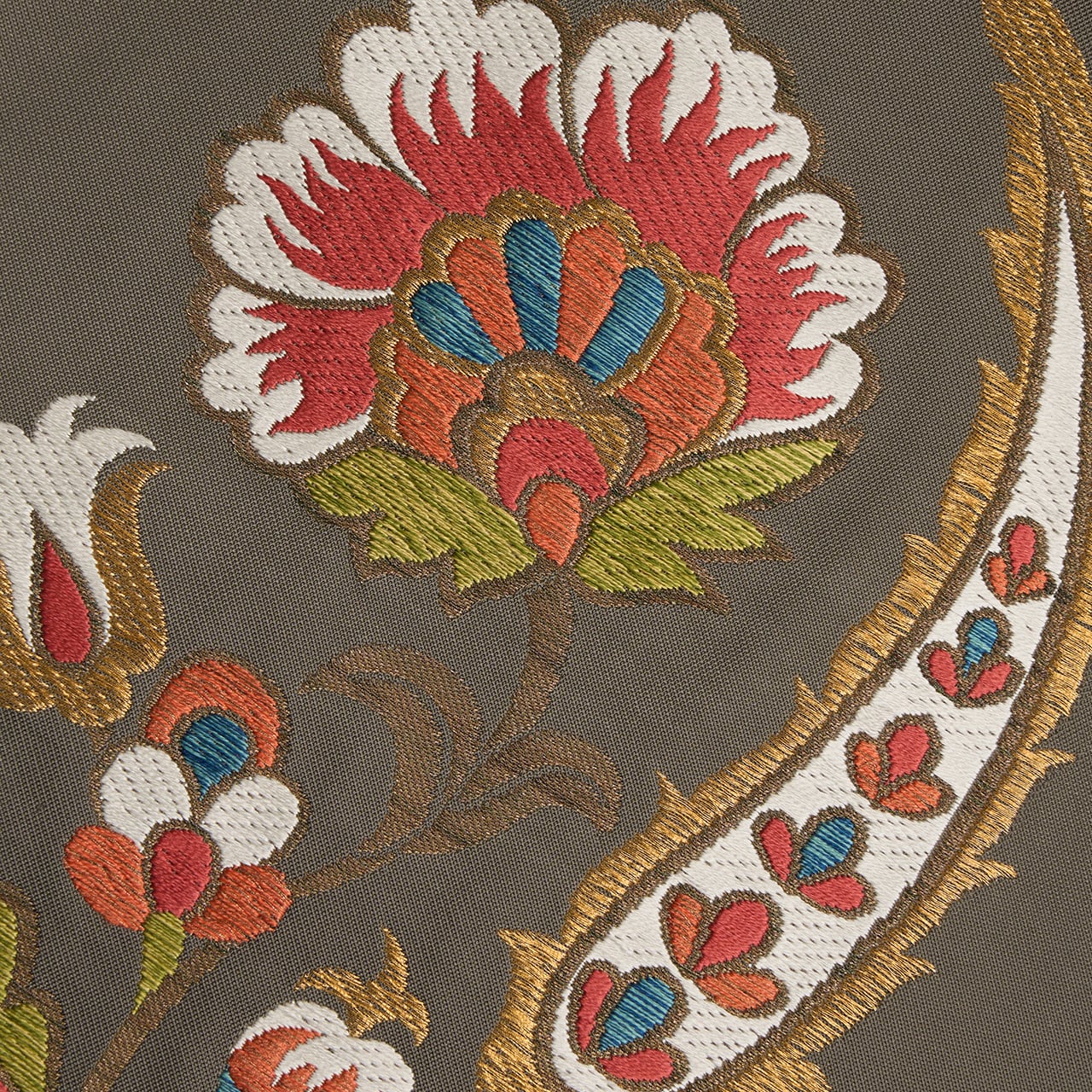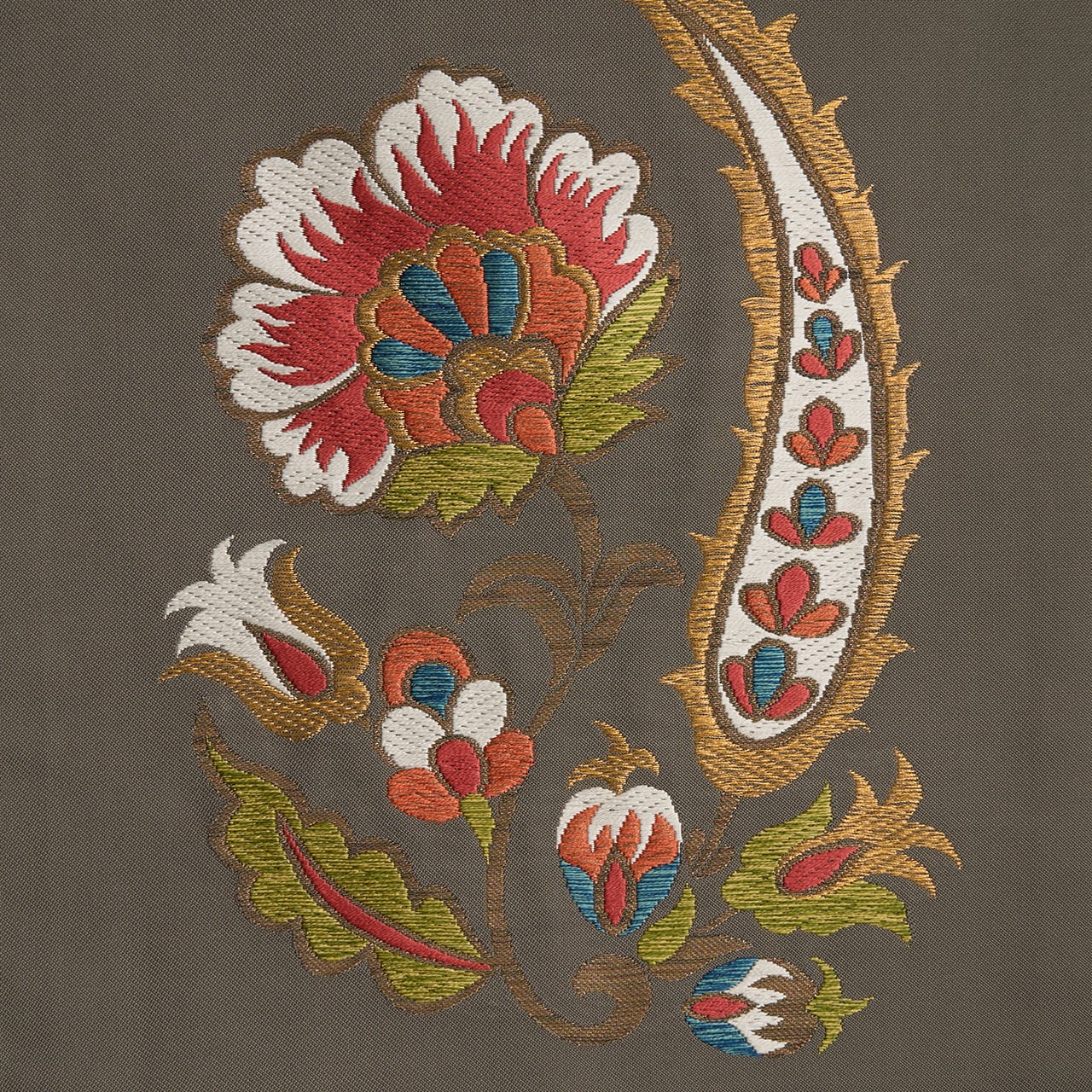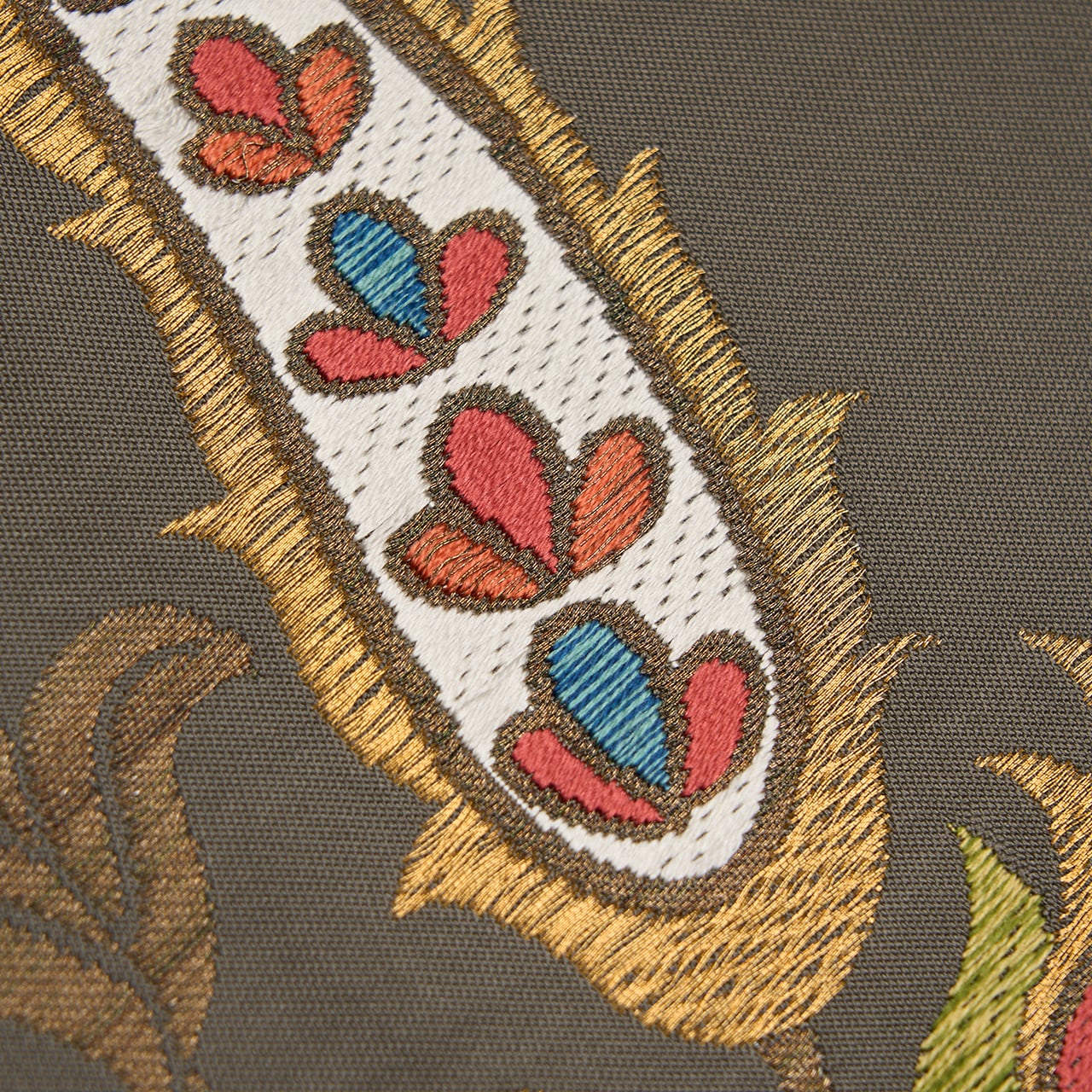 少しだけ赤味のあるグレー・煤色の地に、お太鼓には大きな唐花の模様が赤丹色や樺色、紺鼠色に金糸も交えながら華やかに織り出され、その傍らにはペイズリーのような形の中に小さなお花が並んだ蕾のようなものが織られた、躍動感の感じられる表現が楽しい九寸名古屋帯です。