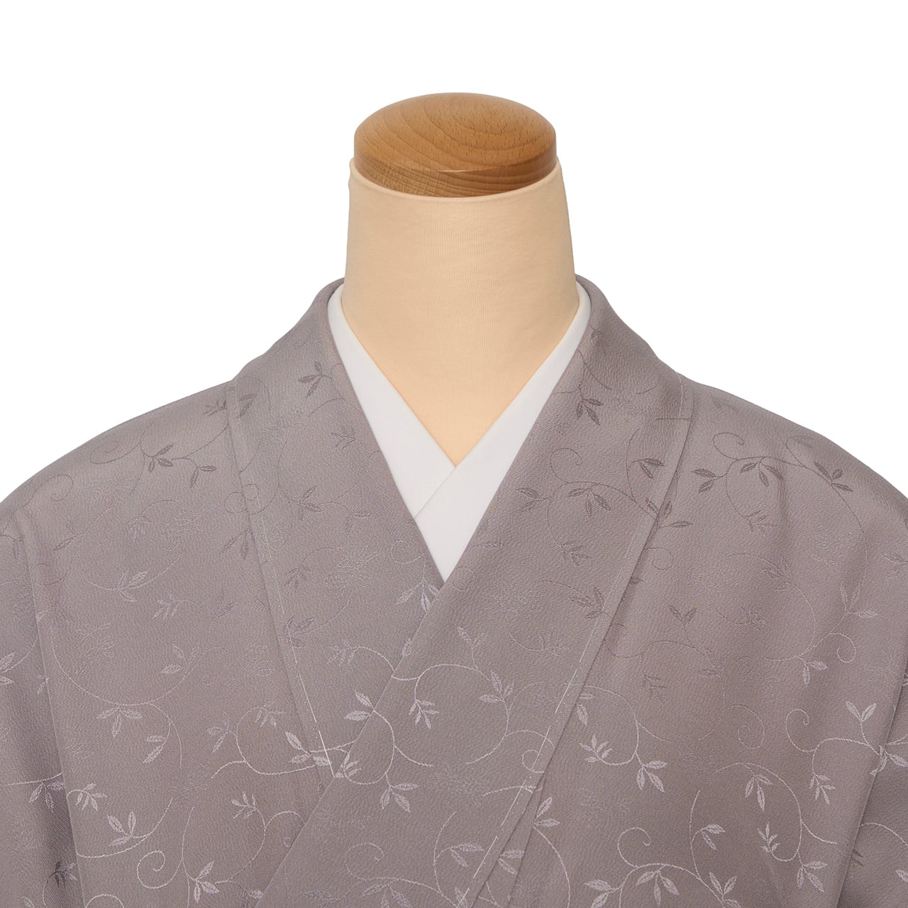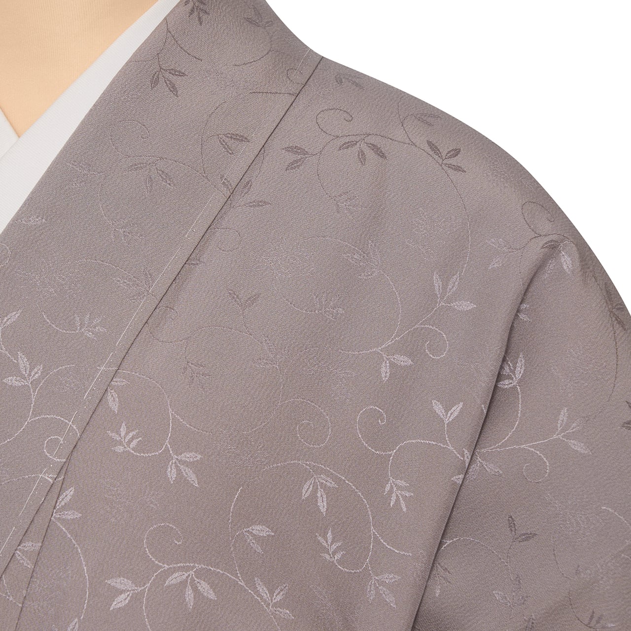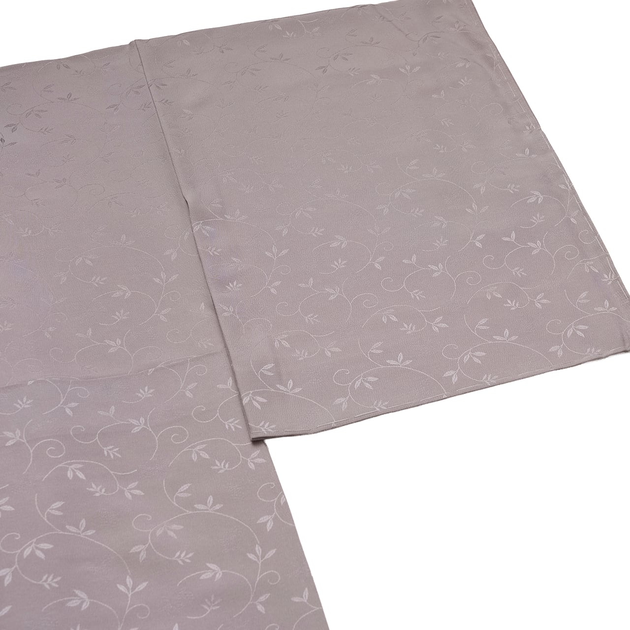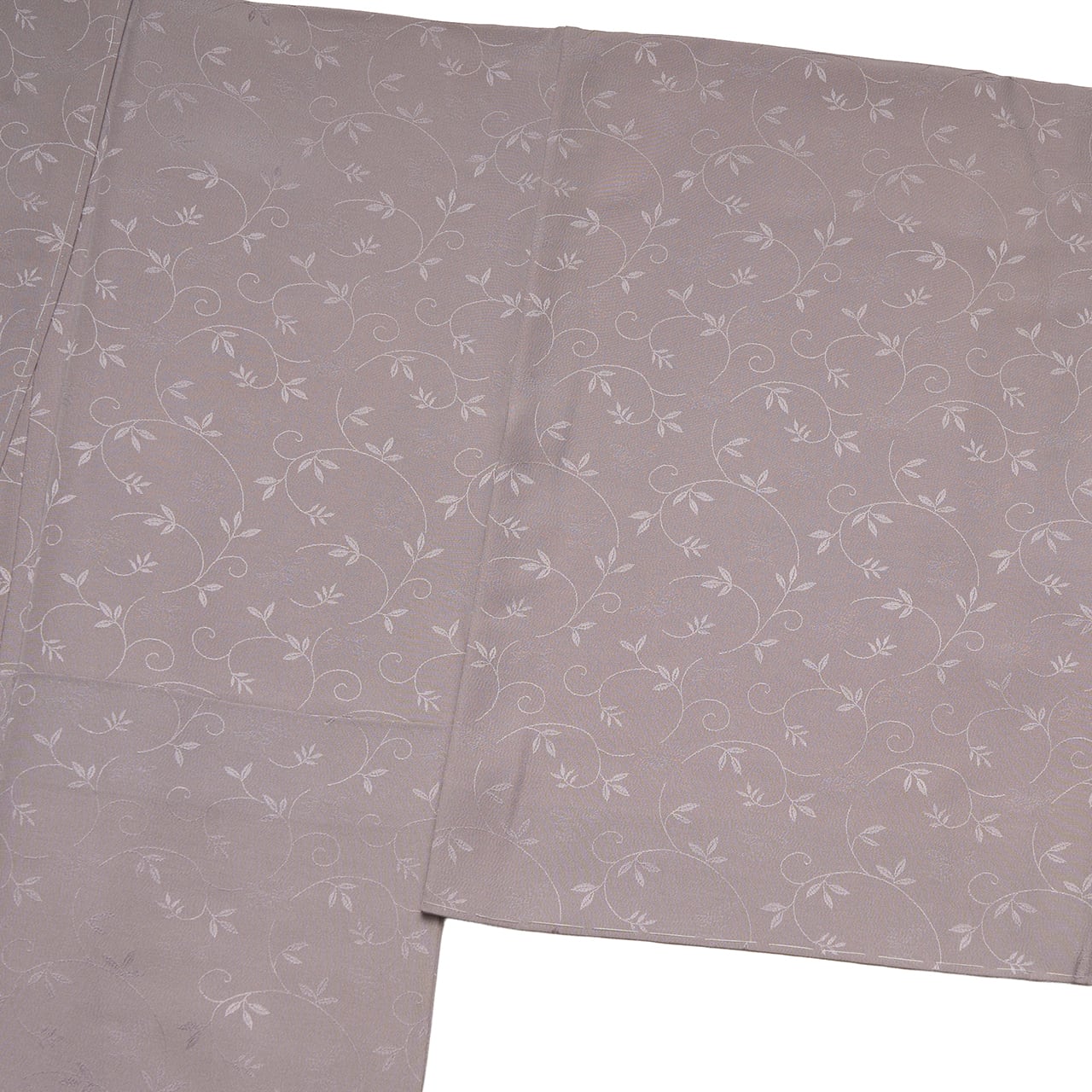 小さな葉っぱのついた蔓草の模様が全体に織り出された紋意匠の生地が、淡い薄紫・薄色に染められた、とても気品の感じられる素敵な地紋無地のお着物です。