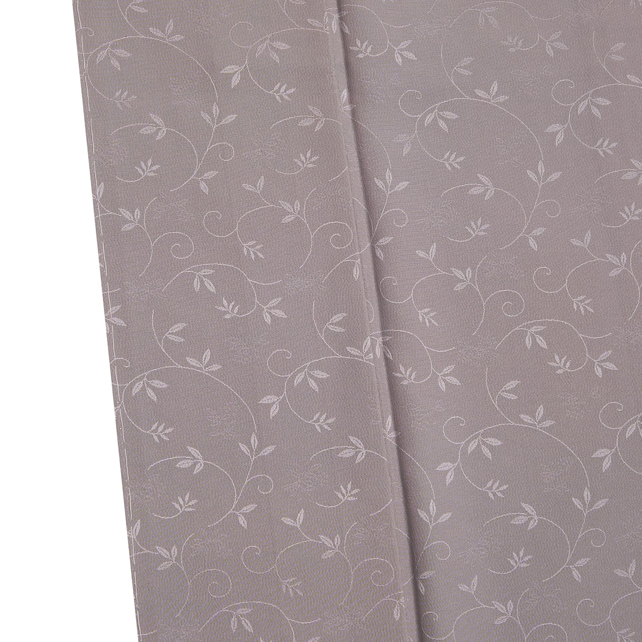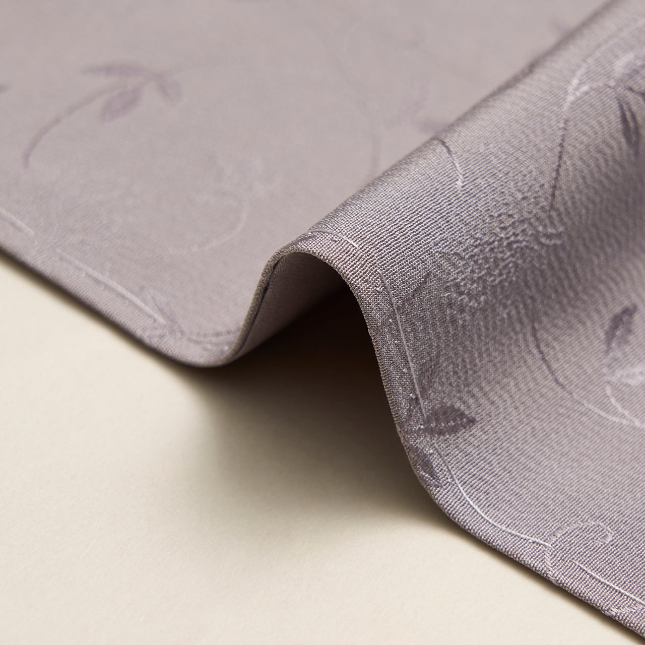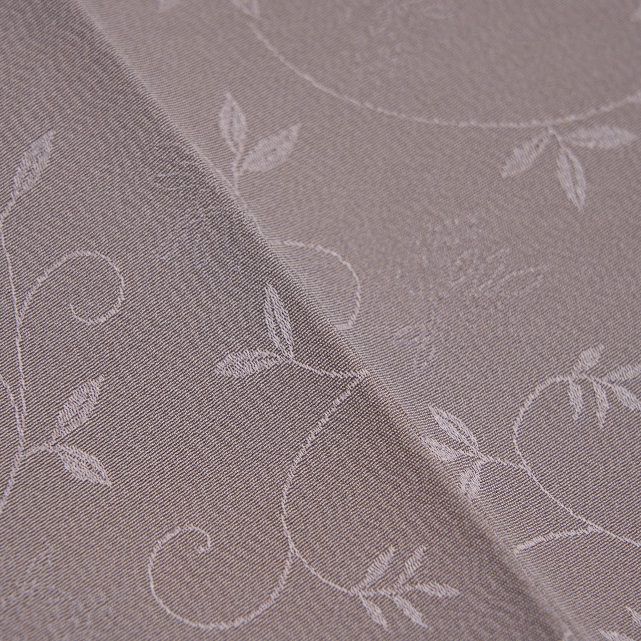 小さな葉っぱのついた蔓草の模様が全体に織り出された紋意匠の生地が、淡い薄紫・薄色に染められた、とても気品の感じられる素敵な地紋無地のお着物です。