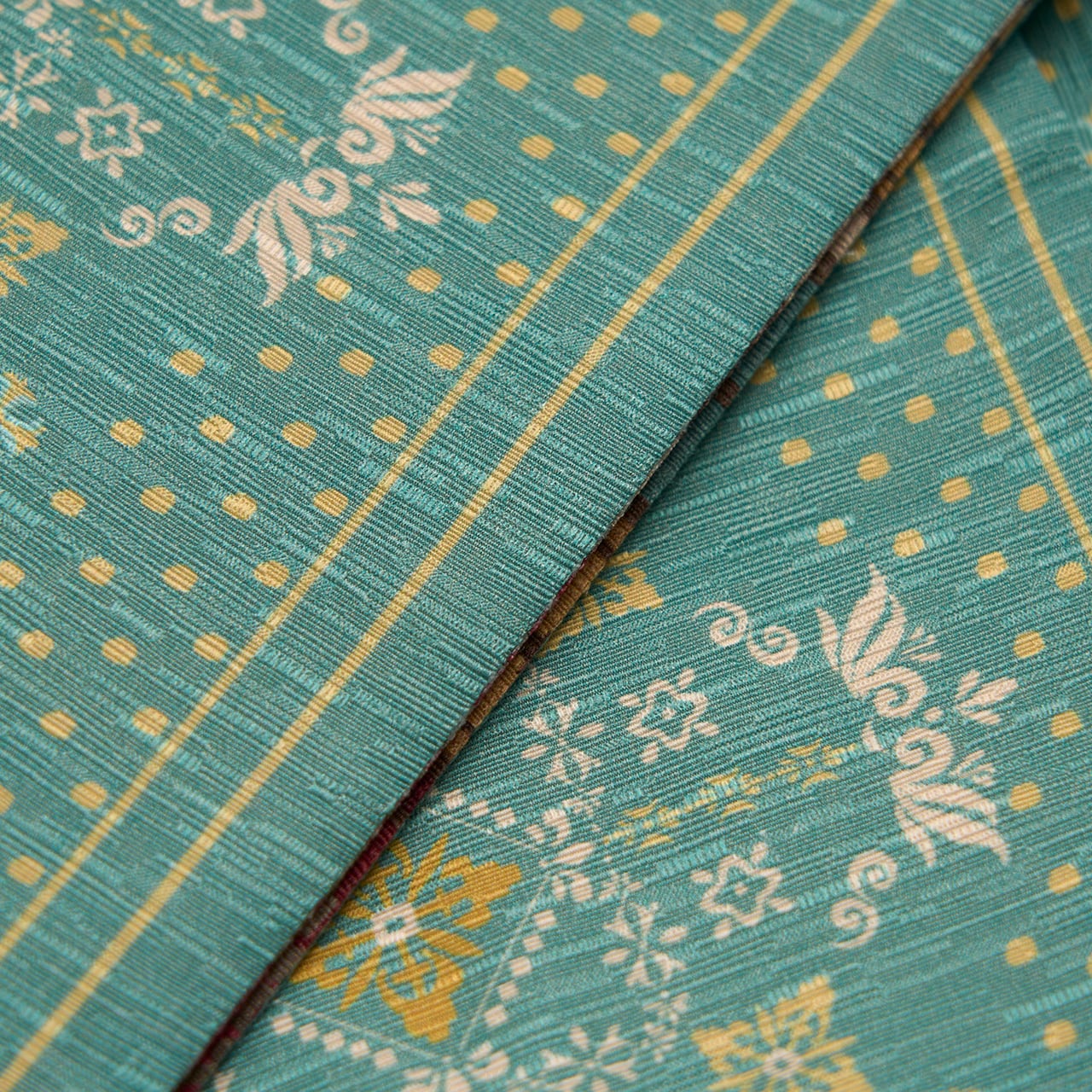 横縞のような地模様のある、シャリっとした質感の生地が淡いグリーン・木賊色に染められ、両端は縞で縁取られ、その内側には水玉が並んで、中にはメダリオンにお花や小鳥の羽根のような模様などで装飾をされた、とてもお洒落な雰囲気の半幅帯です。
