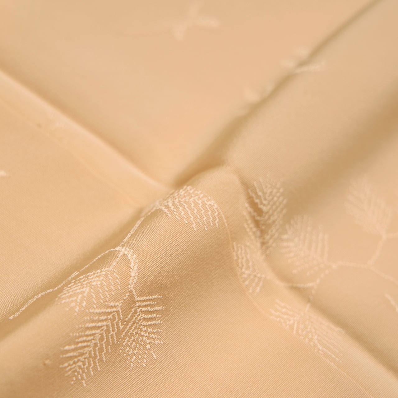若松、紅葉、草花に鳥が飛ぶ姿など、有名な正倉院文様が地紋となった、少しオレンジ味のある黄色・雄黄色の紋意匠の生地でお仕立てをされた、綺麗な色合いが魅力的な地紋無地のお着物です。
