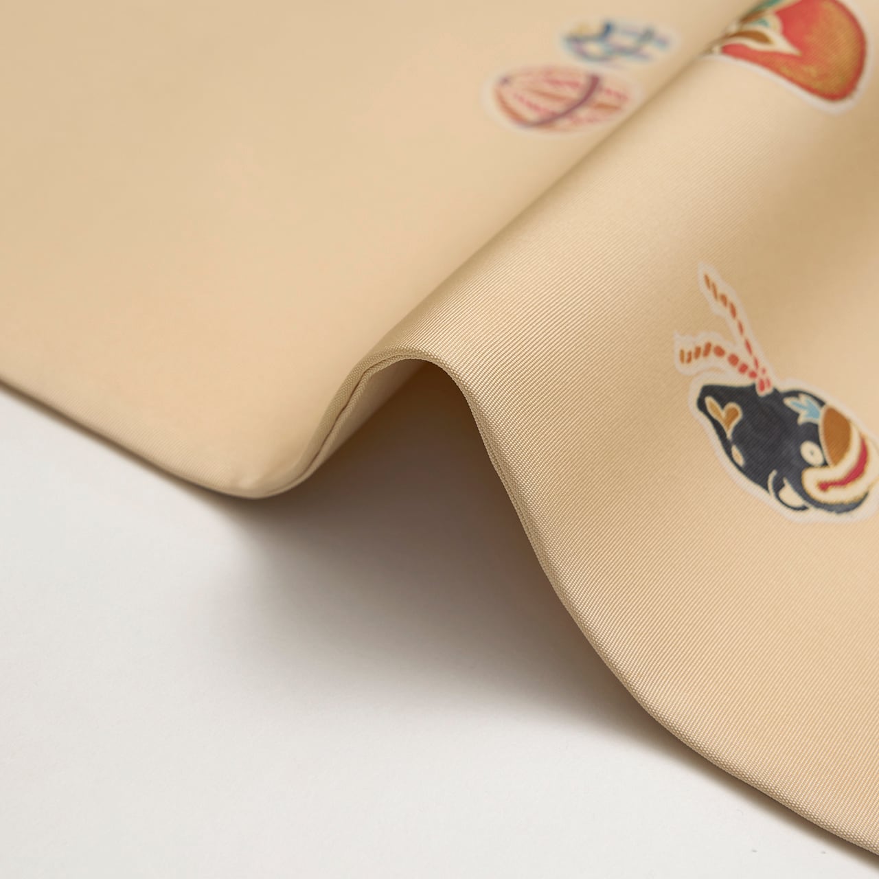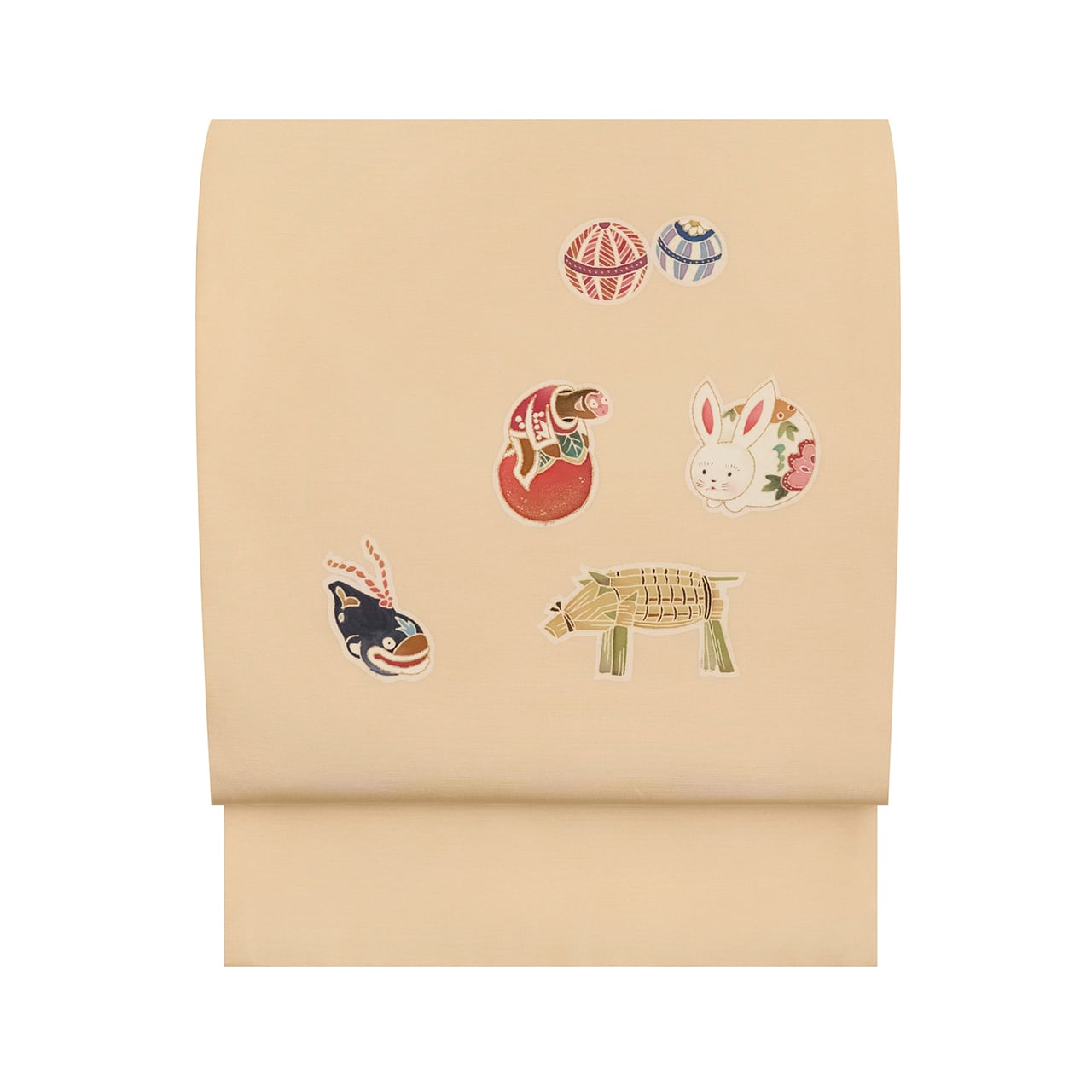 しっかりとした質感の塩瀬の生地が明るく淡いベージュ・薄卵色に染められ、お太鼓には猿と柿やうさぎの人形、ナマズの土鈴、藁のイノシシなどの玩具が手描きの友禅で楽しく描かれた、素敵な九寸名古屋帯です。