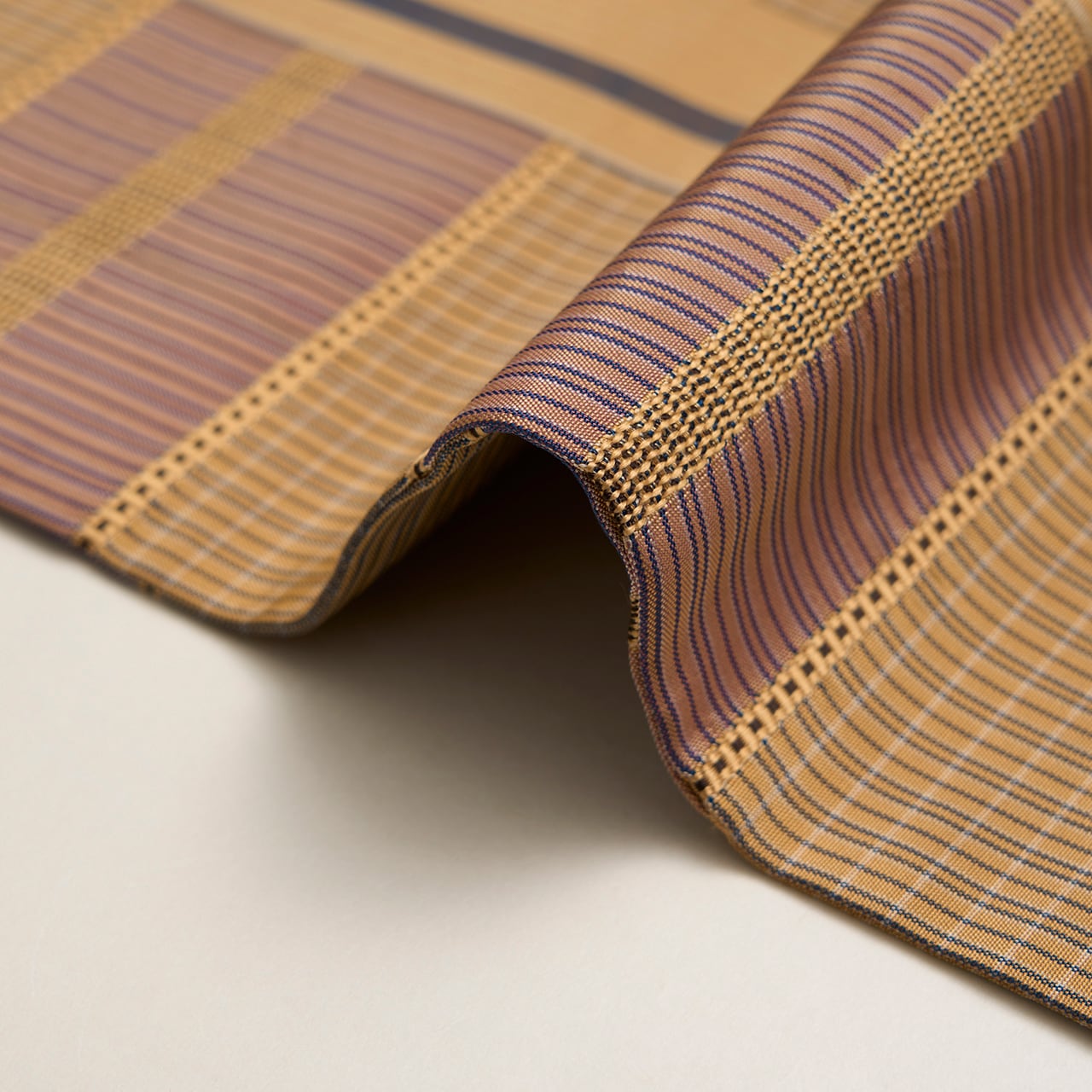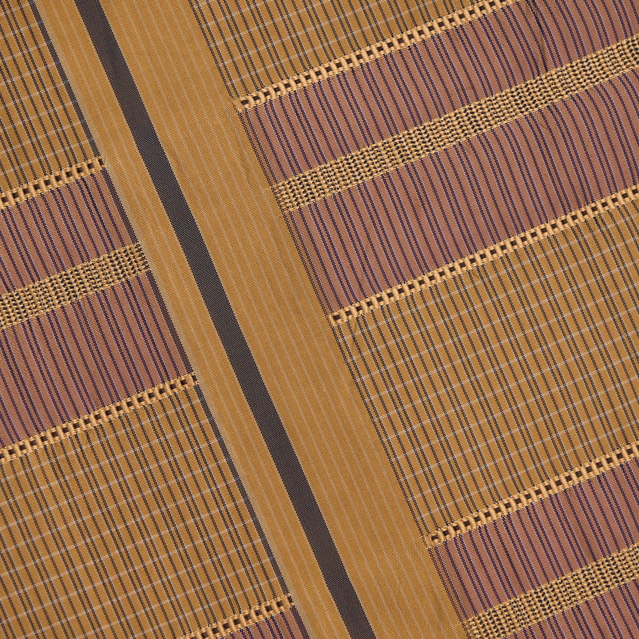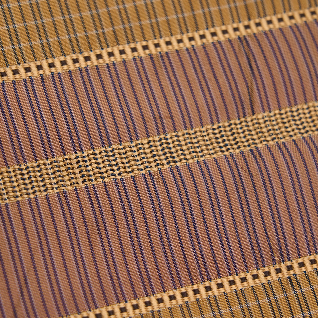 明るく少し黄色味のある薄茶・枇杷茶色をベースにして、お太鼓の中心よりやや左寄りに取られた太い無地の中に一本紅消鼠色の縞が走り、その両側には同じ色合いの細かい縞に、鴇浅葱色の段が段変わりに取られ、その間には浮き織の模様が織り込まれた、間道手でありながらも凝った九寸名古屋帯です。