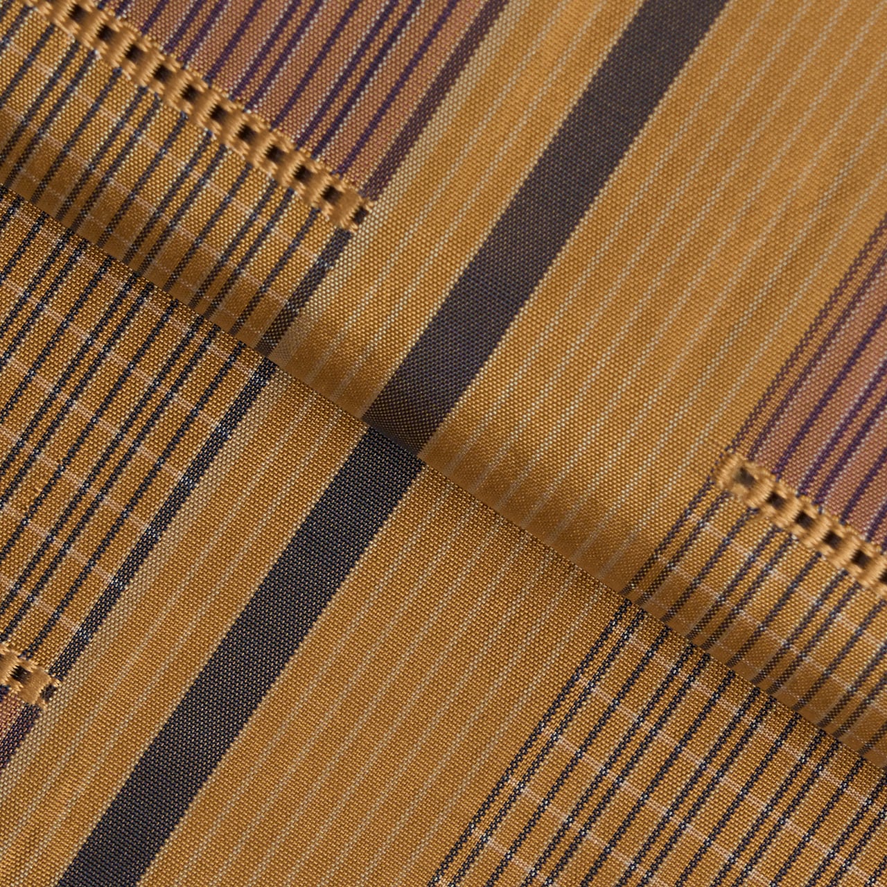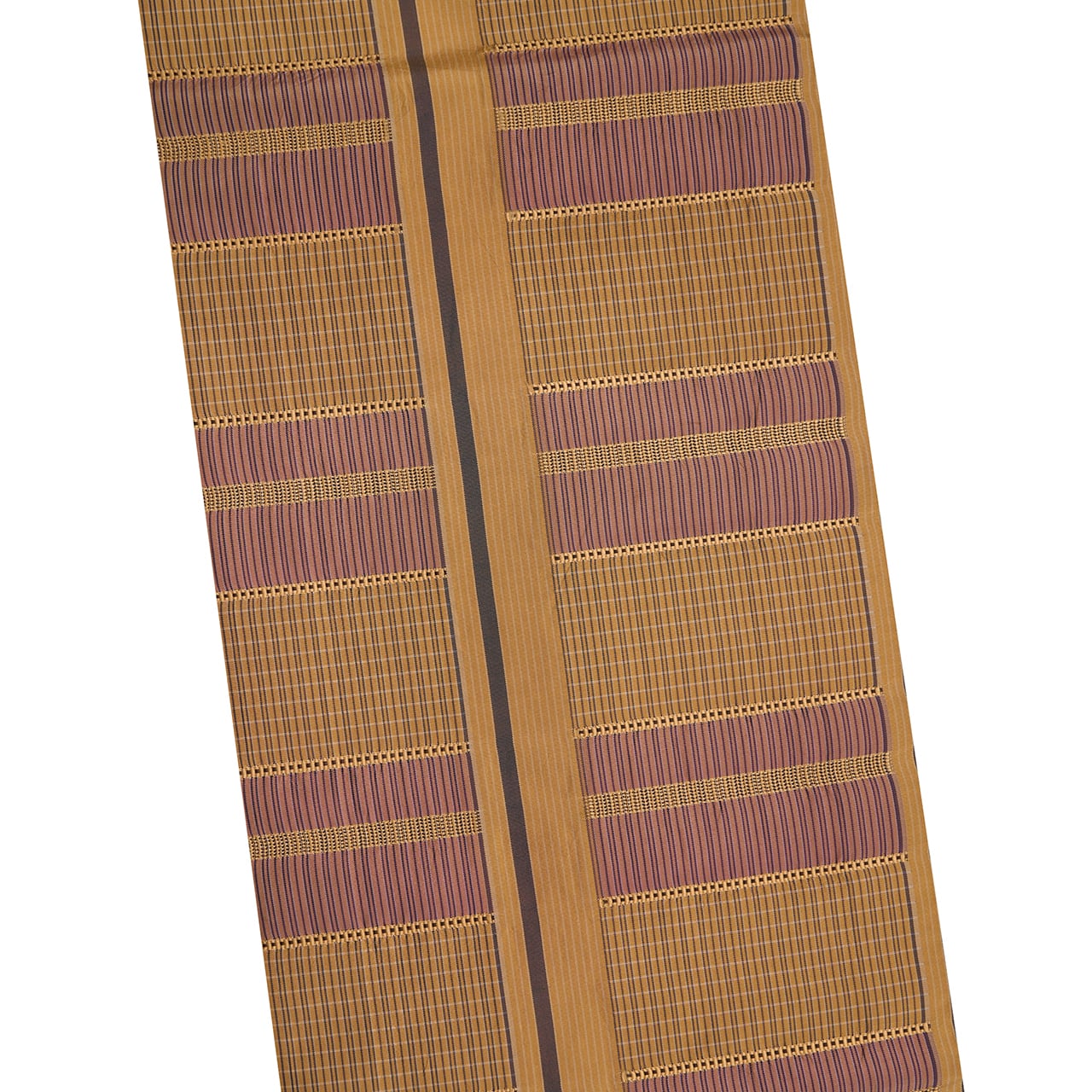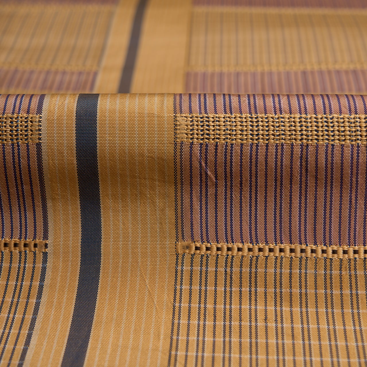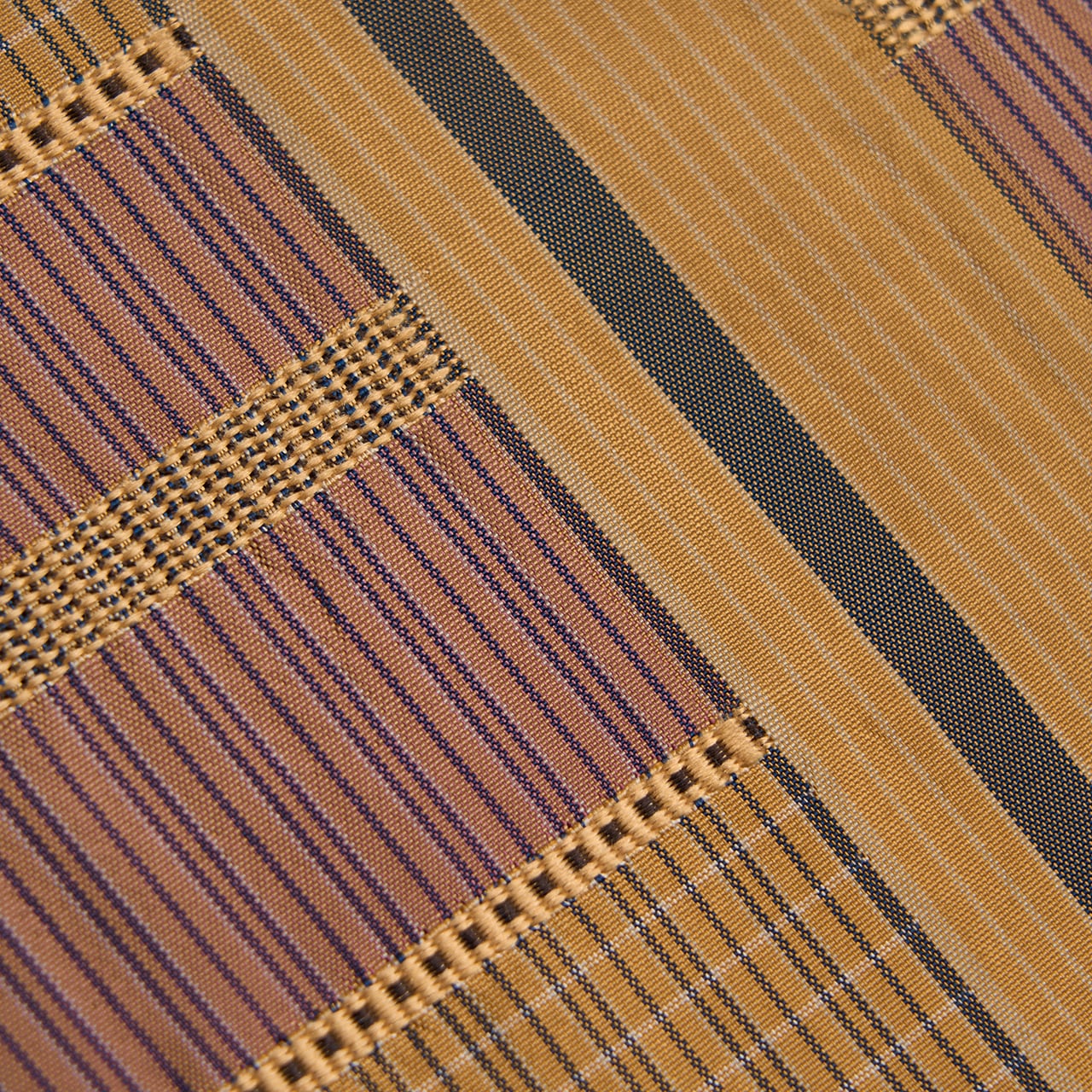 明るく少し黄色味のある薄茶・枇杷茶色をベースにして、お太鼓の中心よりやや左寄りに取られた太い無地の中に一本紅消鼠色の縞が走り、その両側には同じ色合いの細かい縞に、鴇浅葱色の段が段変わりに取られ、その間には浮き織の模様が織り込まれた、間道手でありながらも凝った九寸名古屋帯です。