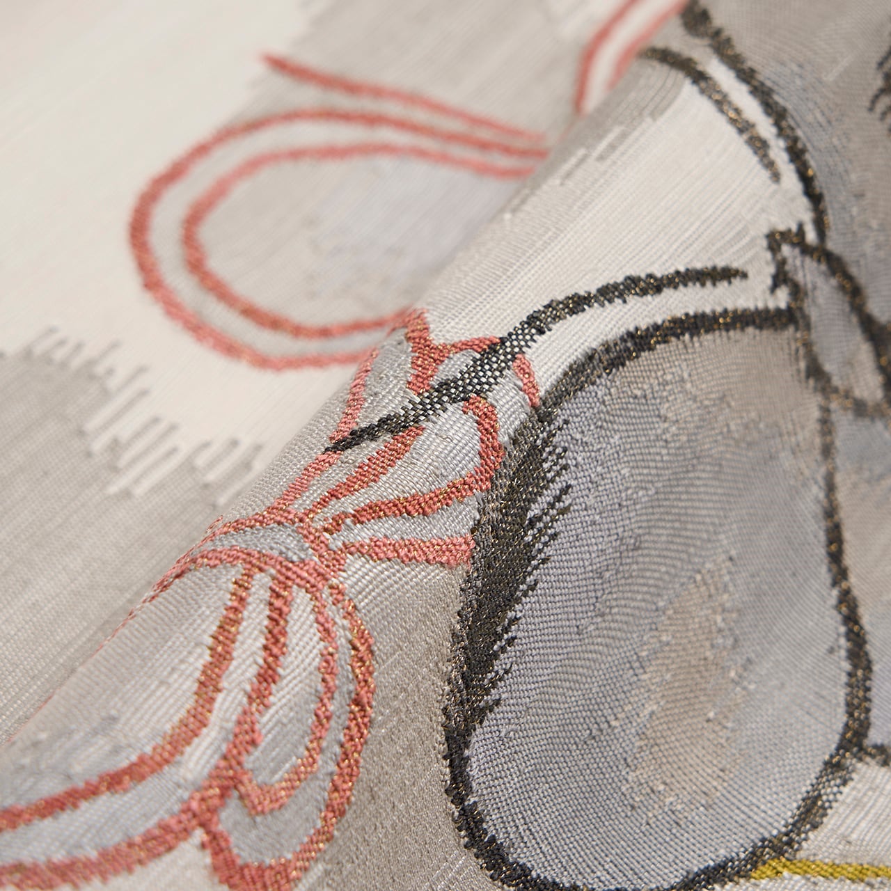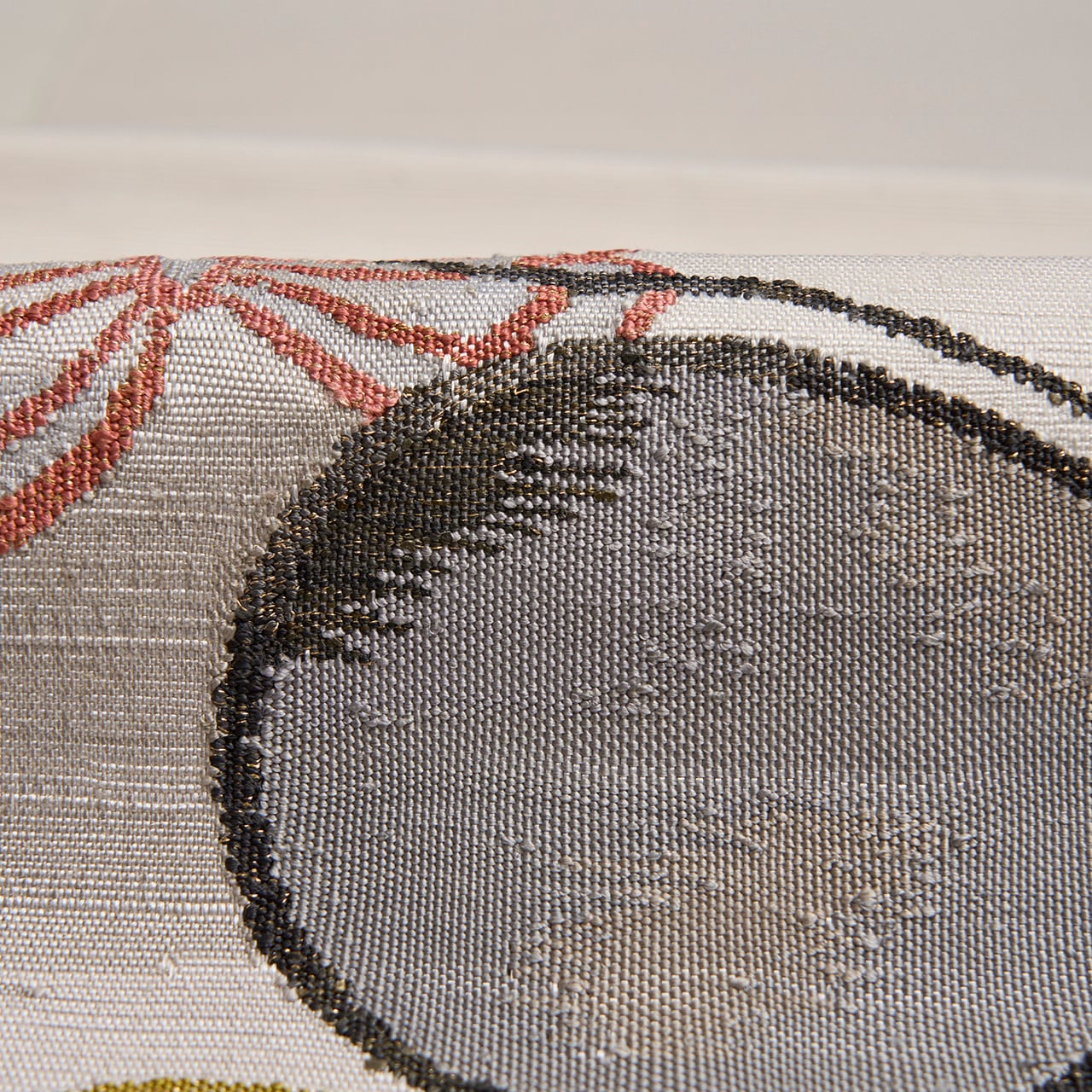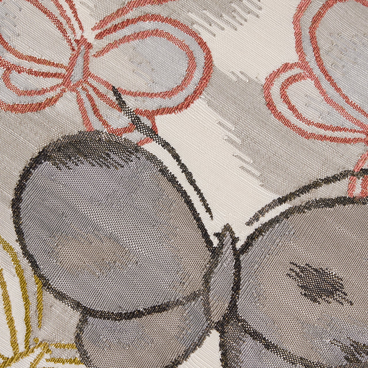 緯糸がやや強い質感の生成り色の紬地に、お太鼓には淡いグレー・潤色で霞のような模様が取られ、それを背景にして鈍色や蘇芳色の朱色、草色などの糸で大きく舞うような蝶々の姿が手機のすくい織でしっかりと織り出された、とても爽やかな印象の八寸名古屋帯です。