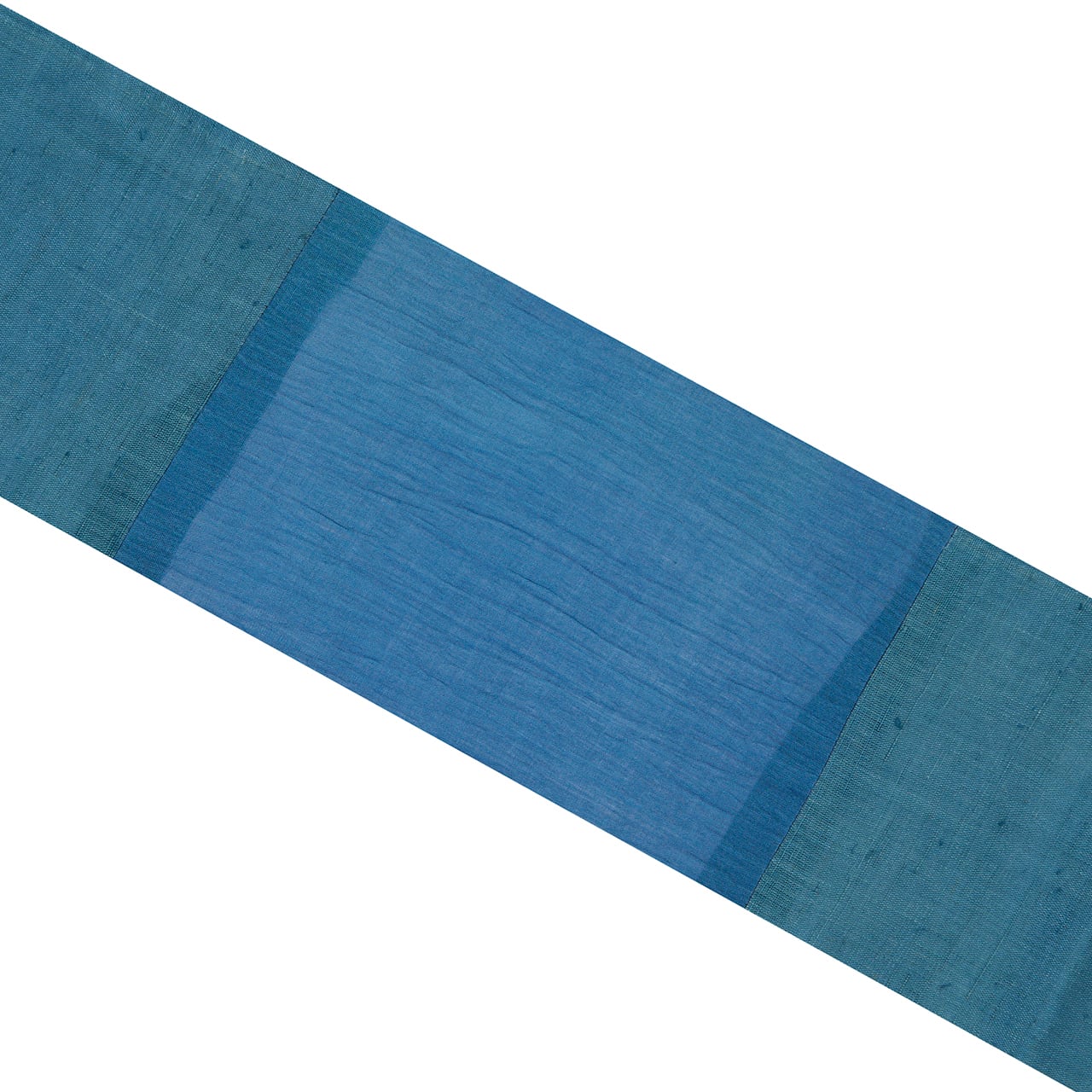 経緯手績みの麻の糸で織られた、さらっとした生地が本藍染で染められているようで、透明感のある明るい藍色に、お太鼓には上向きと下向きの矢印のような模様が絞り染めで表された、とてもお洒落な雰囲気の夏の九寸名古屋帯です。