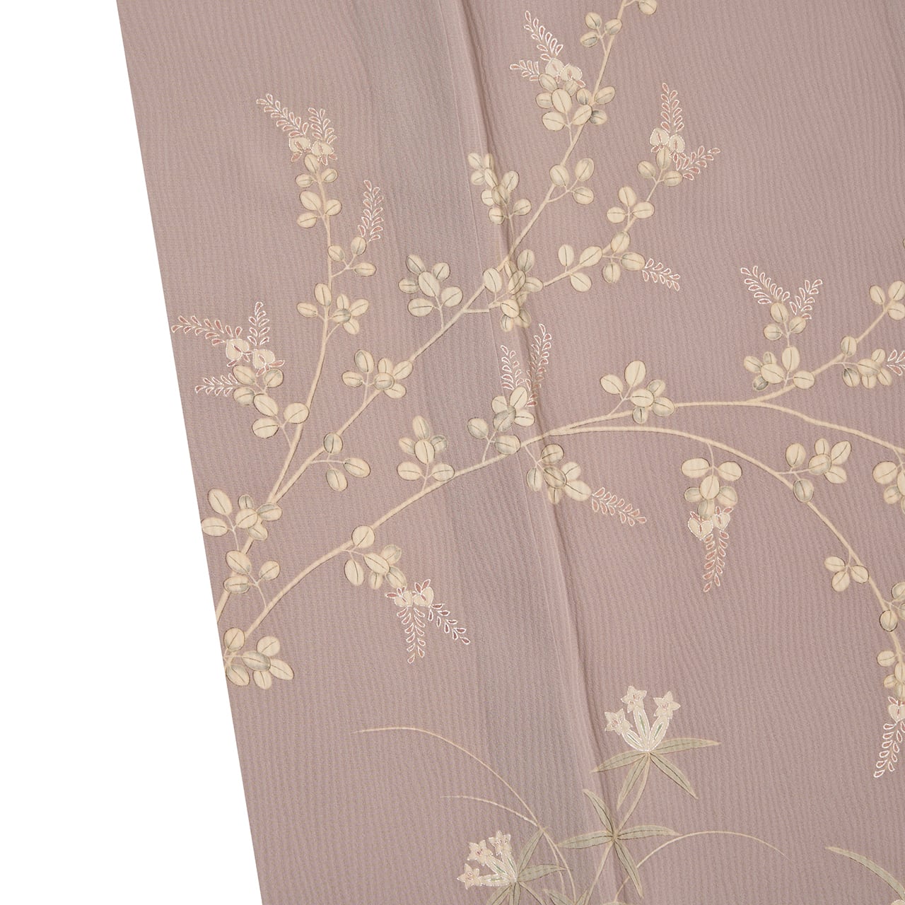 縦にうねうねとしたよろけ縞のような地模様のある楊柳の生地が、グレー味のある薄紫・鳩羽鼠色に染められ、上前や後身頃、袖などに、枝を伸ばして咲く萩、菖蒲、竜胆、桔梗などの草花が手描きの友禅でのびのびと描かれ、萩のお花には浅蘇芳色のピンクで彩色されていたり、菖蒲や竜胆などの葉には青磁色のような緑・柳鼠色で色付けされていたりして、さりげない華やかさも感じられる、とても素敵な単衣の附下のお着物です。