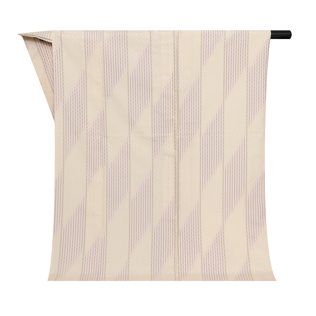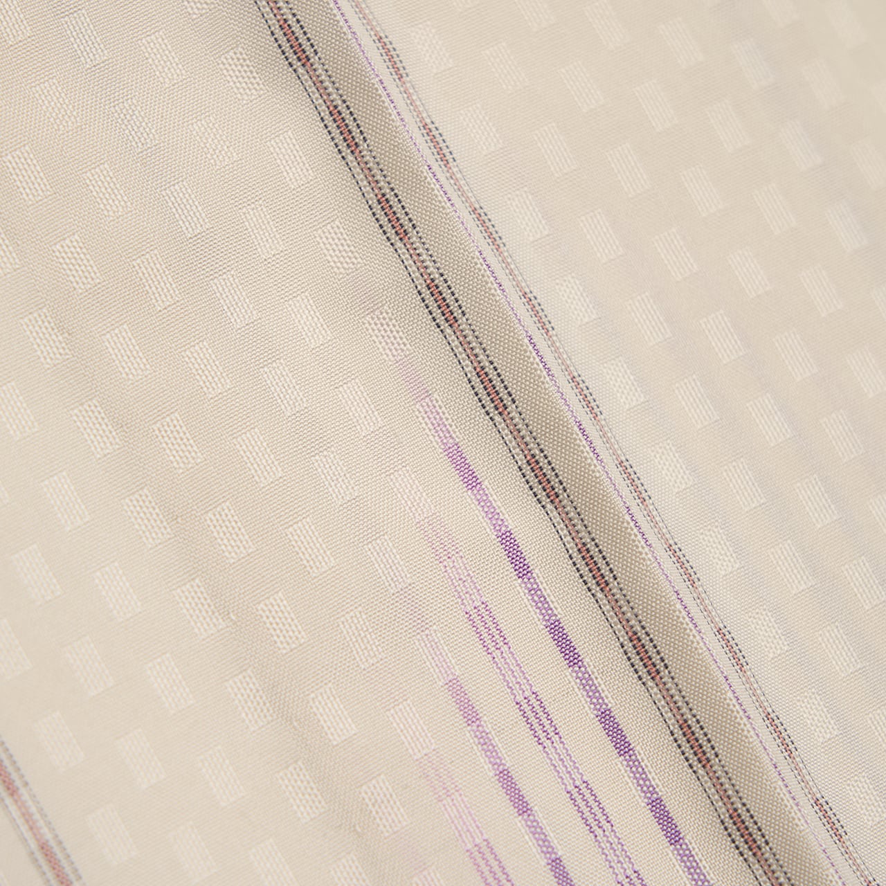 光沢のある綺麗な生成り色の細かい市松の綾織にされた地に、黒の細い縞が2本引かれ、その中には甚三紅色のピンクの糸が絣縞となって織り込まれ、その等間隔に配置された細い縞の間を綺麗な深い紫・蒲葡色の縞が絣で括られたものが、斜めに流れるような形の四角が市松の配置に織り出された、とてもお洒落な単衣のお着物です。