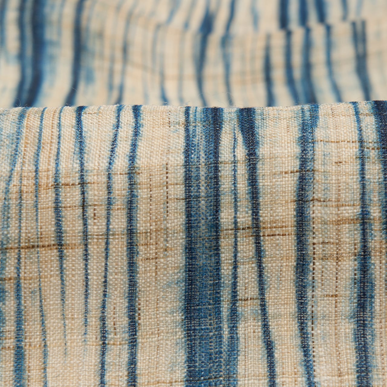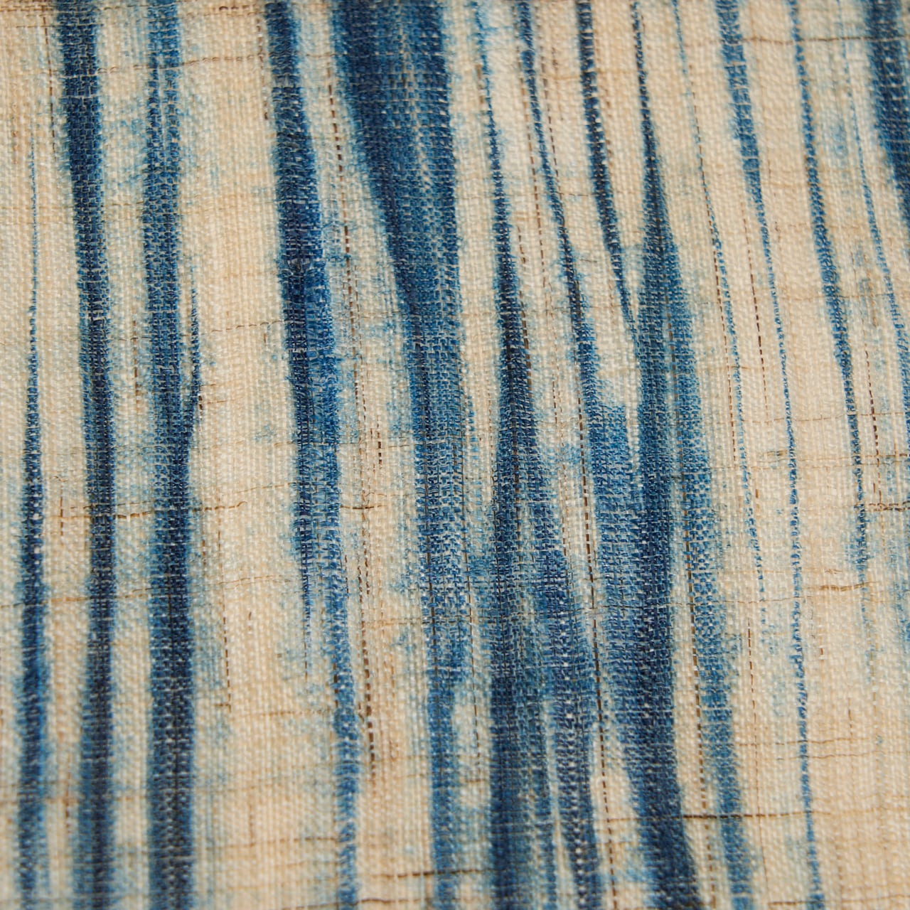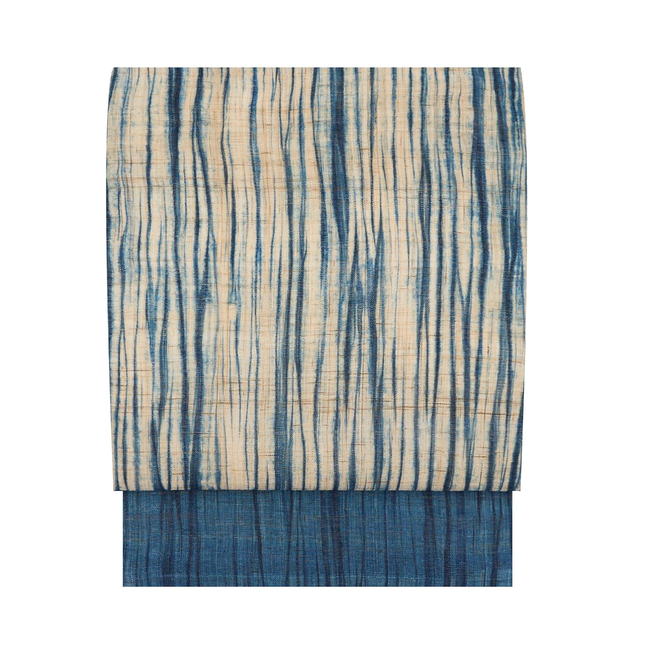 ところどころに濃い色の麻糸が混じったような味わいのある、経緯手績みの苧麻の麻の生地に、縦に変則的なシワのような線が藍染で表された、絞り染めで偶発的に現れる模様が面白く、野趣に富んだ雰囲気に素朴さの感じられる素敵な九寸名古屋帯です。