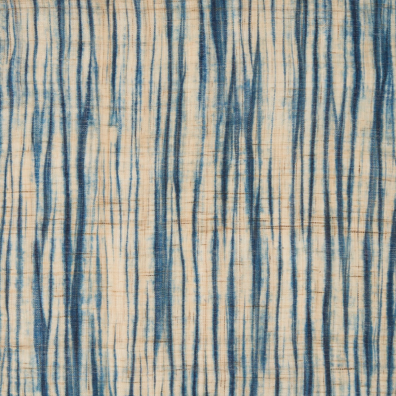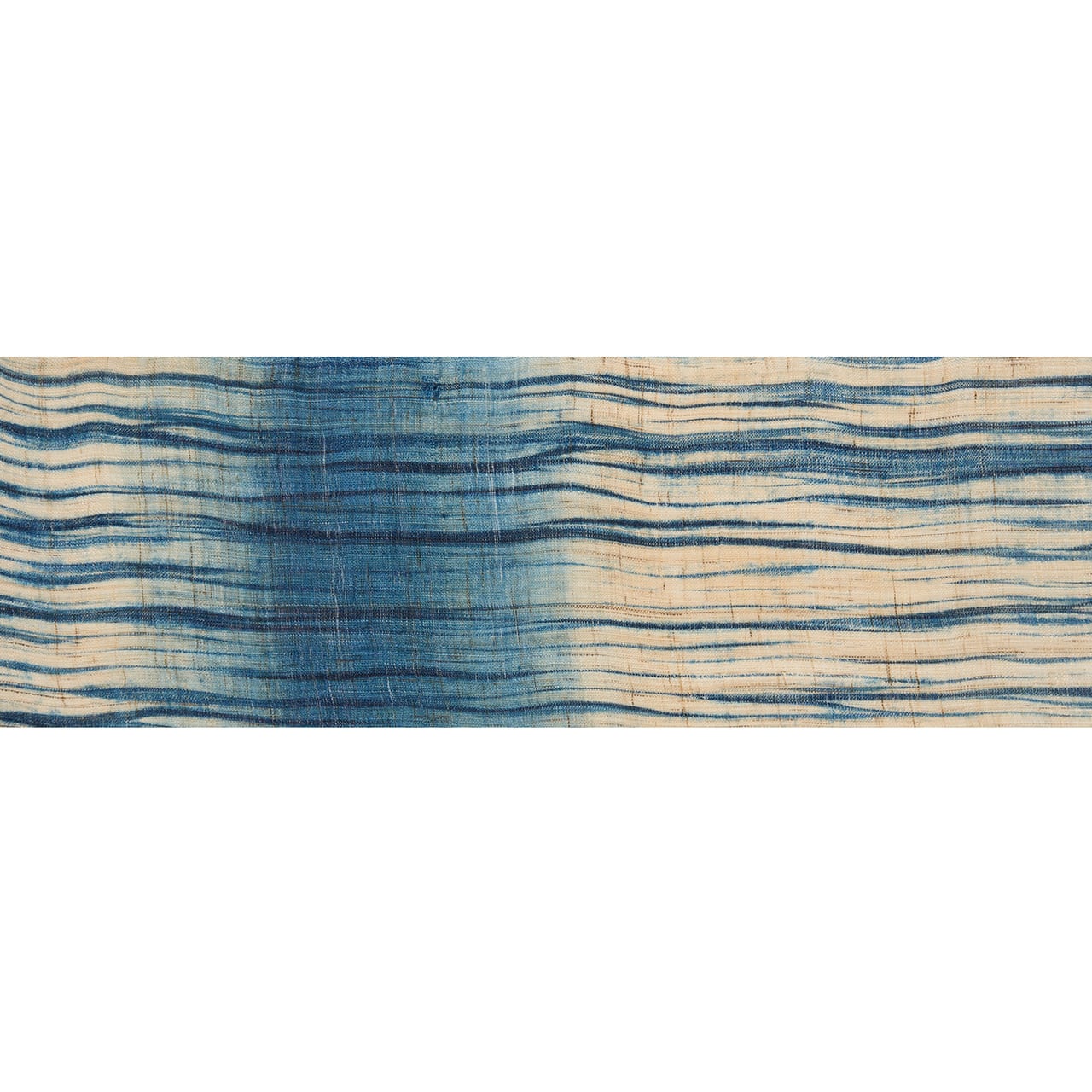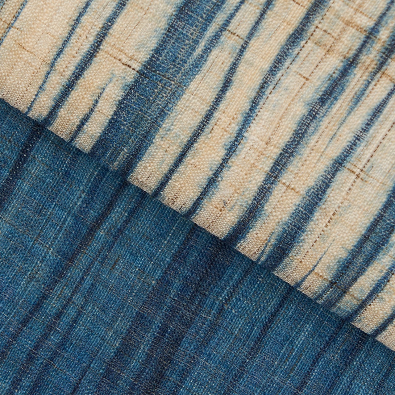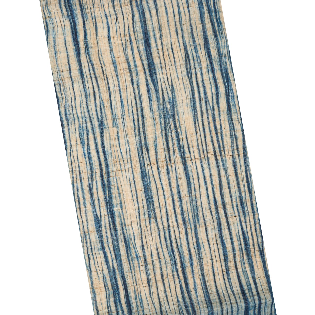 ところどころに濃い色の麻糸が混じったような味わいのある、経緯手績みの苧麻の麻の生地に、縦に変則的なシワのような線が藍染で表された、絞り染めで偶発的に現れる模様が面白く、野趣に富んだ雰囲気に素朴さの感じられる素敵な九寸名古屋帯です。