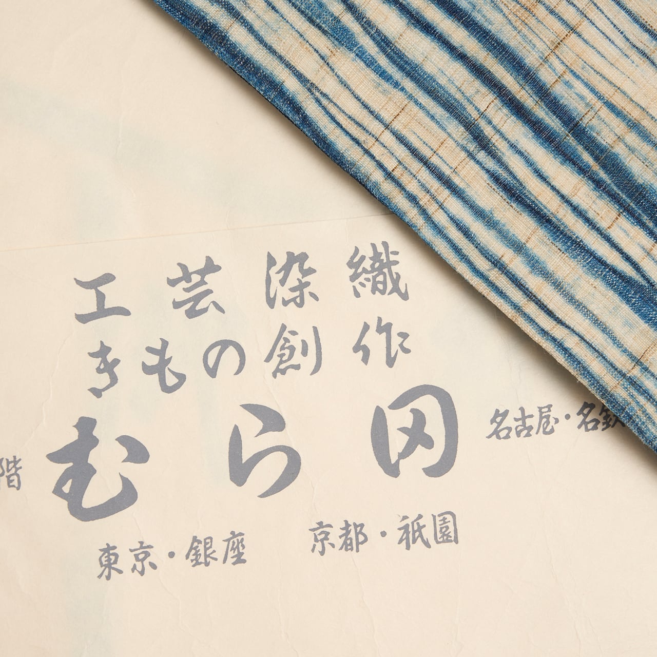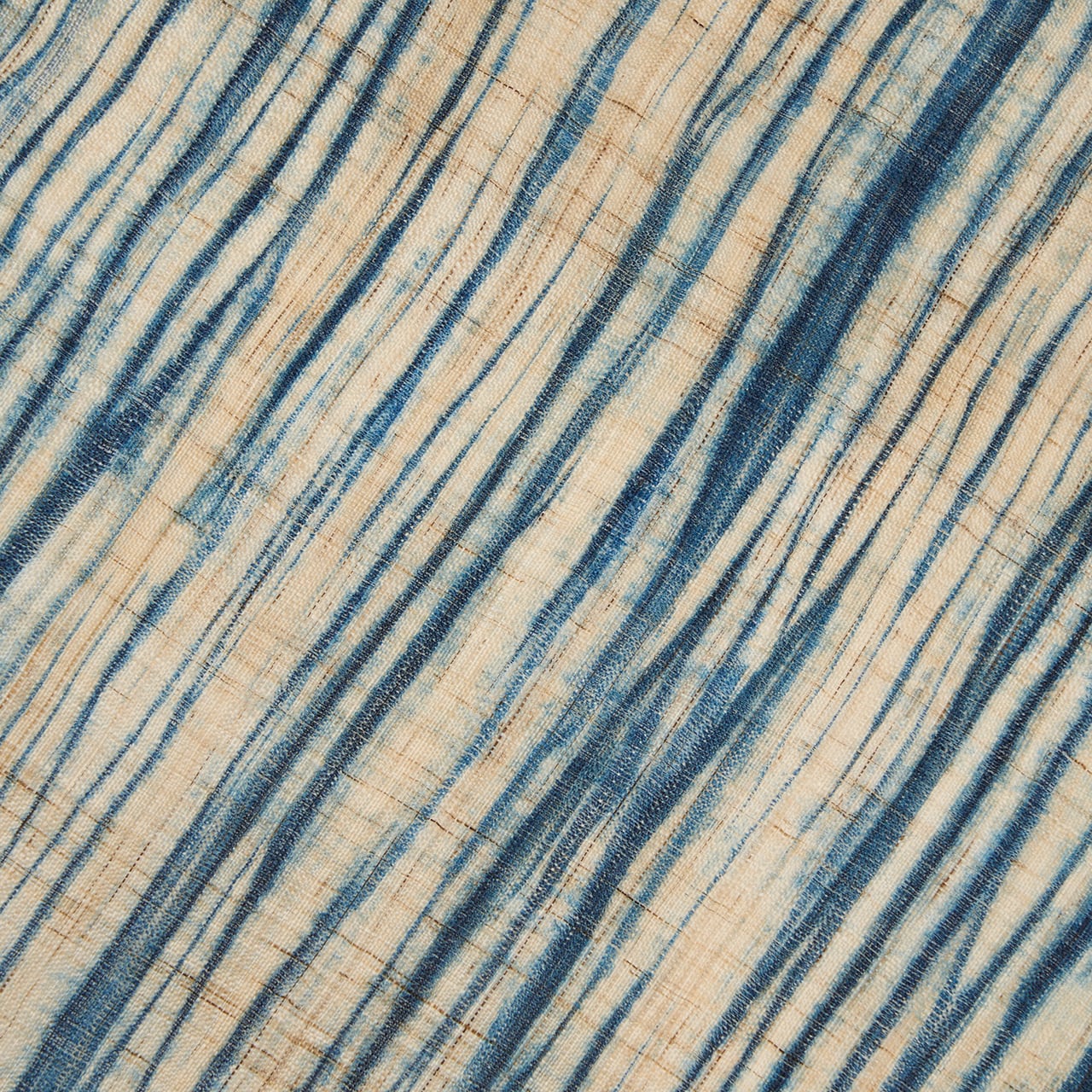 こちらは縫絞りではなく、大きな丸い台に布を巻き付けて、爪で生地を寄せてプリーツのようにして、藍甕で染色されたものですが、一見竜巻絞りのようでもあり、杢目のような面白い模様が現れた、素敵な帯となっています。
