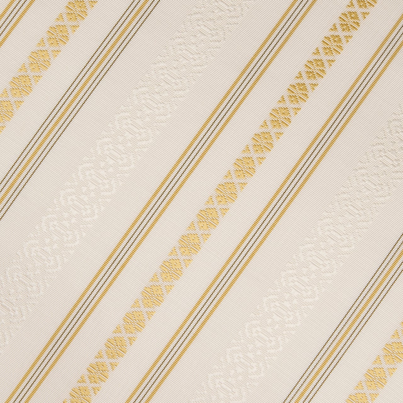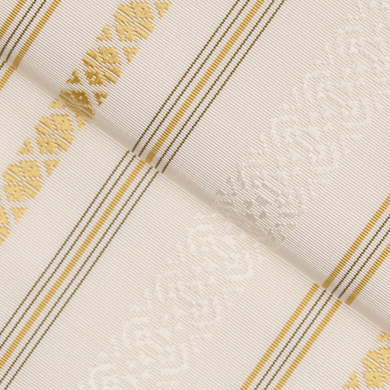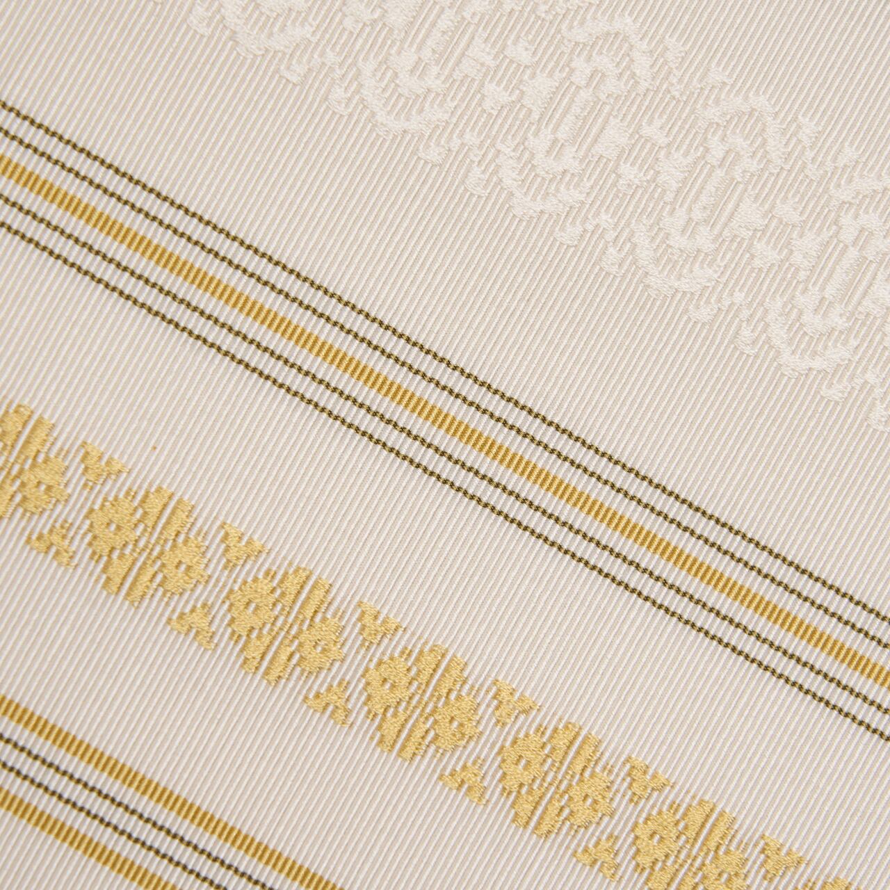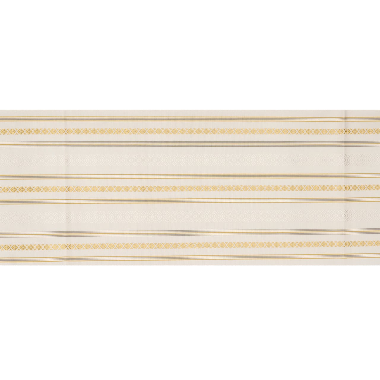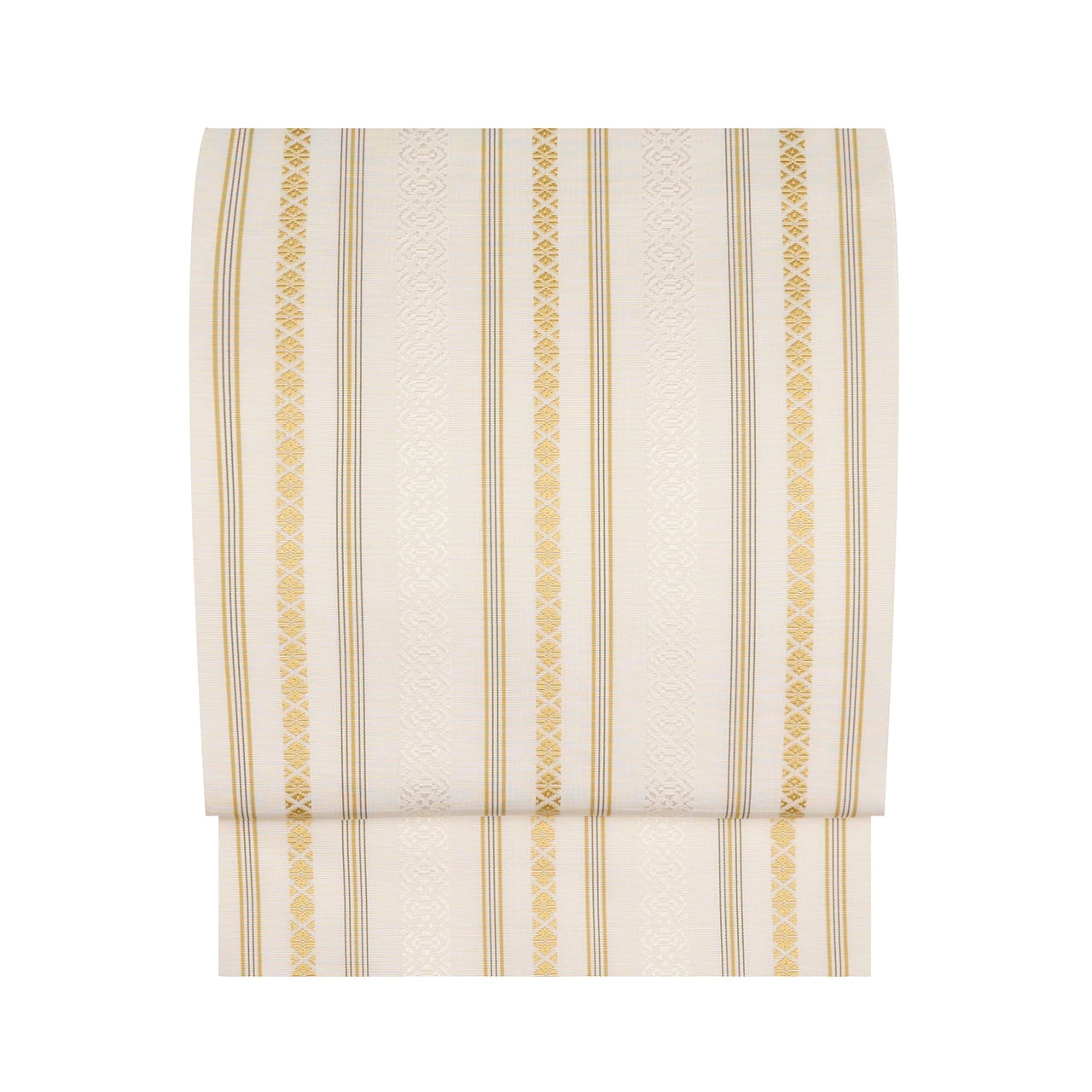 本場筑前博多織ならではのシャキッとした質感の象牙色の地に、黄色味の強い緑・青朽葉とくすんだ濃い鶯・鶸茶色の縞が織り出され、その間に博多織ならではの「独鈷」「華皿」などの模様が織り込まれた、伝統的な献上の模様の洒落た八寸名古屋帯です。