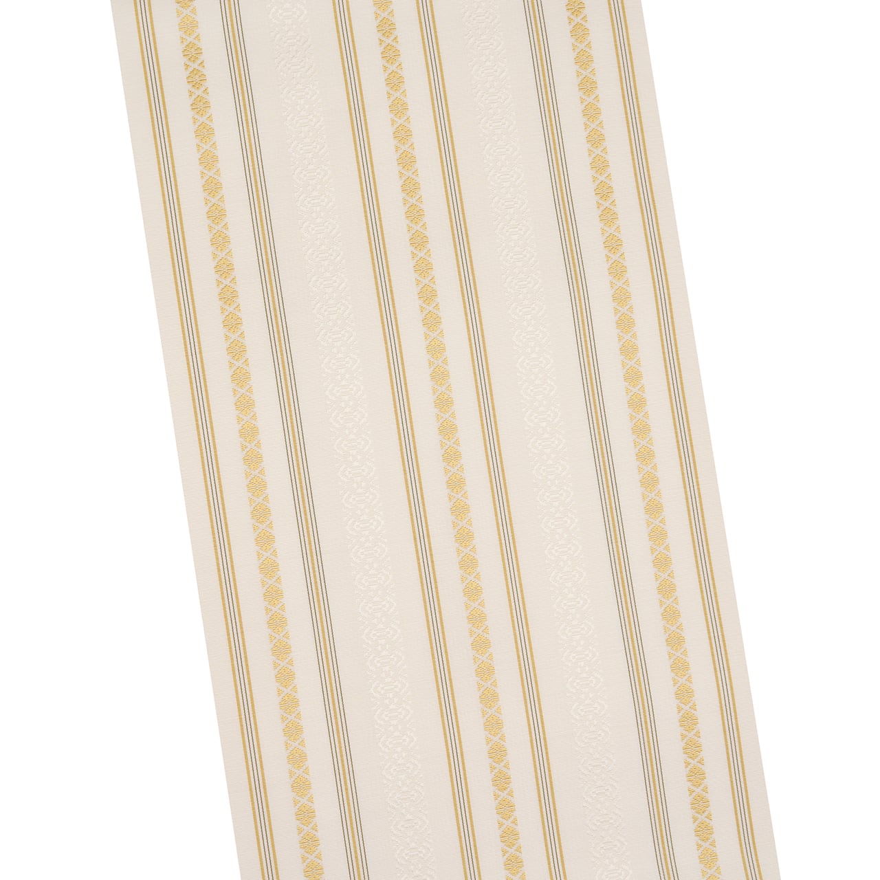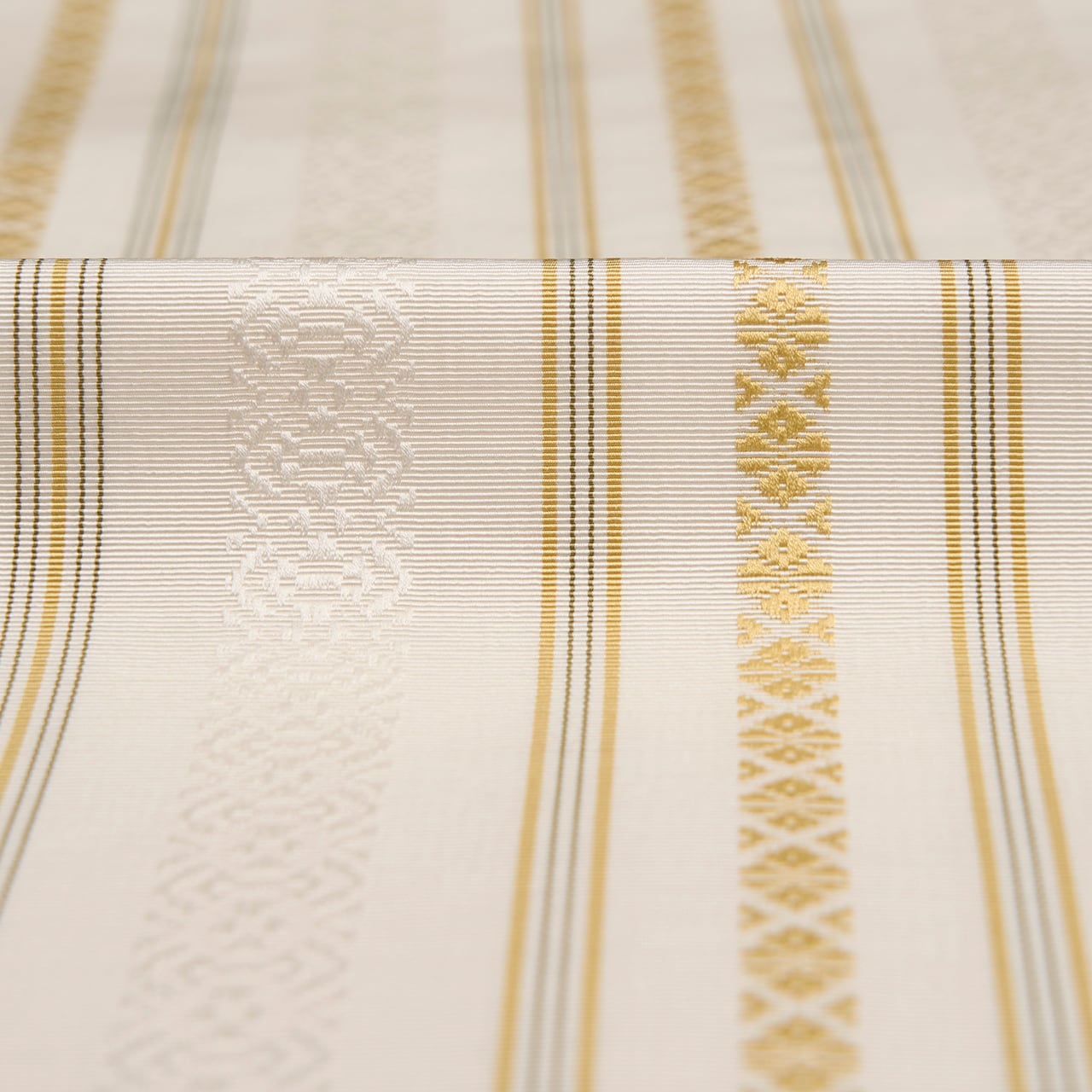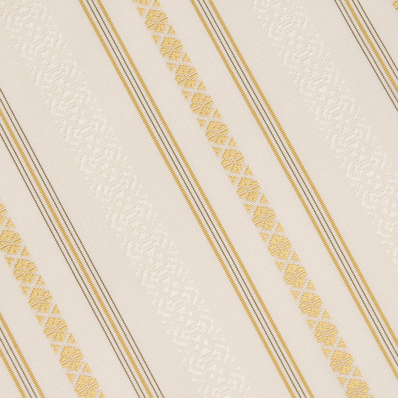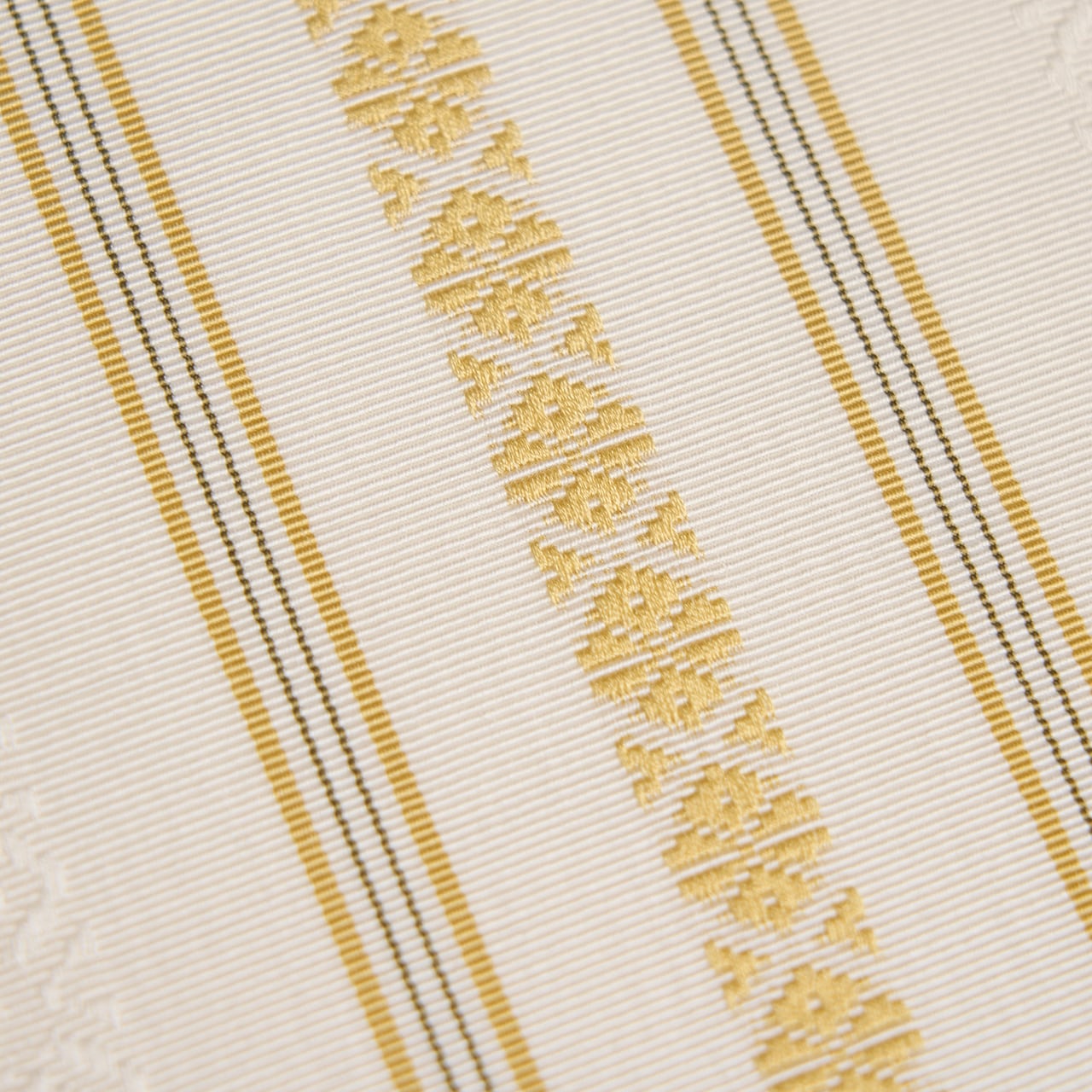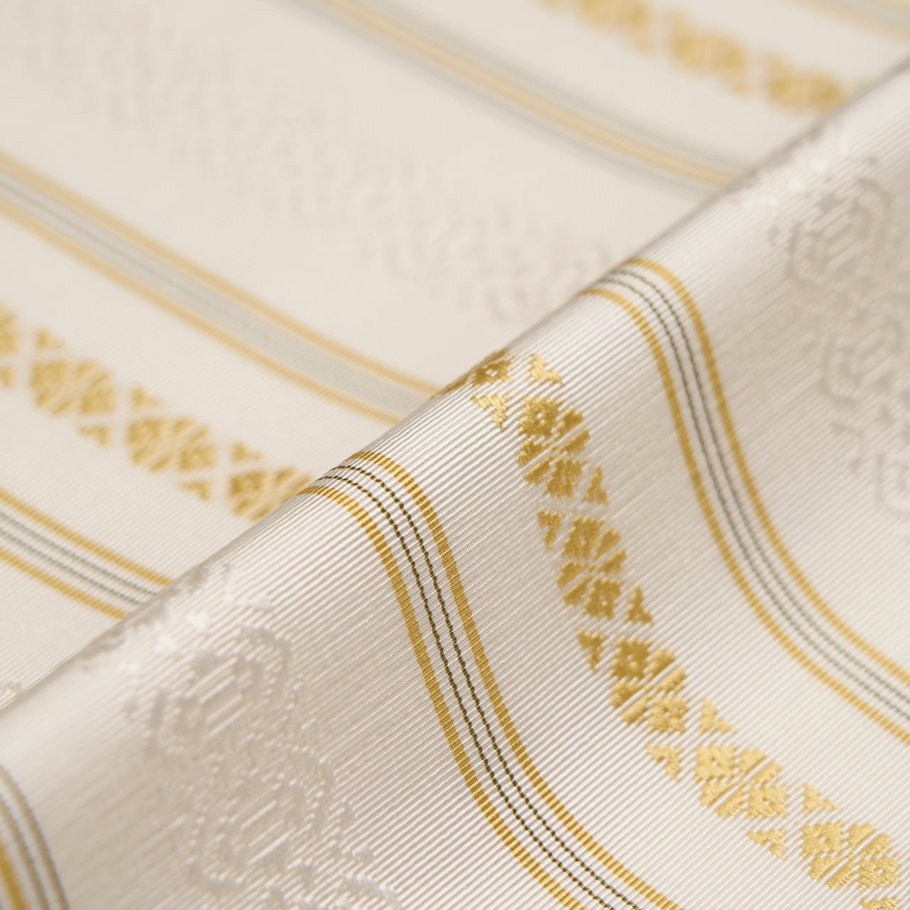 本場筑前博多織ならではのシャキッとした質感の象牙色の地に、黄色味の強い緑・青朽葉とくすんだ濃い鶯・鶸茶色の縞が織り出され、その間に博多織ならではの「独鈷」「華皿」などの模様が織り込まれた、伝統的な献上の模様の洒落た八寸名古屋帯です。